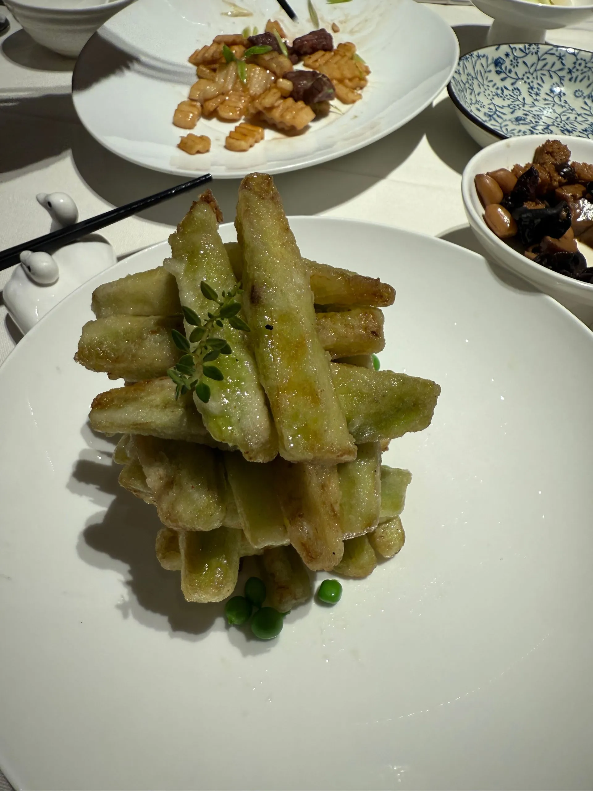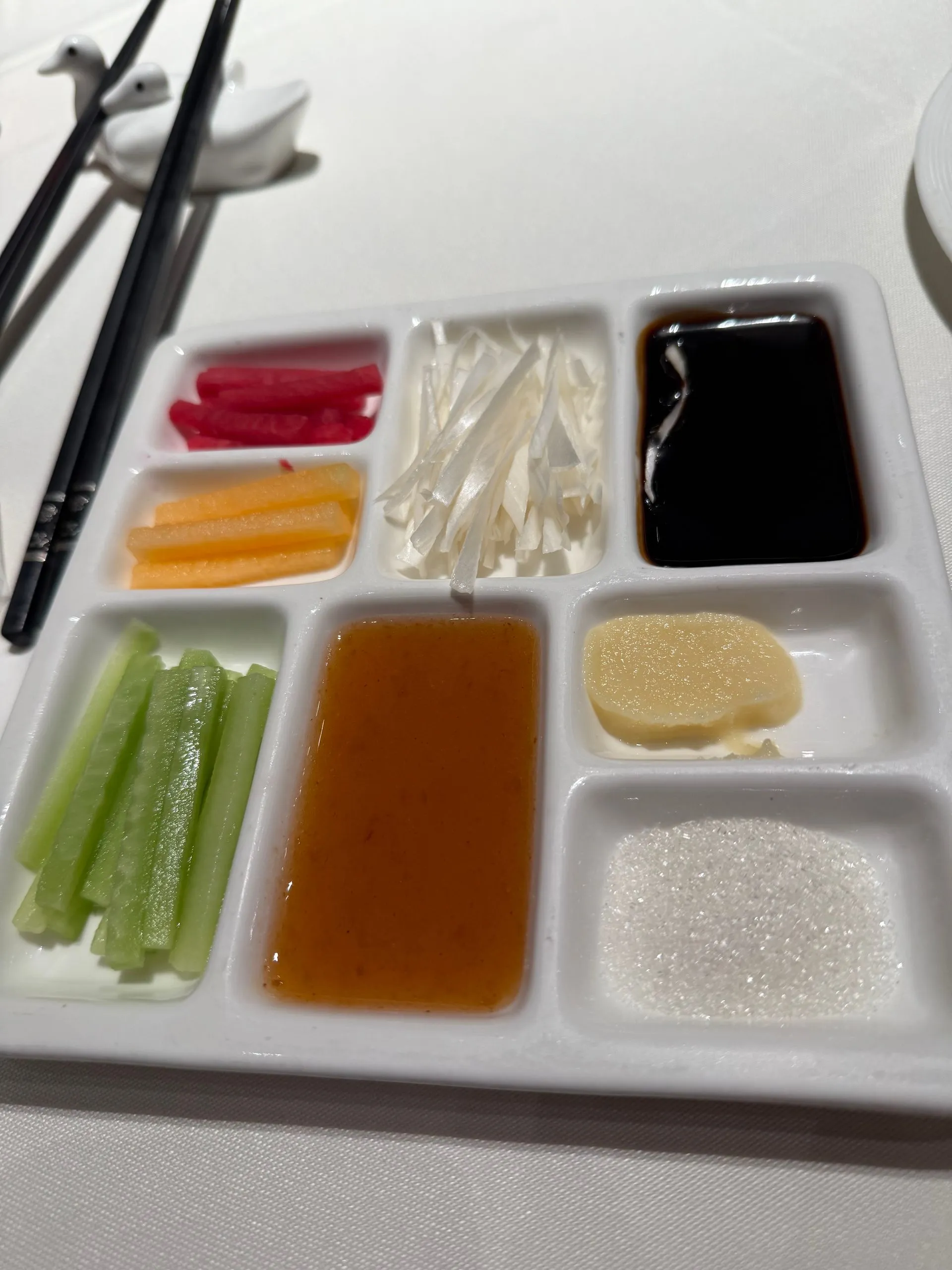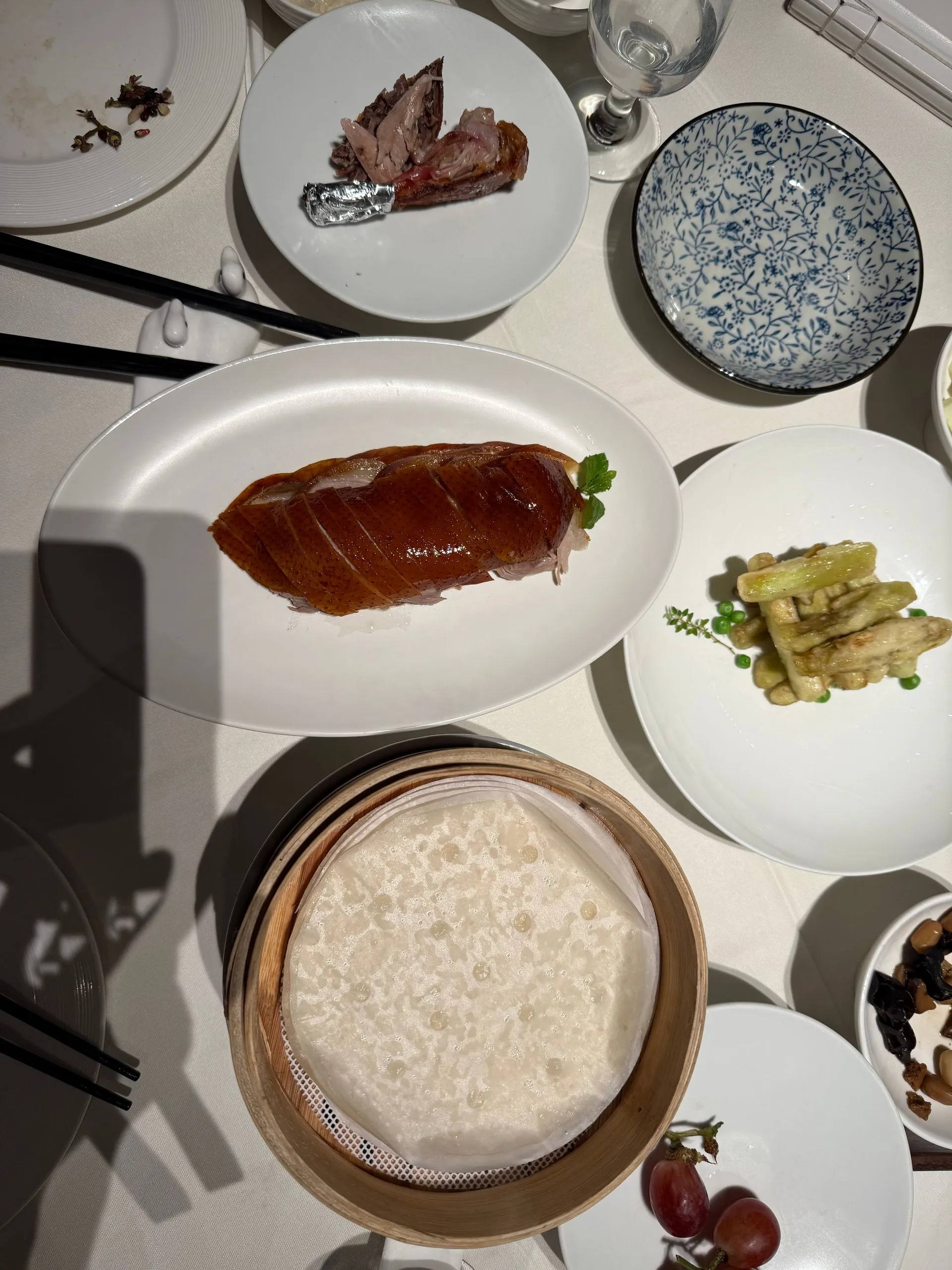There are several well known Peking Duck specialty restaurants, we went to Siji Minfu. They bring you appetizers of spicy cucumbers, grapes and baked bran with mushrooms and peanuts - tasty! Then comes the roast duck carved table side with it crispy skin. You put duck in super thin pancakes with slices of cucumber, scallions, melon and sprinkle of sugar with plum sauce. Wrap like small burrito and SO YUMMY !! We also enjoyed a side of crispy baby eggplant.