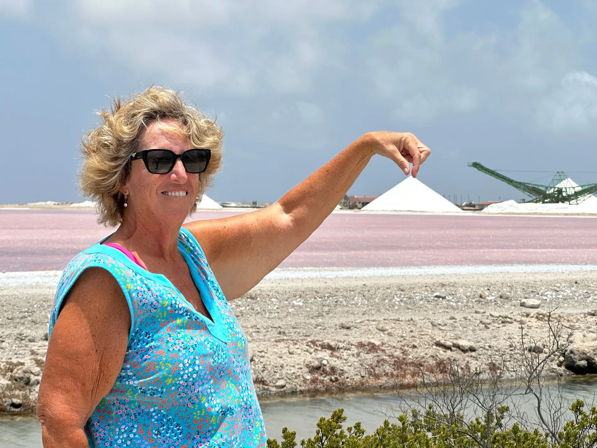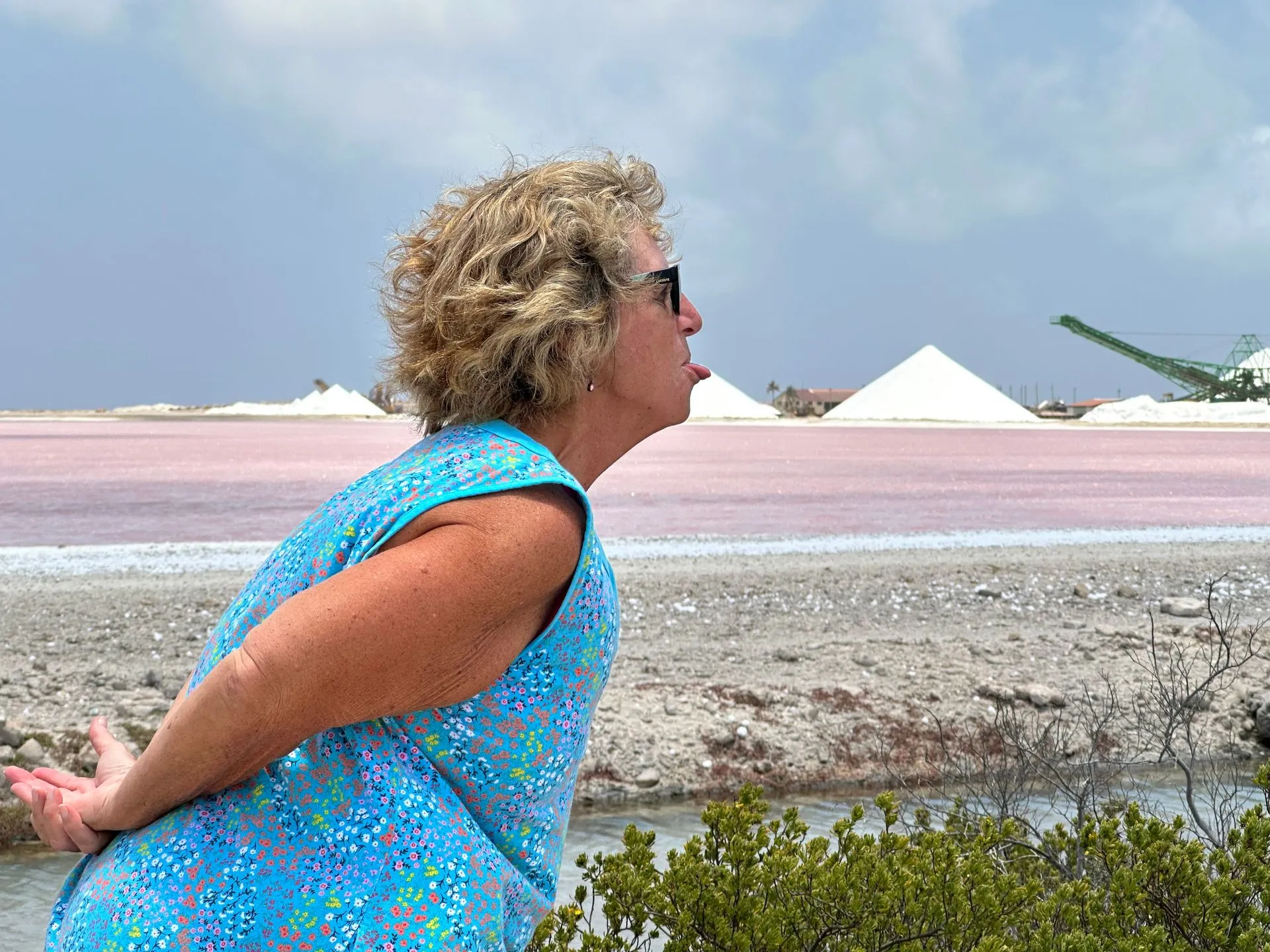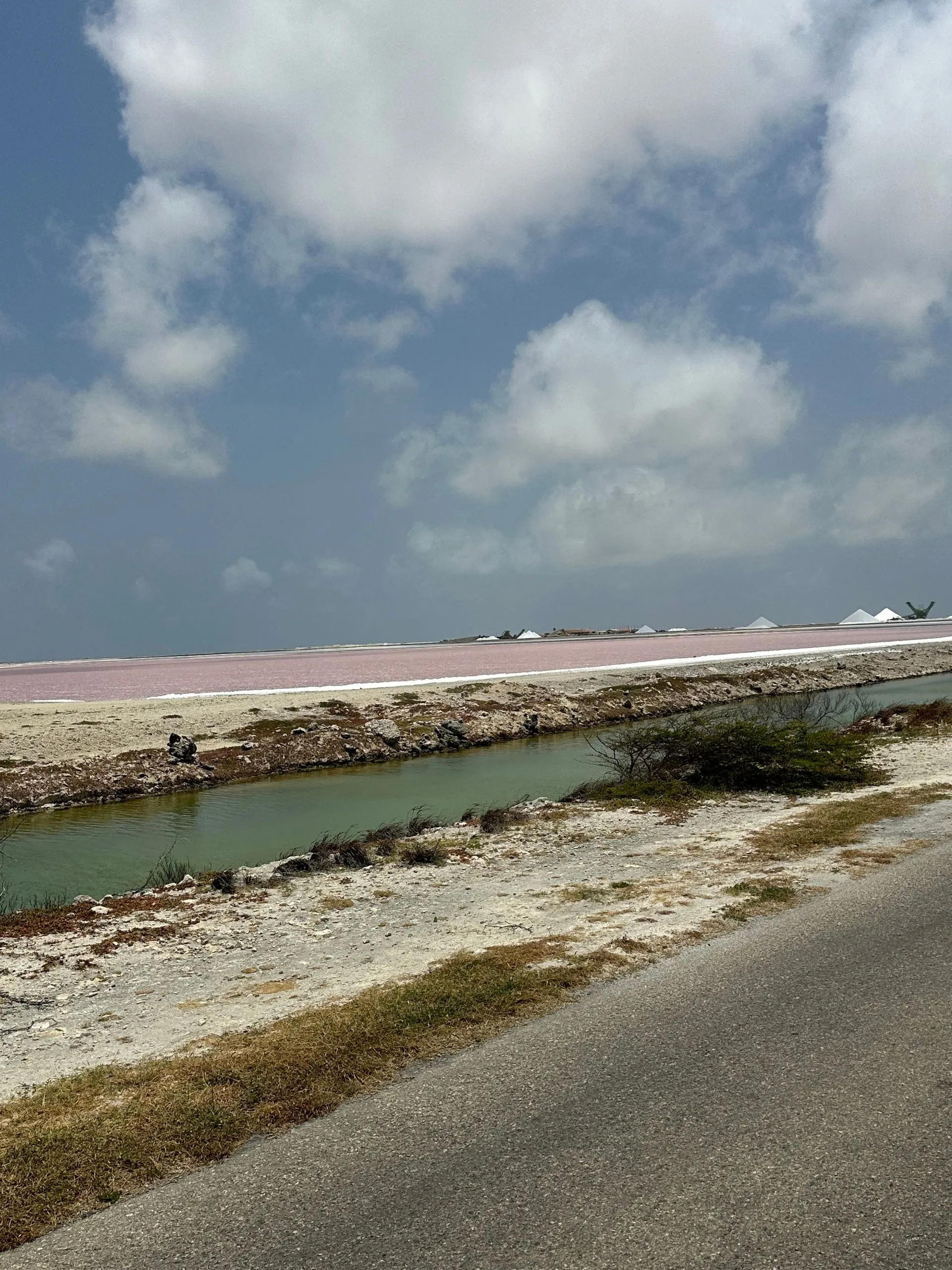 View from one of high spot in the center of island looking out toward port. Island very dry and arid with lots of divi trees bent over in the winds and two types of cactus - one edible and the other poisonous ( used to build fencing). The Miller's and I did a private van tour around the island and then we ended tour at a beach for a couple hours R&R. Our fabulous driver/ guide came back and picked us up and concluded tour back to port and gave us each a gift ( Bonaire magnet). She was super! Below are slat fields - a big industry for Bonaire - harvested every March. Salt shimmers in sun as the water evaporates in the pools.