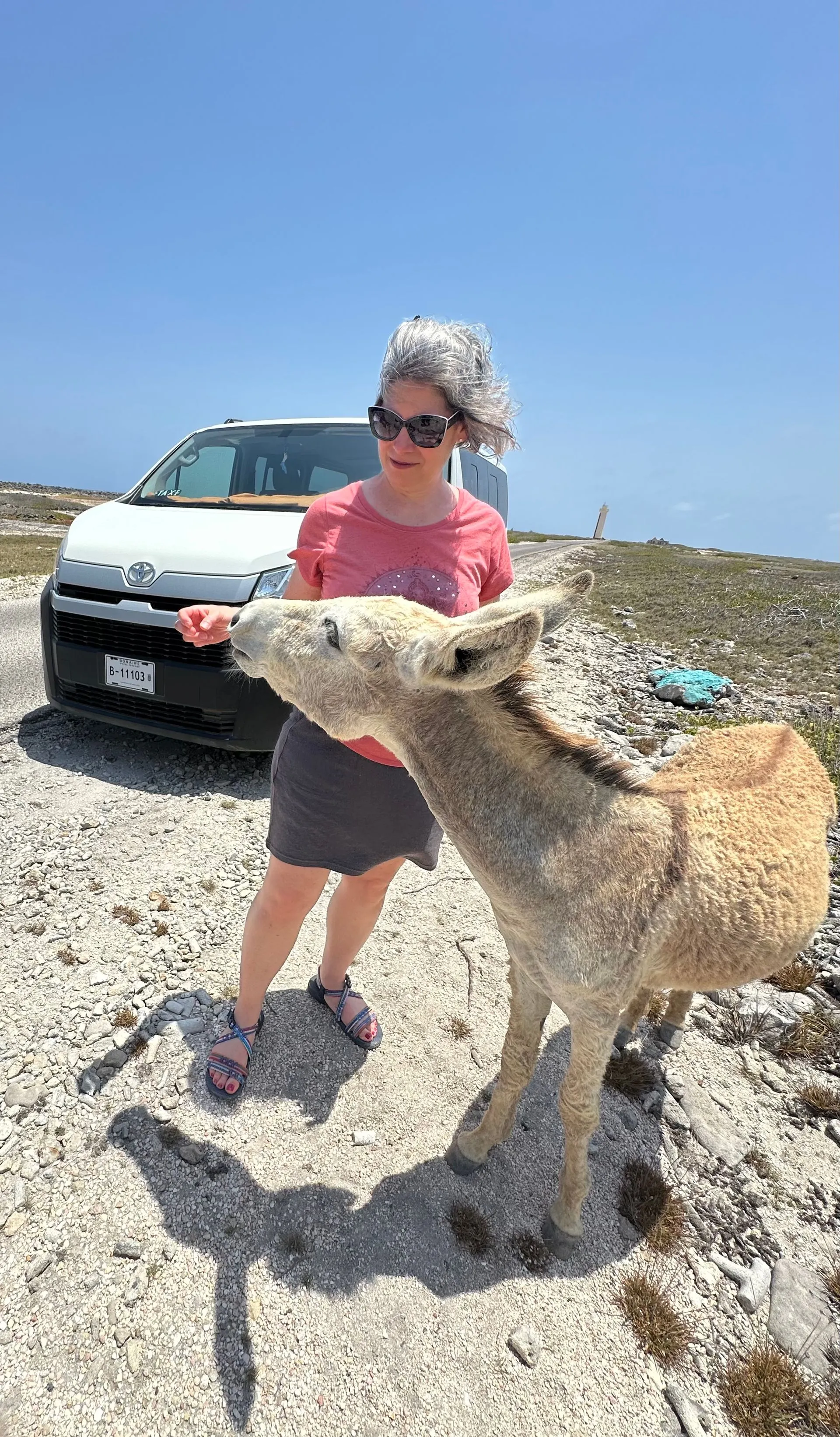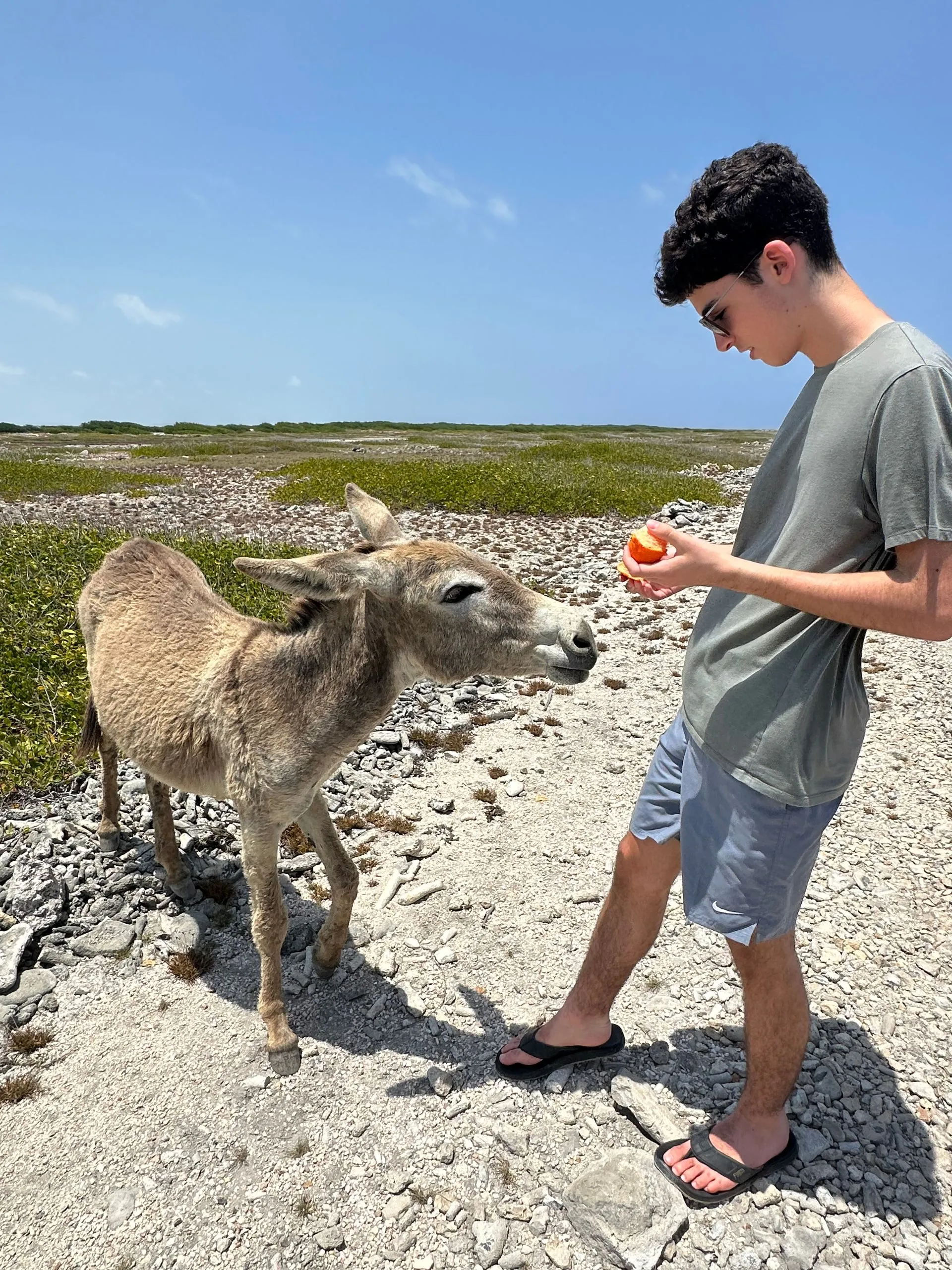Wild donkeys live along south end of island, near the open stretch around the Light House.Our guide brought us oranges to feed the donkeys.