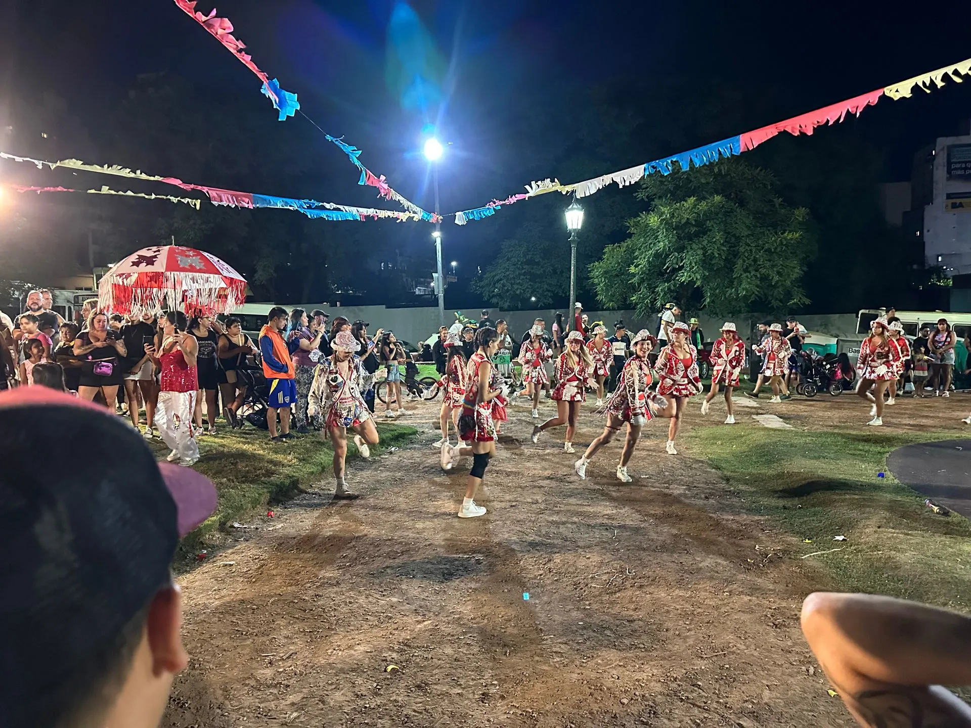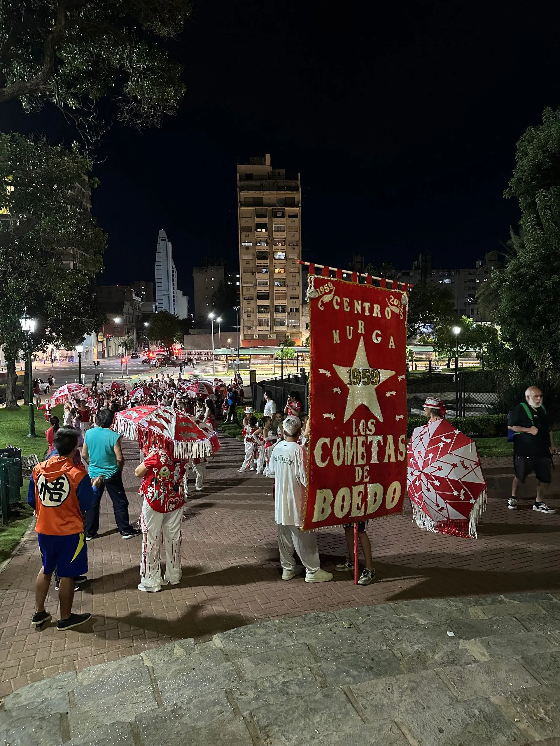 Carribean 7 group - left to right Sarah, Scott, Me, Jimbo, Anna, Sheri, Mirta ( Bob's friend - was an exchange student in high school ) & Bob. Enjoying a Argentine Steak Dinner at Villegas. After dinner we went to a neighborhood Carnival band performance in a local park. Five neighborhood groups performed. We caught the tail end of the last 2 groups. A good taste of what is come in Rio.