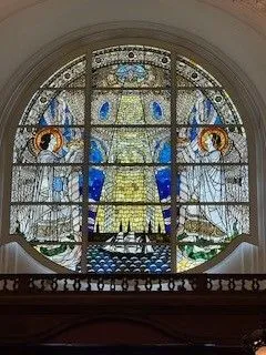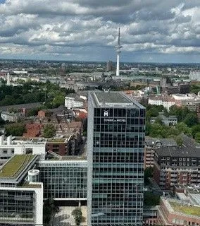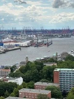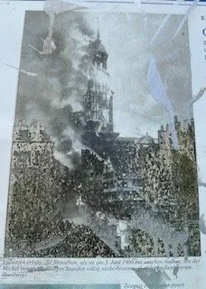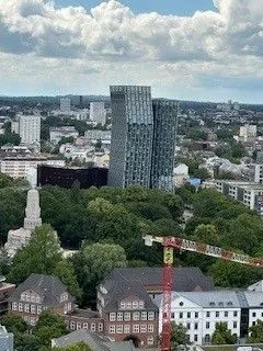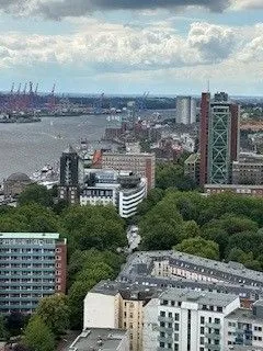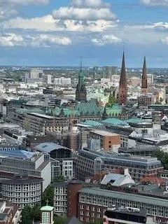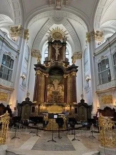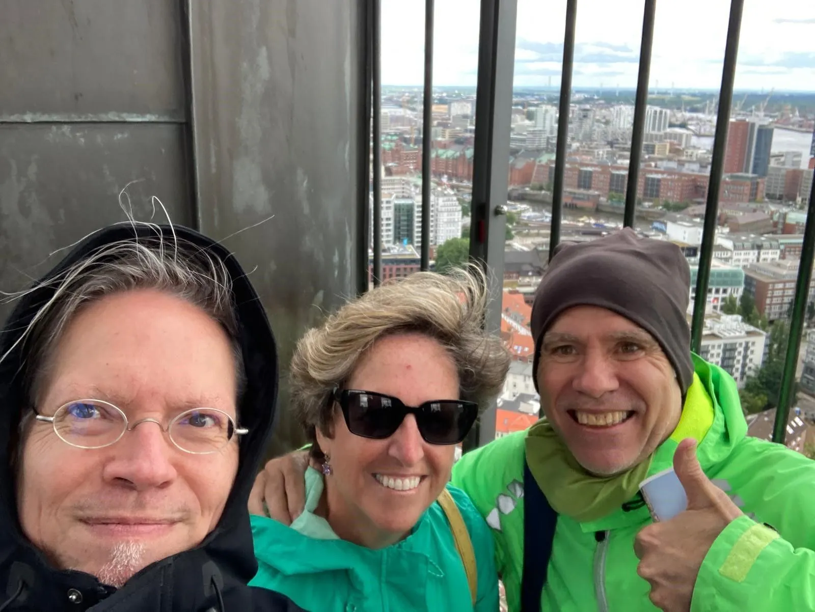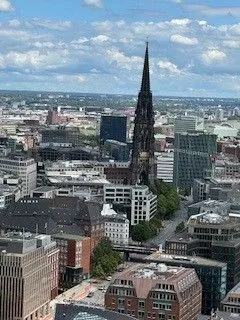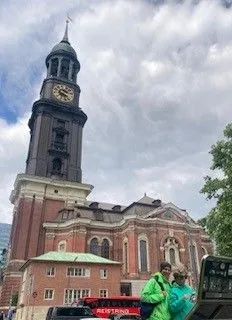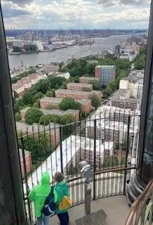 Tom and his boyfriend Stephan gave me the Iconic Hamburg tour on Saturday. Hamburg is known as an important port city, but it is not right on the North Sea, it is accessed via the Elbe River. The above are taken from steeple overlook of the landmark ,18th Century, St. Michael's Church. It was super windy, es ist windig, at the top, but the views were worth it. The church was originally built in 1648 but destroyed by lighting, in 1750. It was rebuilt in 1751 to 1762 and destroyed a second time by fire in 1906! This third church was rebuilt from 1907 to 1912 and has a building restoration going on now with the campaign for "heavenly helpers" and golden hardhats on their statues that fade in and out of vision, depending on the angle you look at them. Clever!