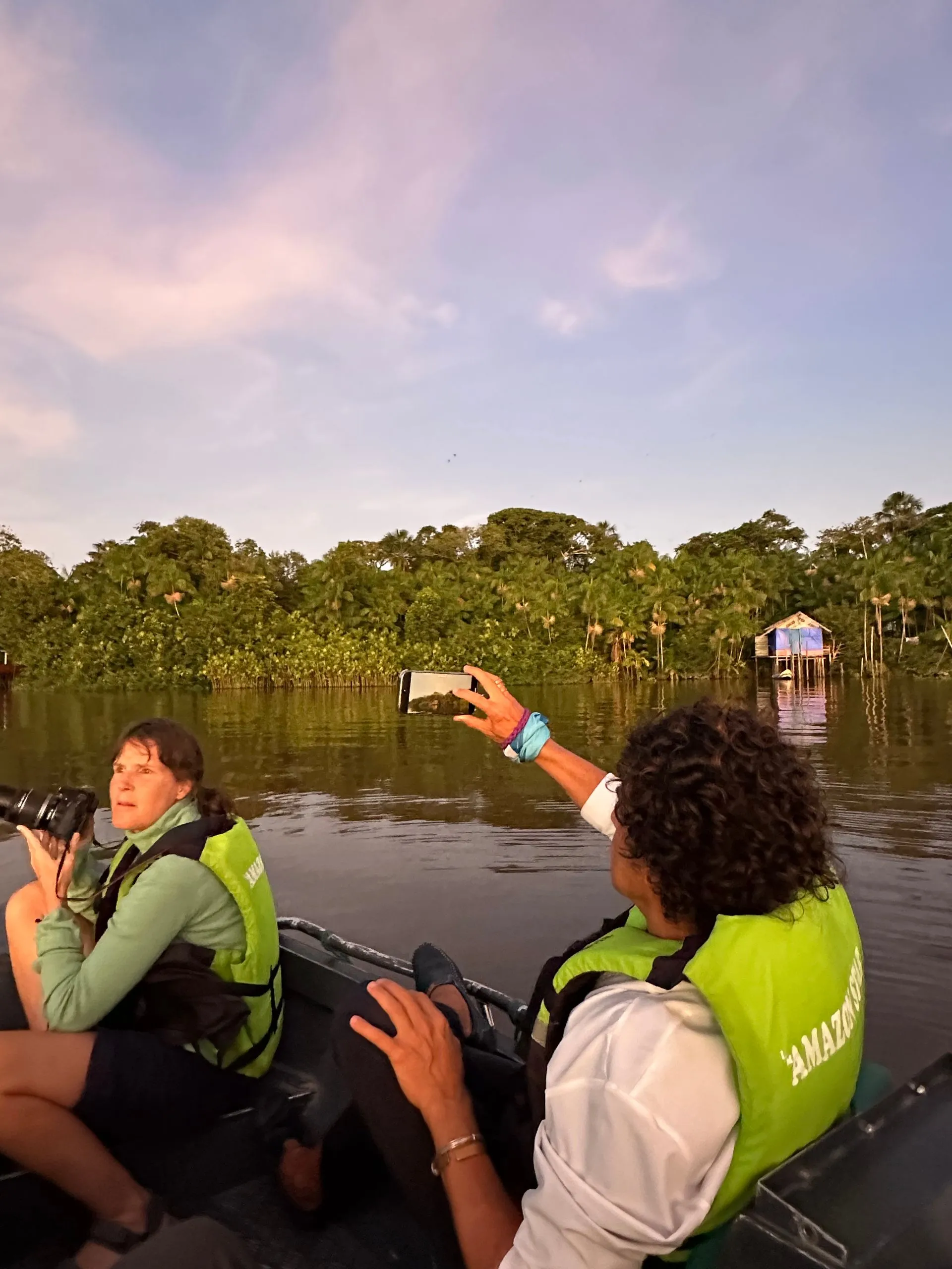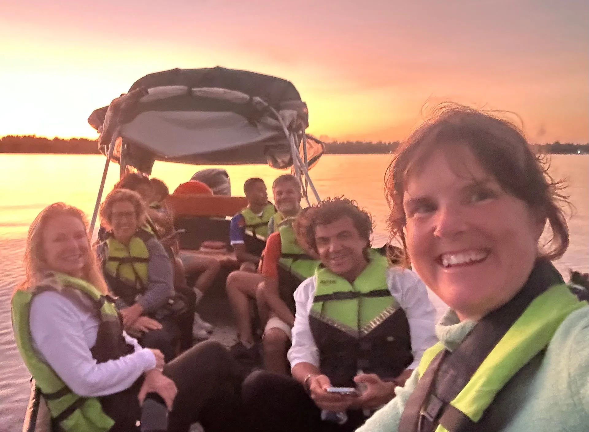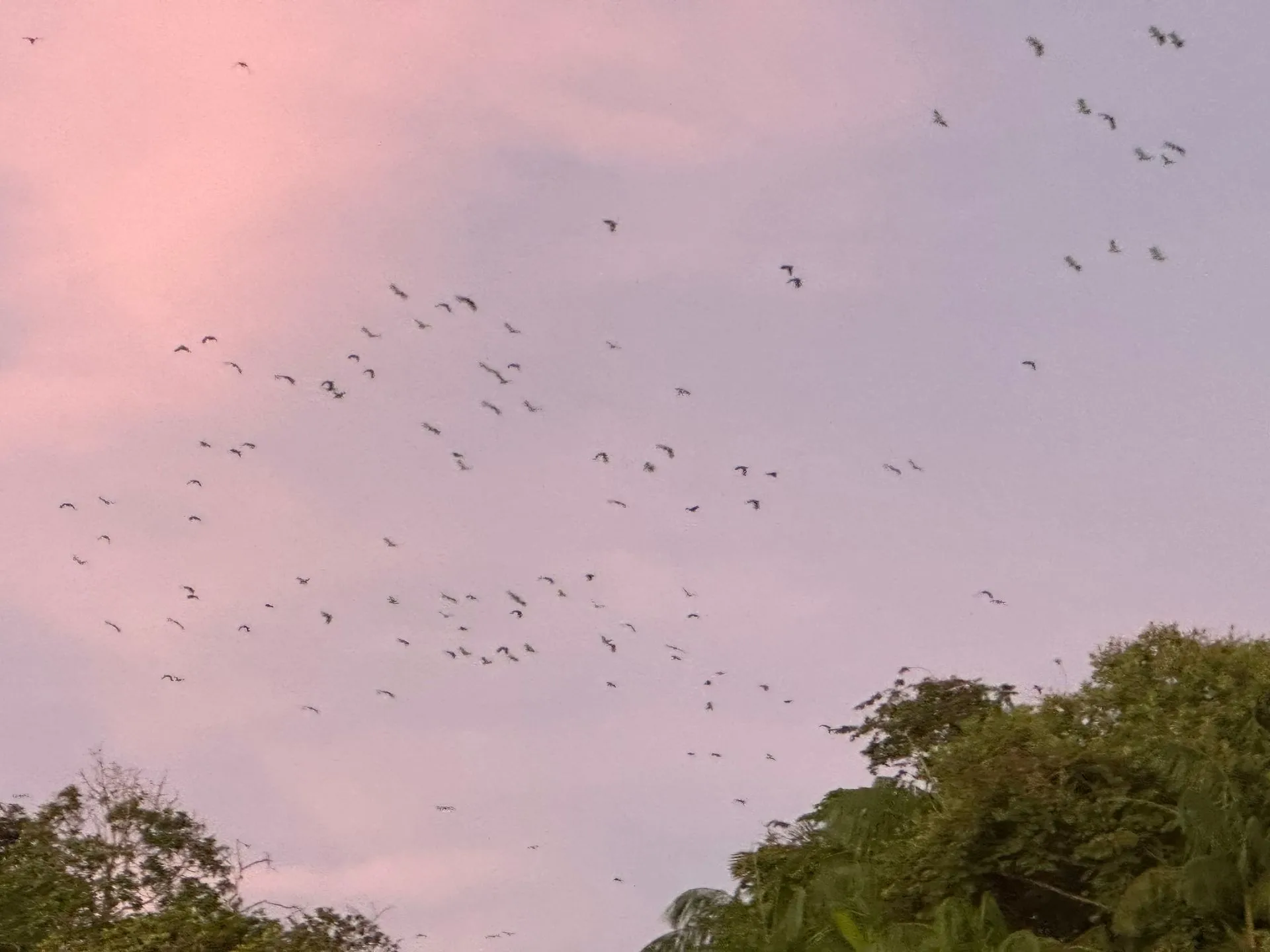 OH WHAT A SHOW WE SAW!! The photos don't do justice to the experience. First off, you hear the noise before you see anything. It comes in waves, as 100's of Mangrove Parrots wake up and start squawking. Our guide explained parrots mate for life and the female does the picking. So you see 2 birds flying together as a couple, 3 birds is a female testing out 2 males, and the balance of 4 through 8 size groups are families where the kids are just learning to fly the distance and many times can't make it - so the whole family comes back and they go on to plan B. The morning light is magical! Five of us from ship part took - Silja, Memo, Callie Scott & Myself along with 2 college grads from London.