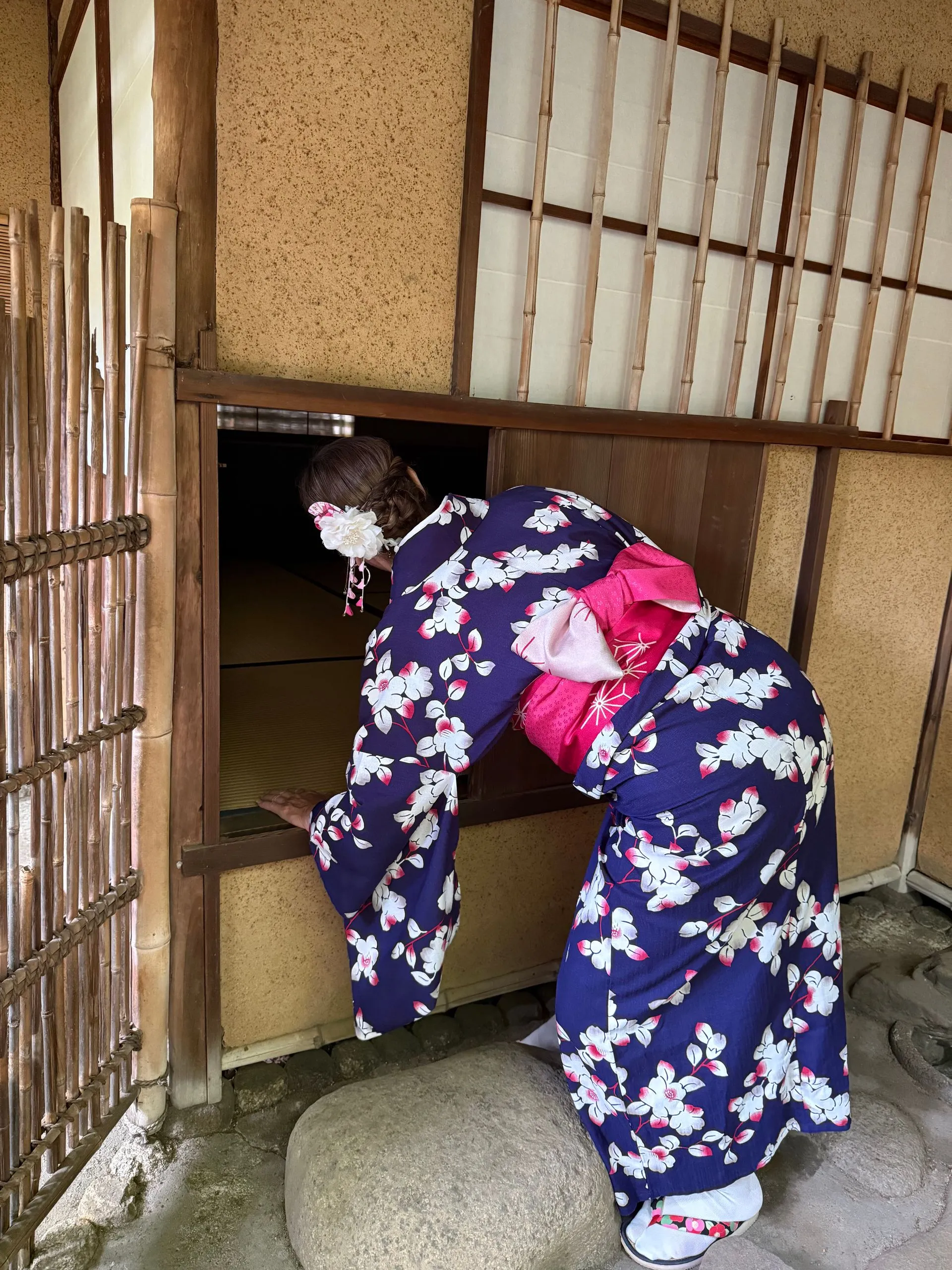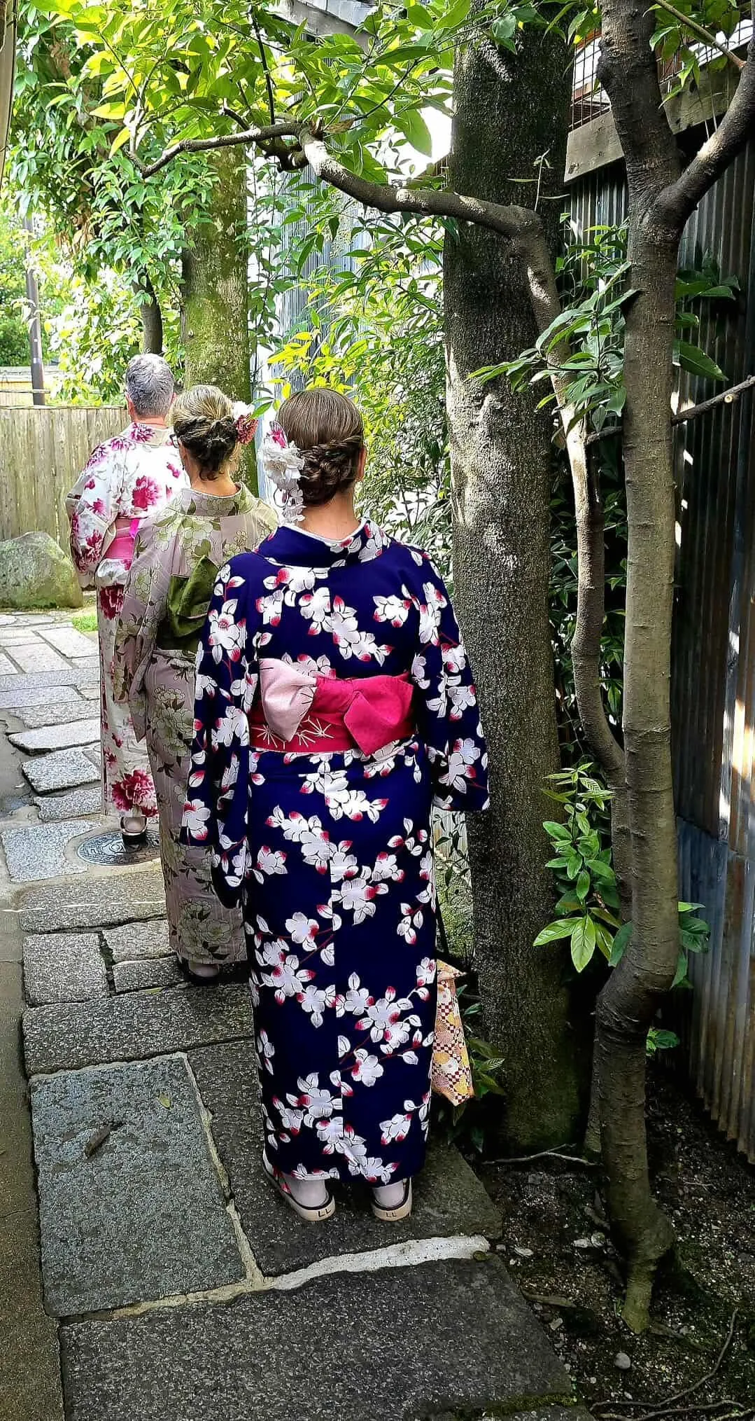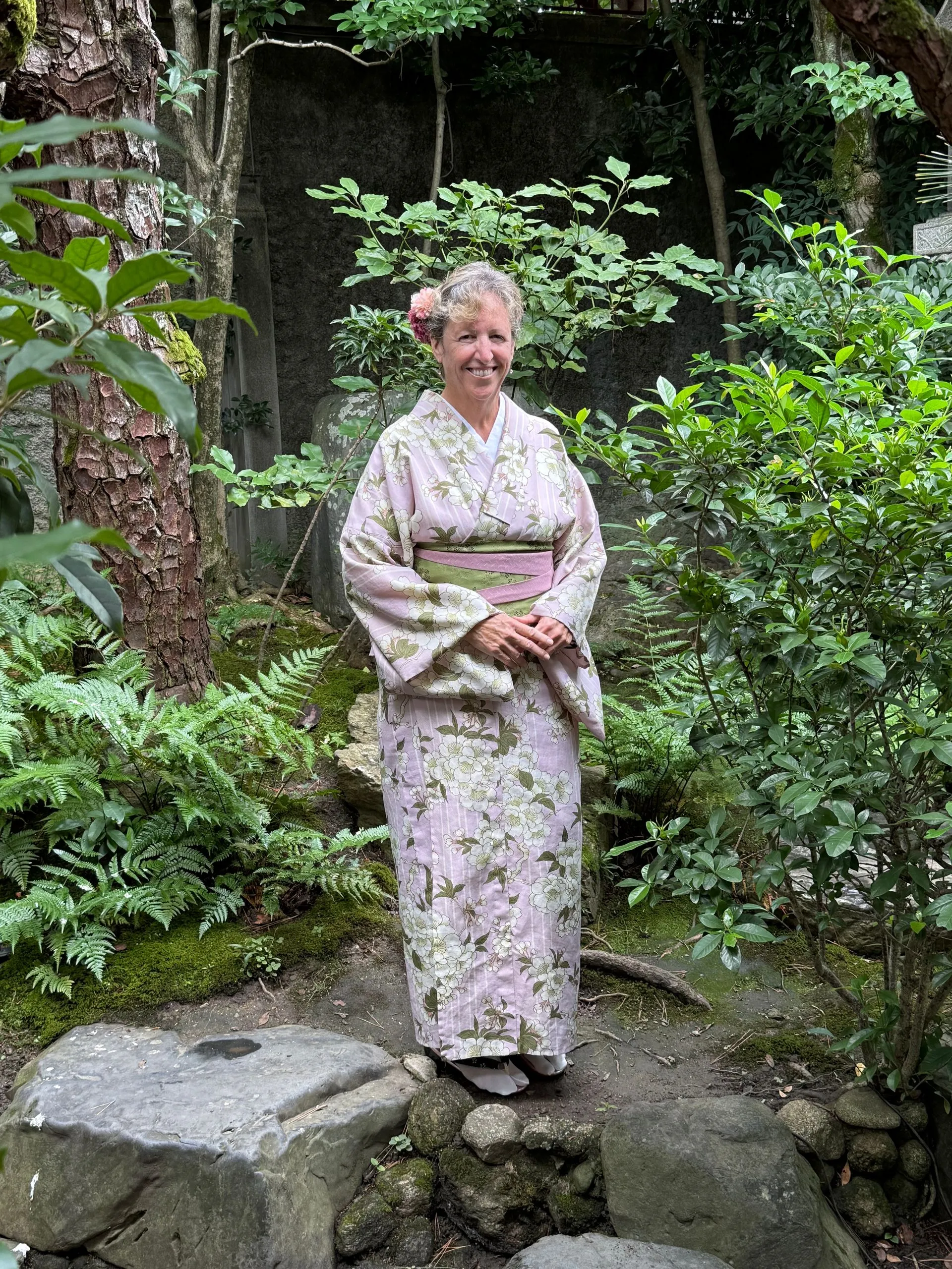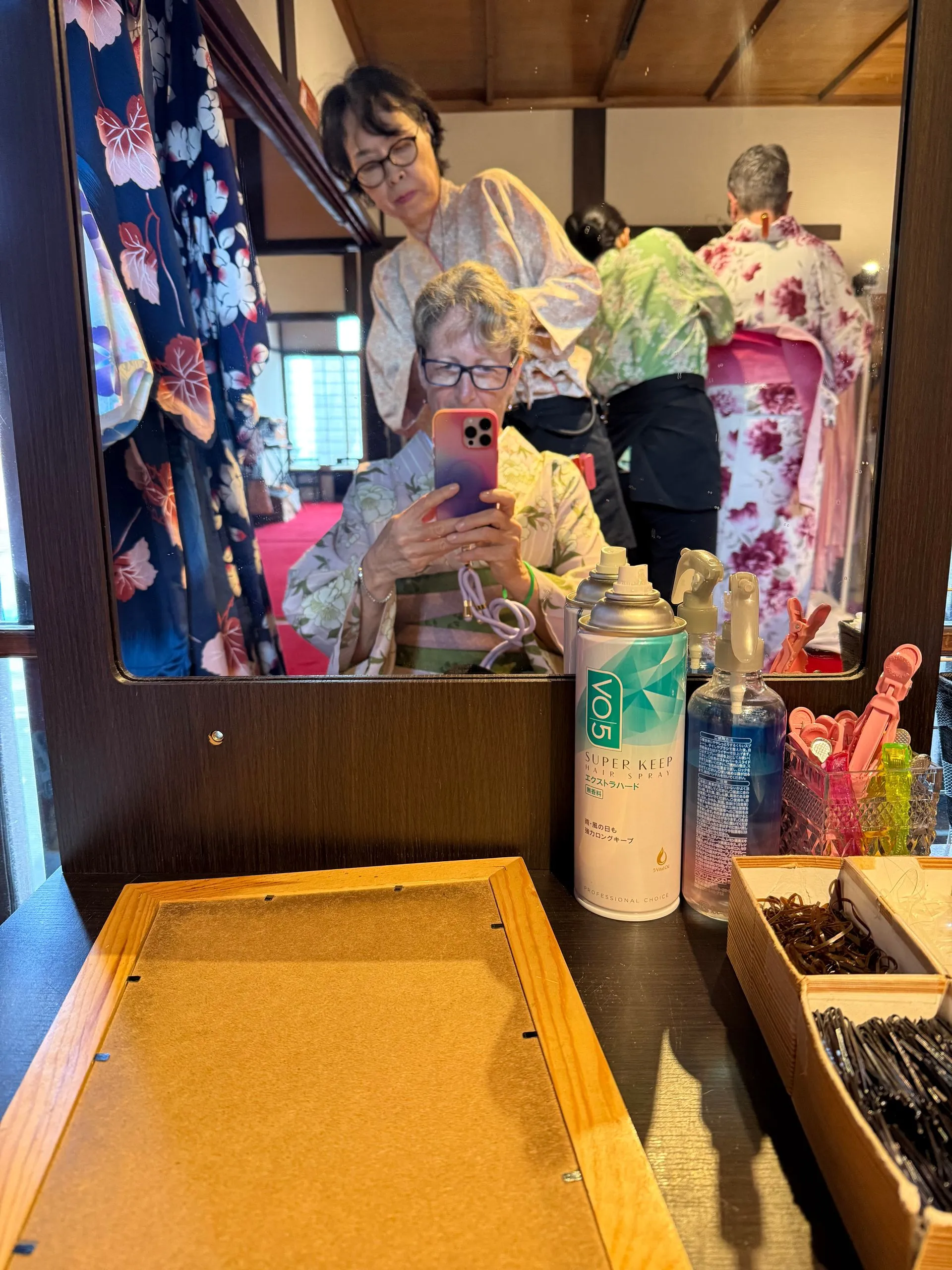 What a fun morning we had! We went to an authentic tea house in Gion, the older section of Kyoto. We all got dressed in Kimonos complete with hair, socks and shoes. The staff are amazing and efficient & like ninjas with bobby-pins. They whipped our hair into updo's in no time! They also pulled, lifted, folded and tucked us neatly into those Kimonos with several fabric belts. Once we were all dressed, we went into a sliding screen Tea Room and met our hostess. She did brief introductions and asked us a bunch of, get to know you questions. The 5 of us Seniors were in with 6 other - 3 young couples - who all kneeled on the floor, while the 5 of us had mini chairs, to sit in! The tea service was very interesting and took about an hour. Then we could go out into the gardens and take photos. We had a lot of fun coming up with unique poses to highlight our inner geisha's!