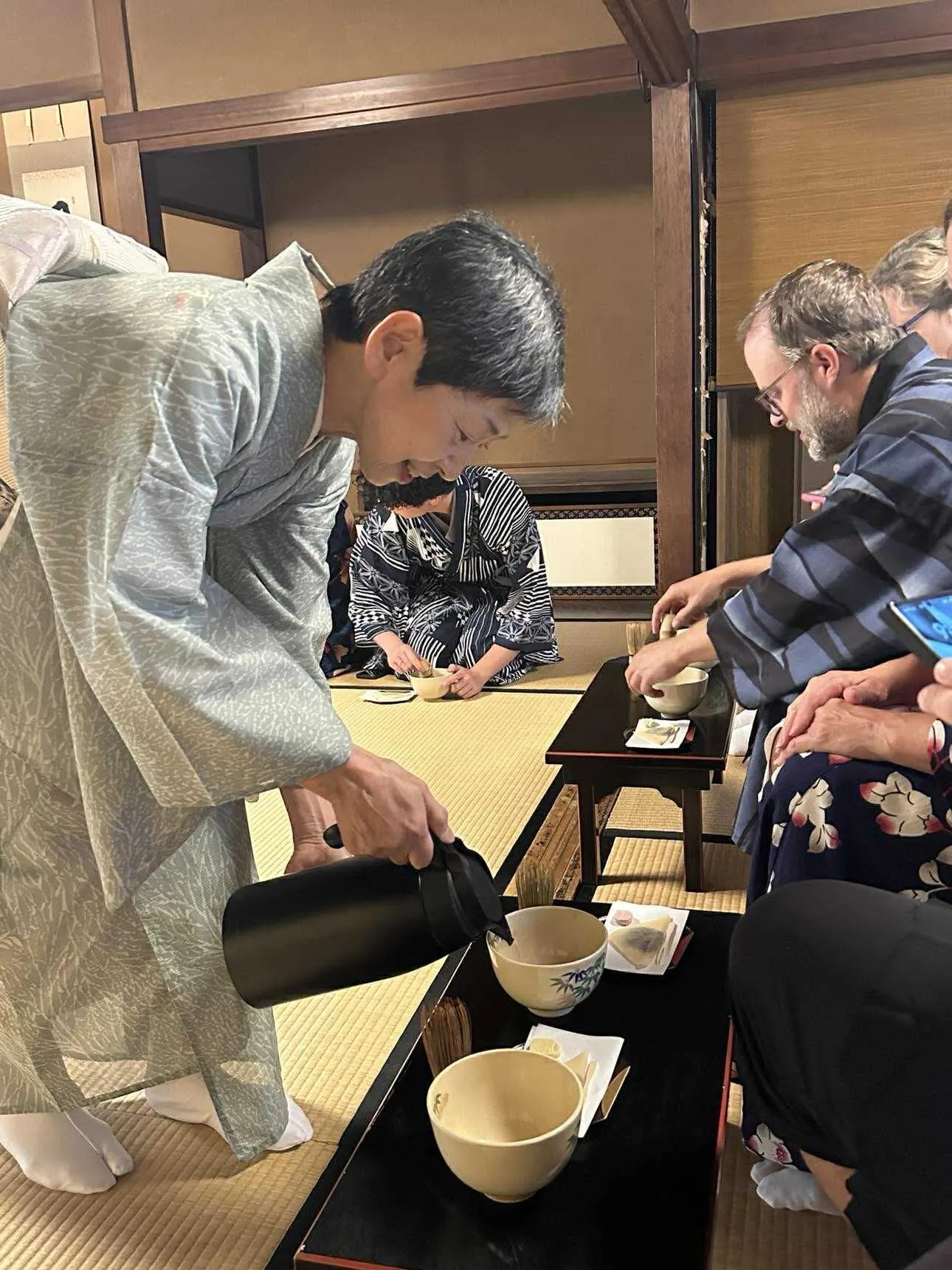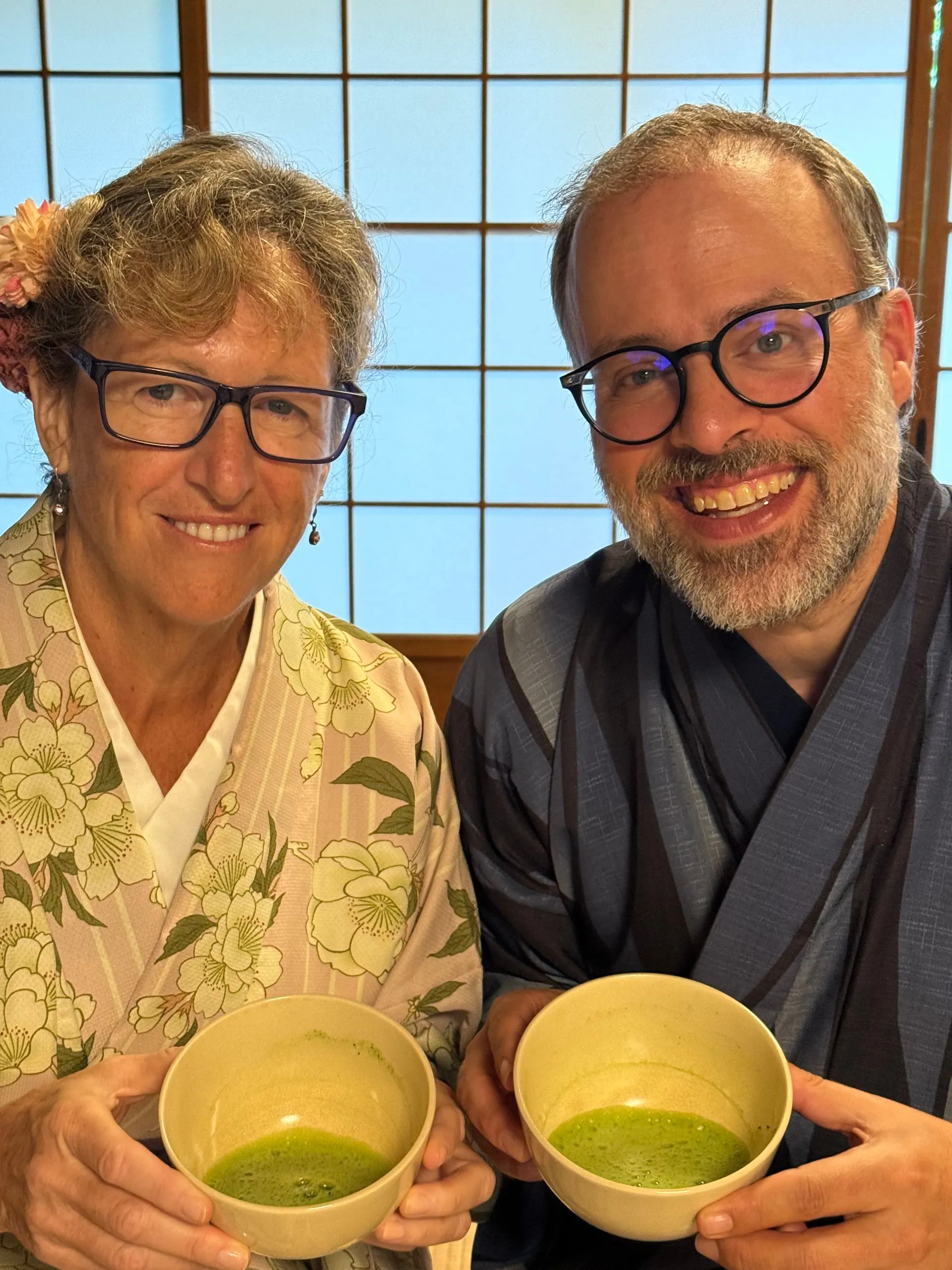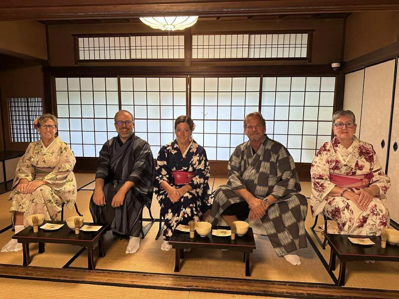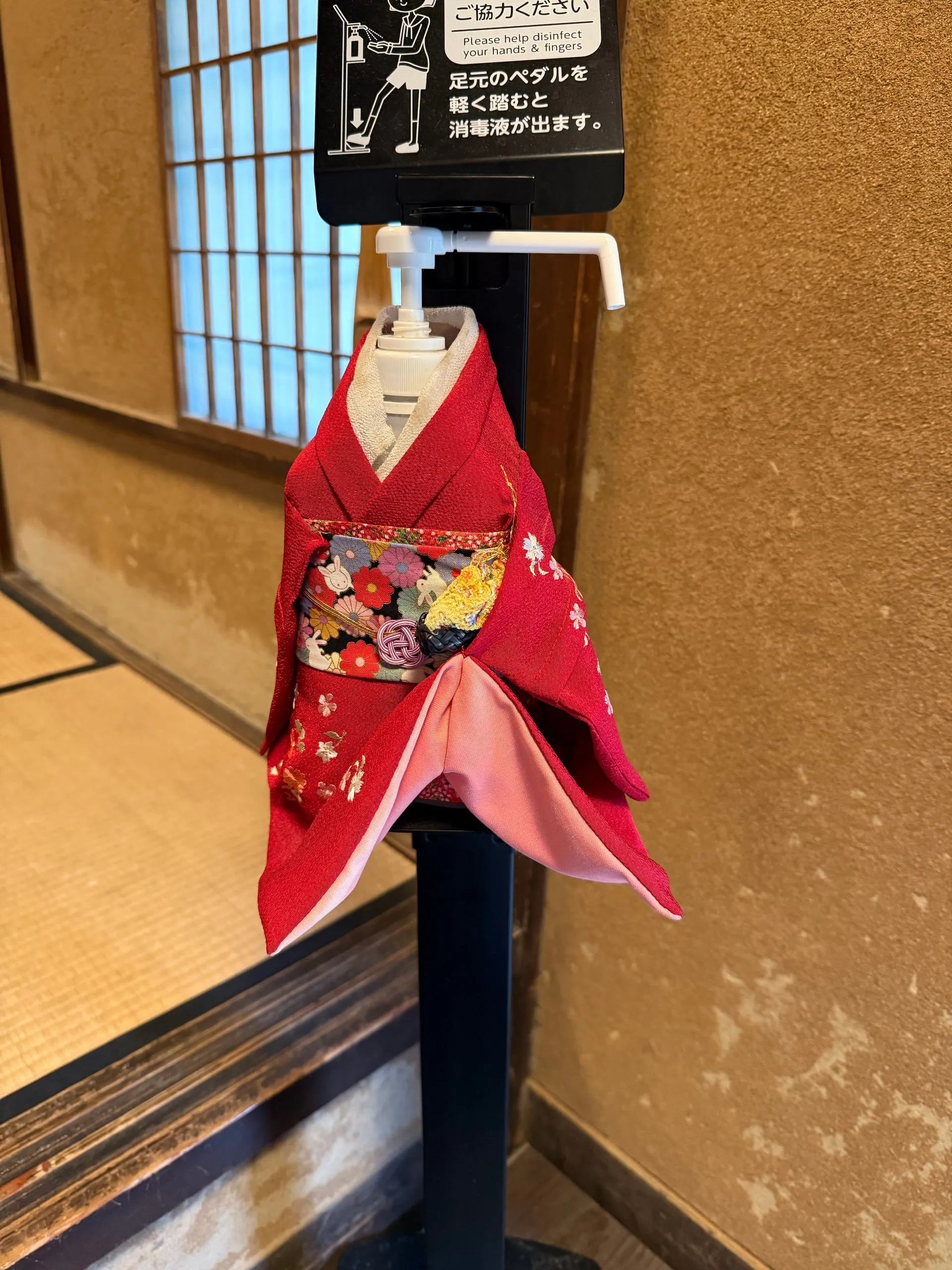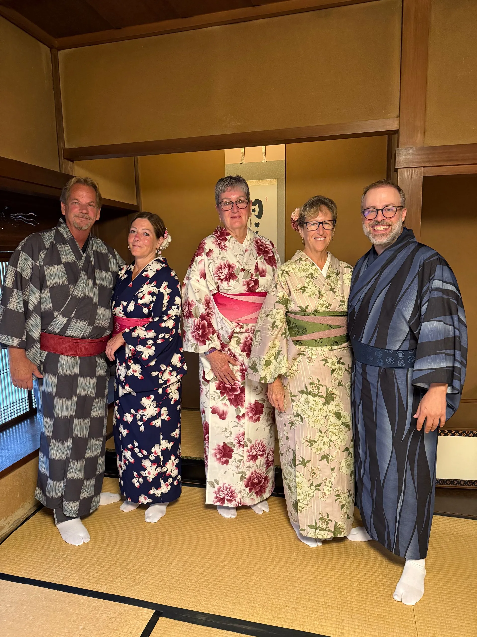 What a fun morning we had! We went to an authentic tea house in Gion, the older section of Kyoto. We all got dressed in Kimonos complete with hair, socks and shoes. The staff are amazing and efficient & like ninjas with bobby-pins. They whipped our hair into updo's in no time! They also pulled, lifted, folded and tucked us neatly into those Kimonos with several fabric belts. Once we were all dressed, we went into a sliding screen Tea Room and met our hostess. She did brief introductions and asked us a bunch of, get to know you questions. The 5 of us Seniors were in with 6 other - 3 young couples - who all kneeled on the floor, while the 5 of us had mini chairs, to sit in! The tea service was very interesting and took about an hour. Then we could go out into the gardens and take photos. We had a lot of fun coming up with unique poses to highlight our inner geisha's!