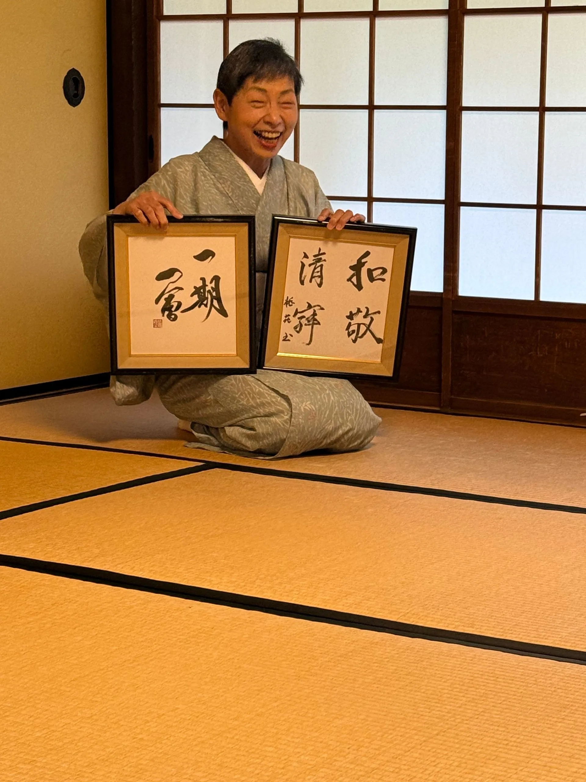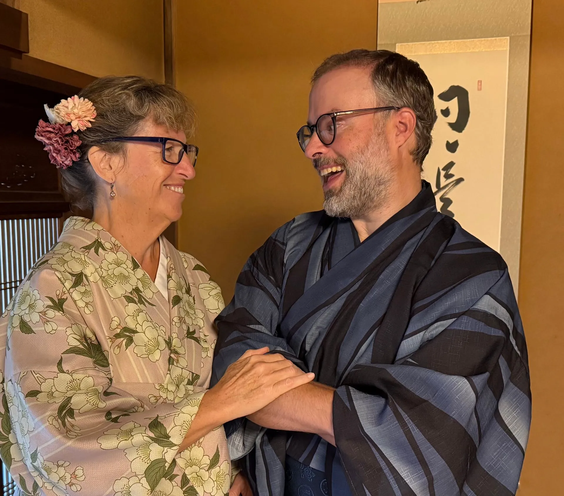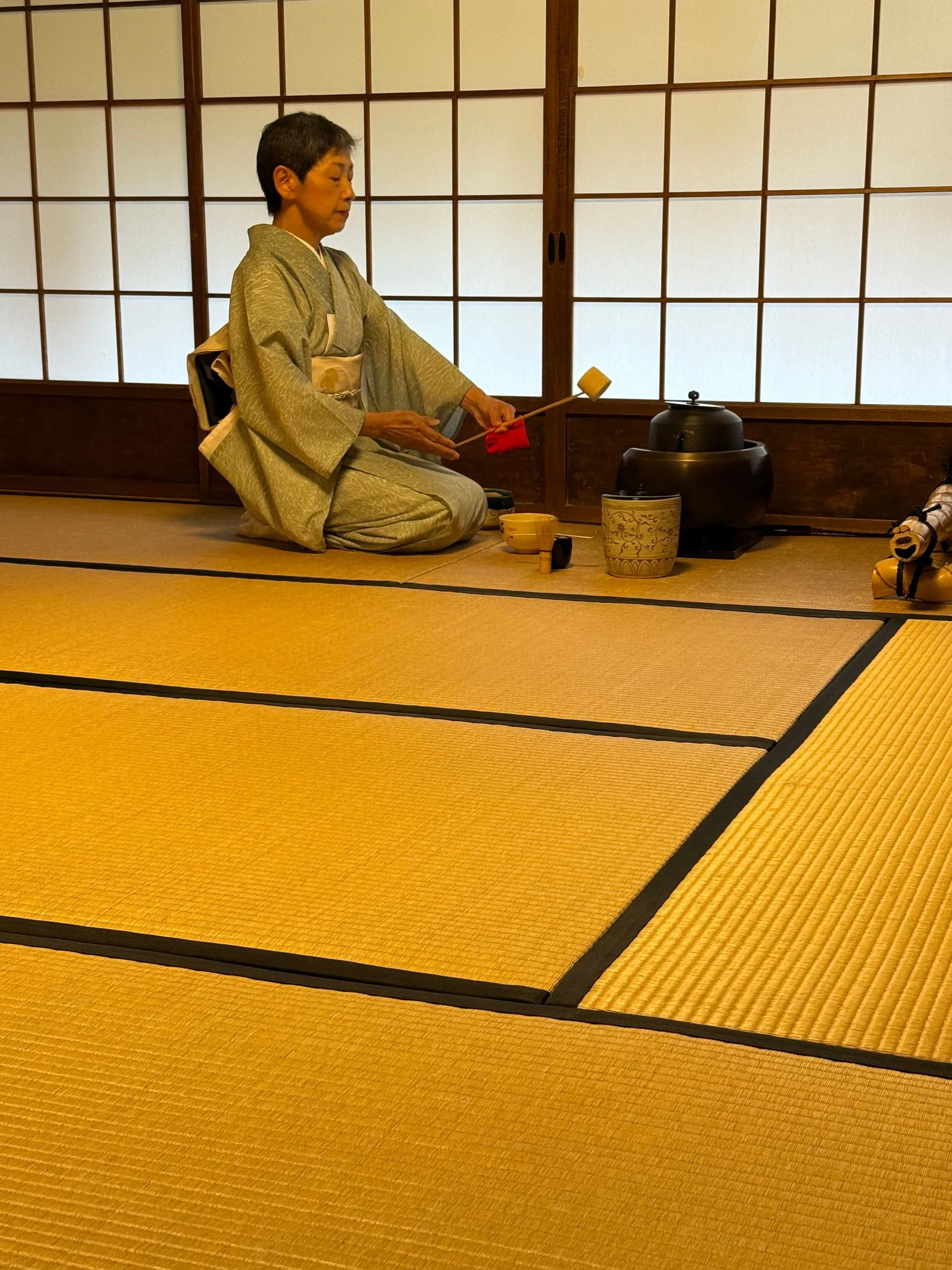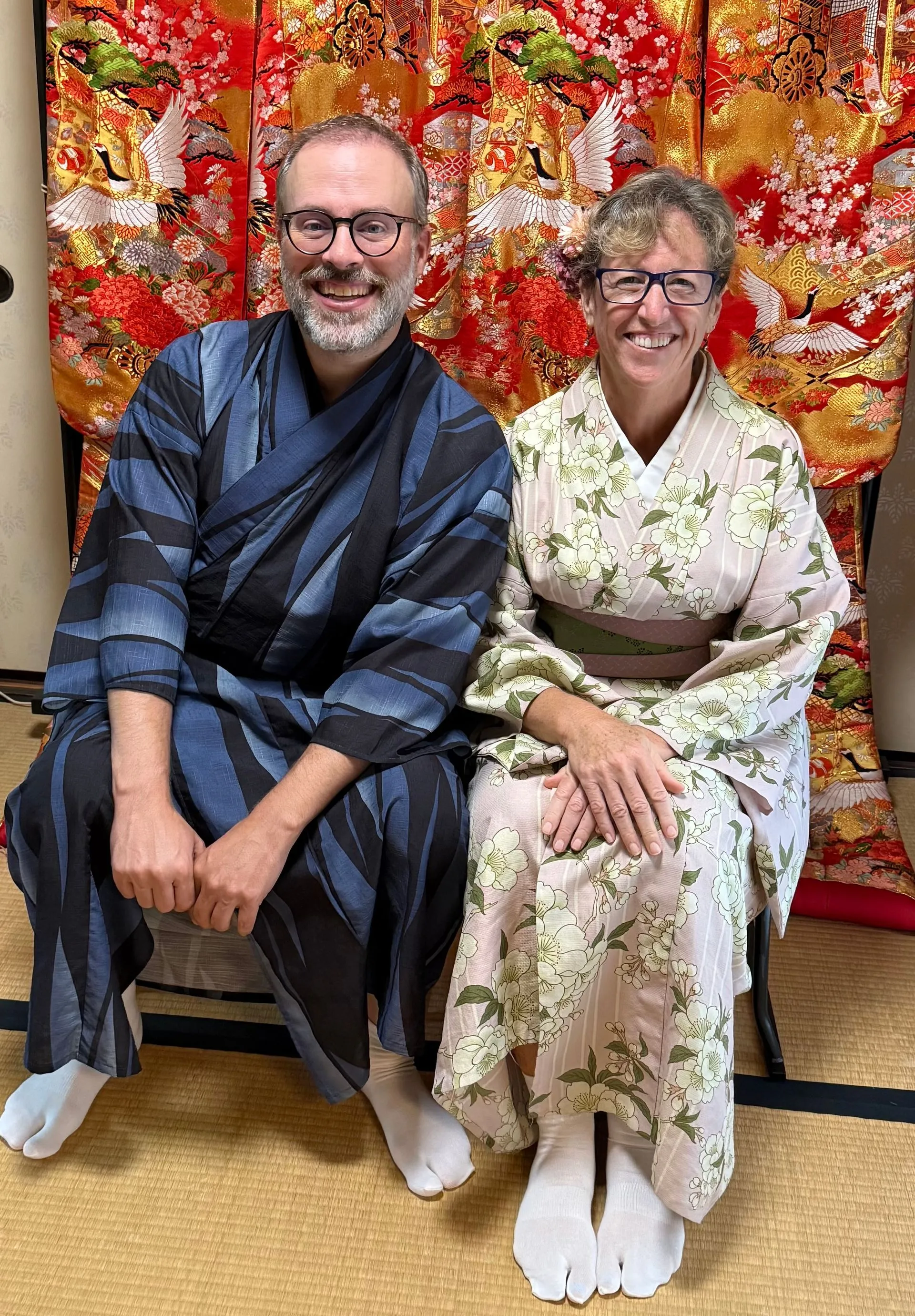 What a fun morning we had! We went to an authentic tea house in Gion, the older section of Kyoto. We all got dressed in Kimonos complete with hair, socks and shoes. The staff are amazing and efficient & like ninjas with bobby-pins. They whipped our hair into updo's in no time! They also pulled, lifted, folded and tucked us neatly into those Kimonos with several fabric belts. Once we were all dressed, we went into a sliding screen Tea Room and met our hostess. She did brief introductions and asked us a bunch of, get to know you questions. The 5 of us Seniors were in with 6 other - 3 young couples - who all kneeled on the floor, while the 5 of us had mini chairs, to sit in! The tea service was very interesting and took about an hour. Then we could go out into the gardens and take photos. We had a lot of fun coming up with unique poses to highlight our inner geisha's!