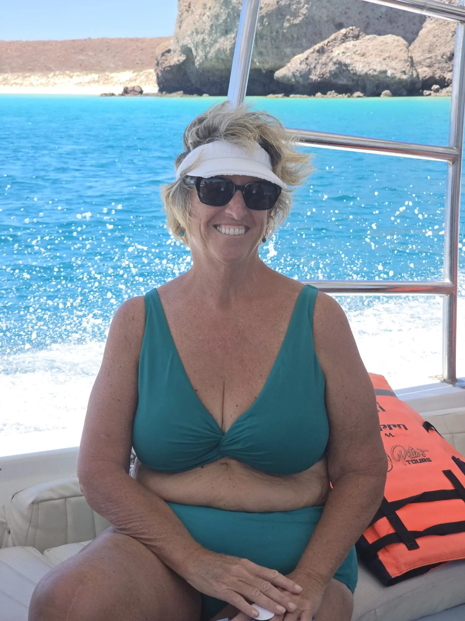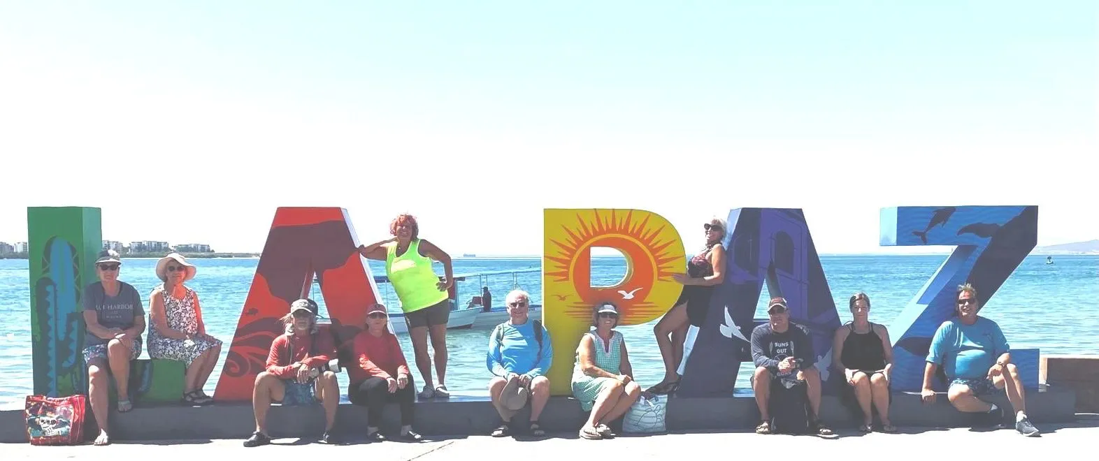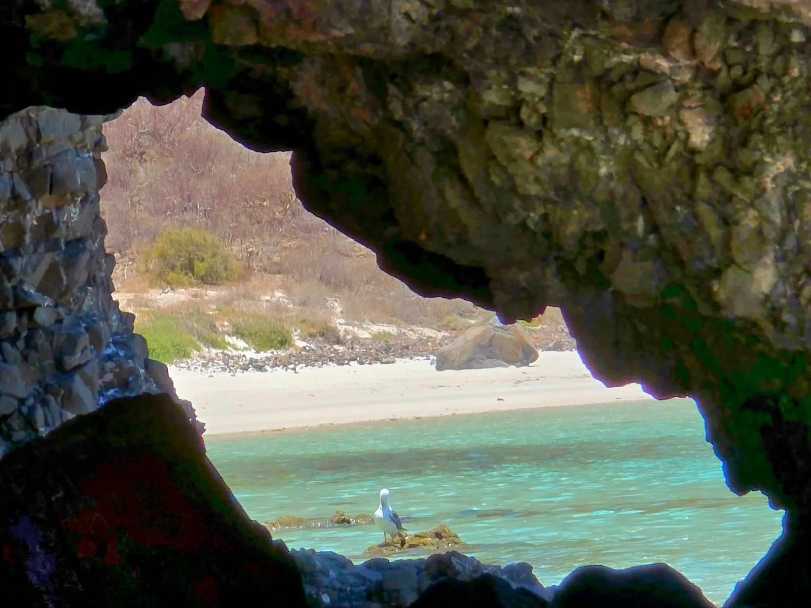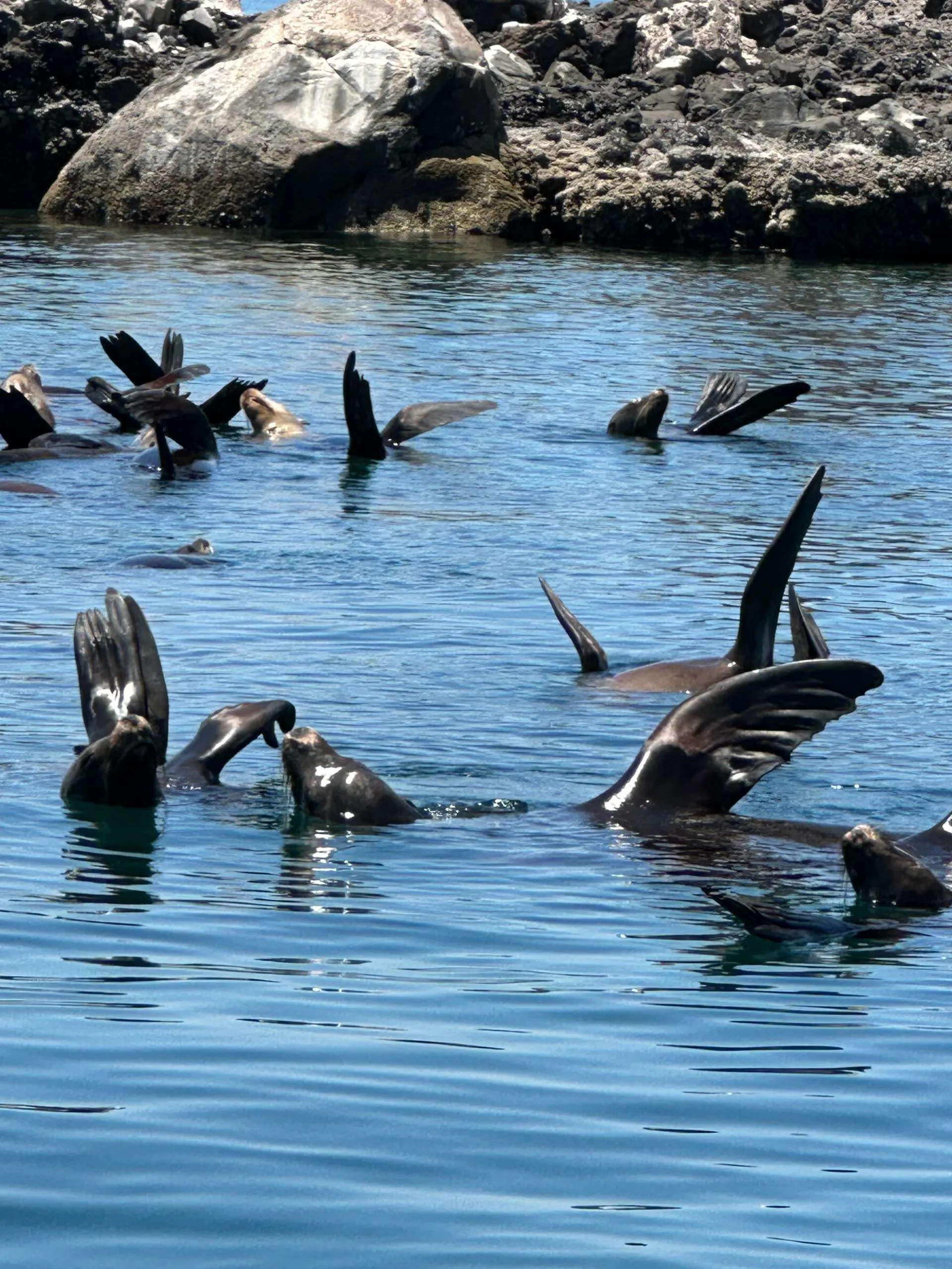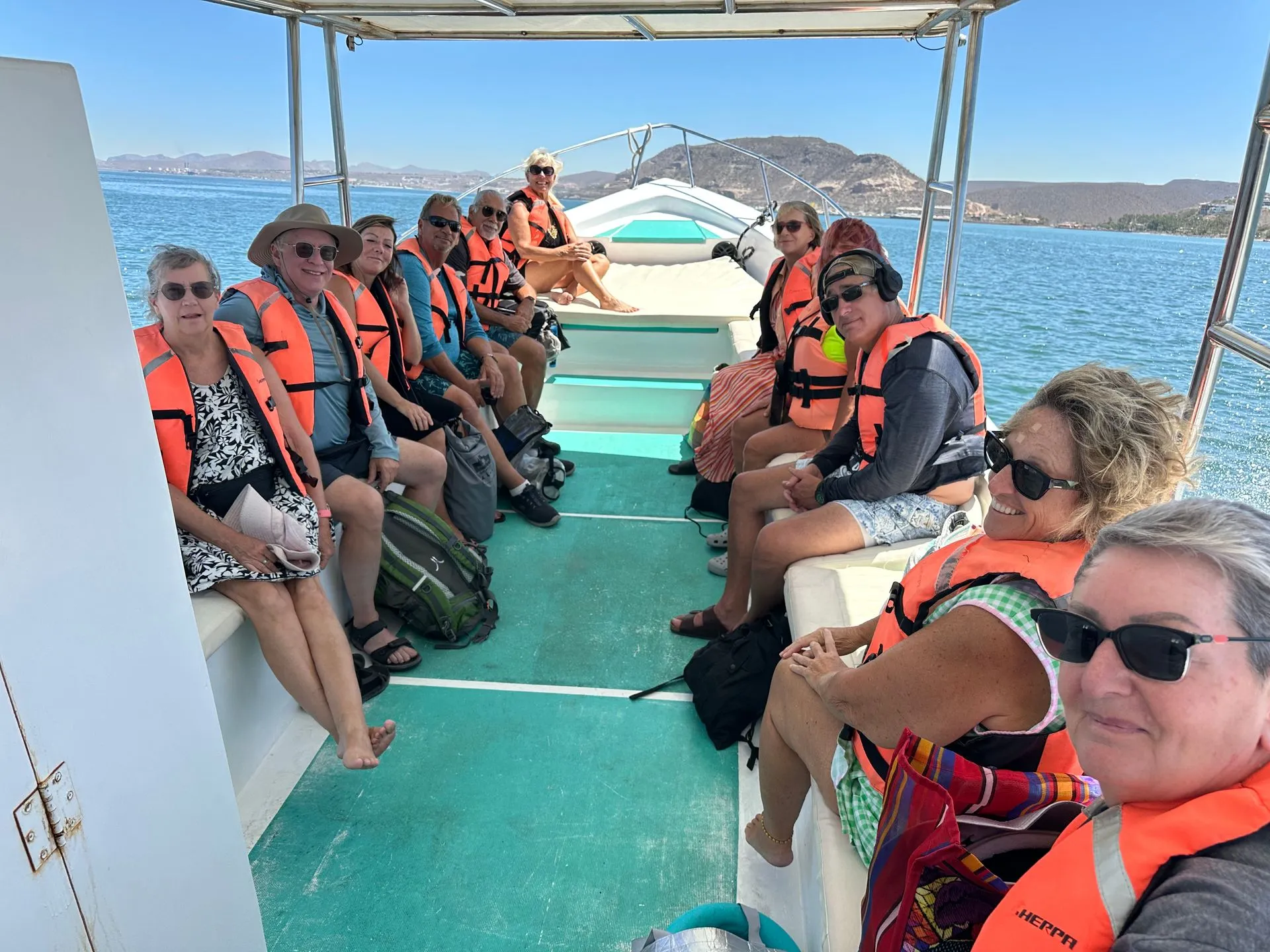 First, we traveled past the resort town of La Paz coastline admiring the hotels, marinas, luxury homes. We saw a super yacht that was run on top of a dead reef, by a careless millionaire. It has been sitting there for over a year - no one wants to bear the cost to have it removed! Then we came upon an island claimed by sea lions basking in the waters, sunning and relaxing in the oddest poses! They float on their backs , put their tails up and one fin above the water, with the other holding them balanced below the water. There were hundreds of them. They were chatting away ( called gossiping) and could lay this way for hours, per our guide.