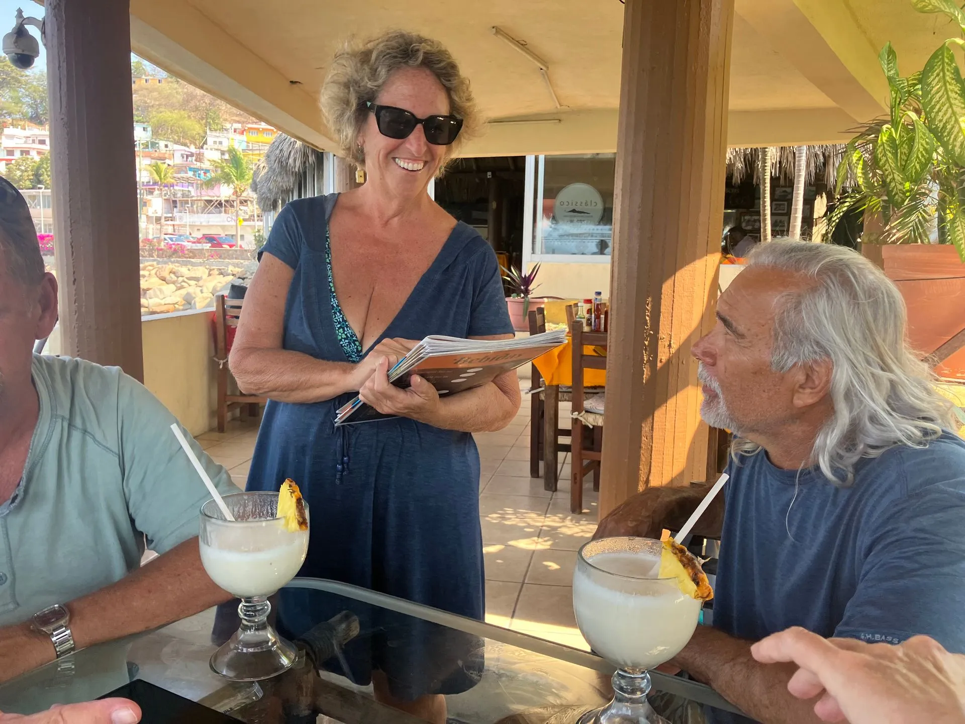 We posed for a group shot before leaving the boat but didn't realize how in the shadows we were. We went to a restaurant down the pier from the dock and they were short staffed, so I jumped in to help the waitress, but our Chinese / Mexican dishes still took along time. Regardless, we all had a great day and enjoyed the Margaritas, Pina coladas and conversation.