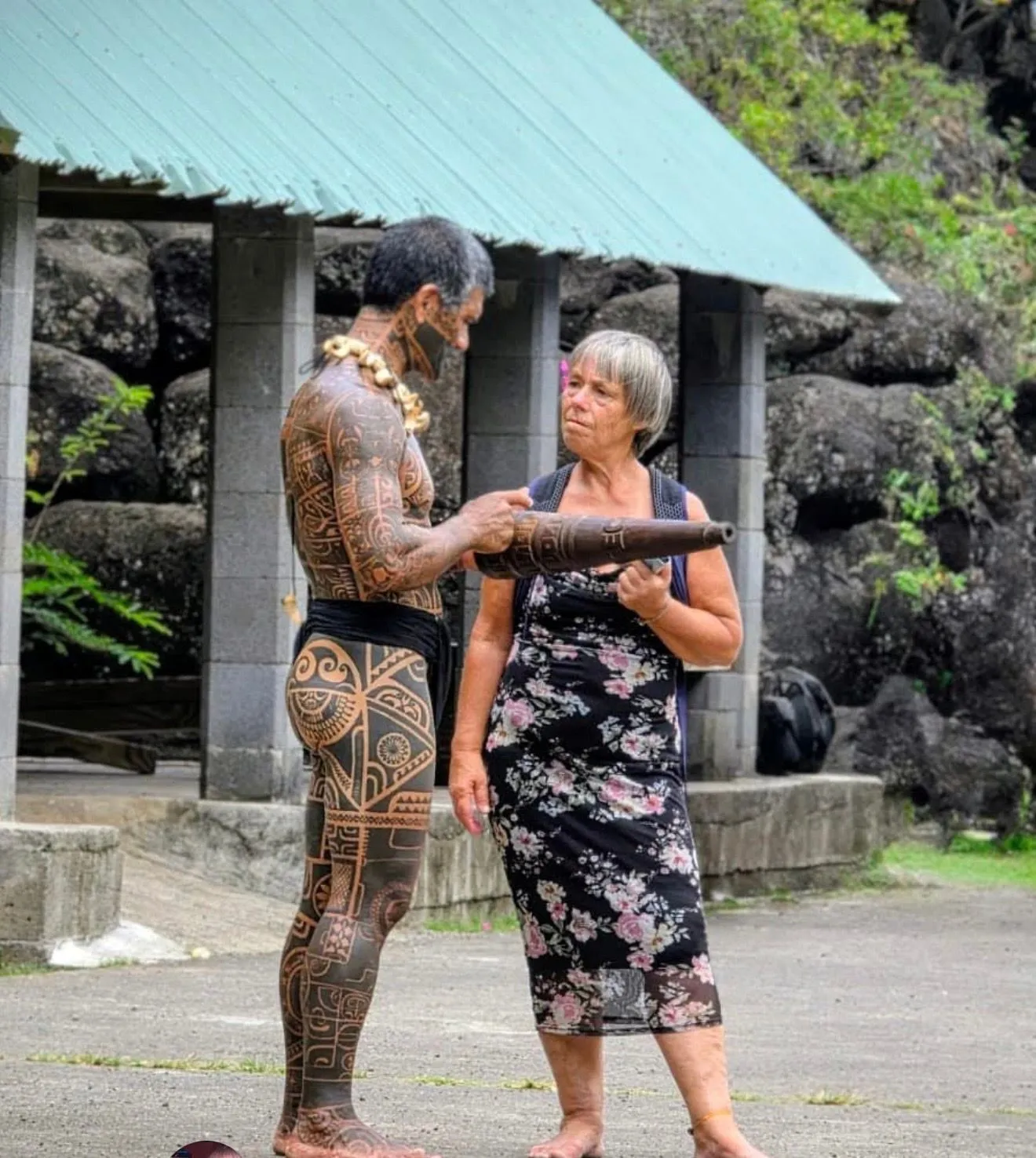 Tahuata Chief and Viv ( one of our New Zealand Residents) discussing language similarities, after his greeting with horn.