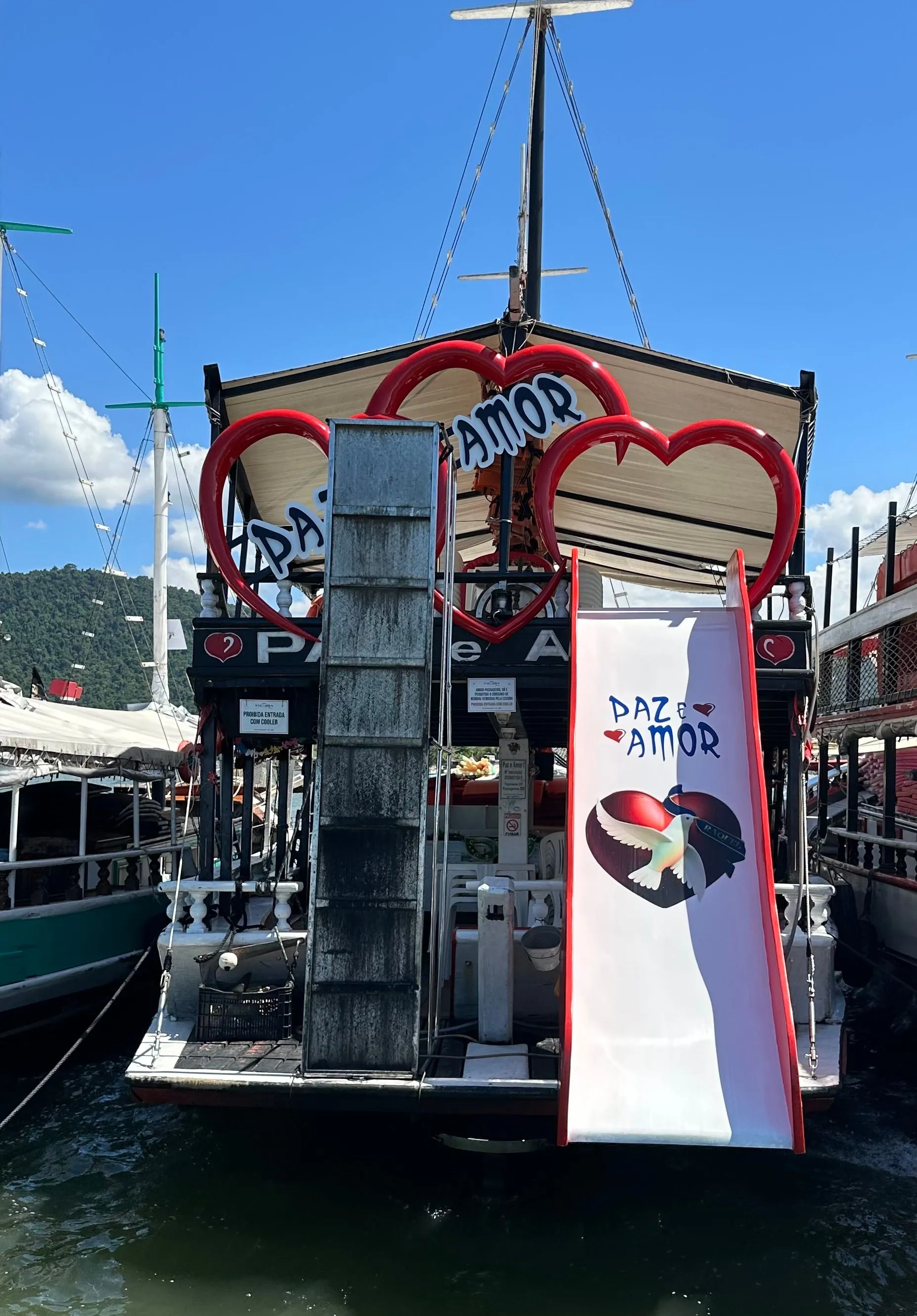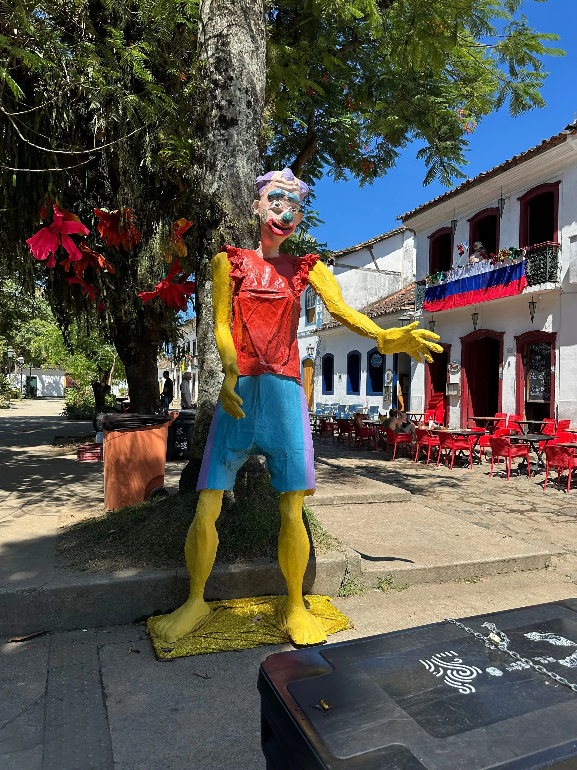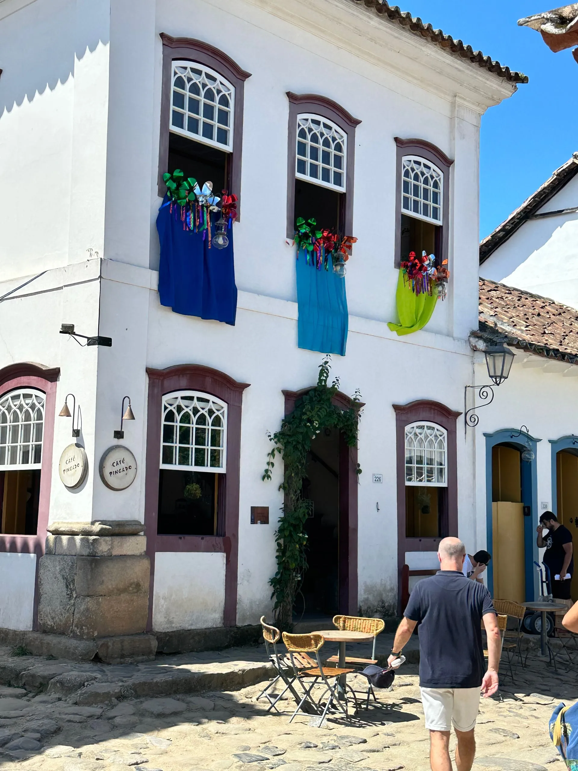 Party is a small town backed by the mountains on Brazil's Costa Verde, between Rio and Sao Paula. Its colonial center is cobbled streets and 17th & 18th century buildings dating back to the Brazilian Gold Rush. The whitewashed church was built in 1722. The port was full of party boats that cater to the many tourist and dot the coastline. There are 65 islands and hundreds of beaches. The town was decorated for the first weekend of Carnival and many of our residents stayed in town overnight to part take in the festivities. Which kicked off today.