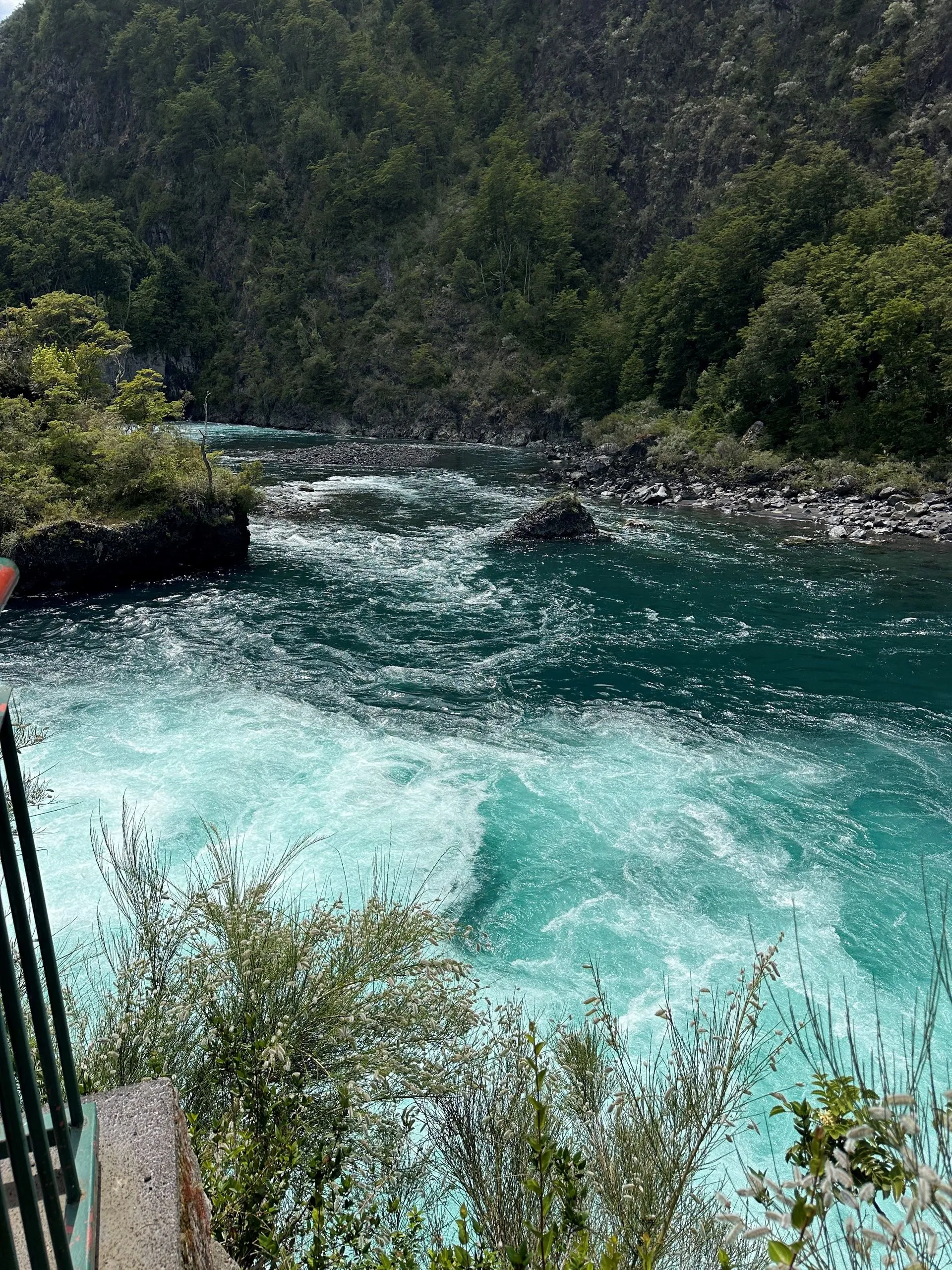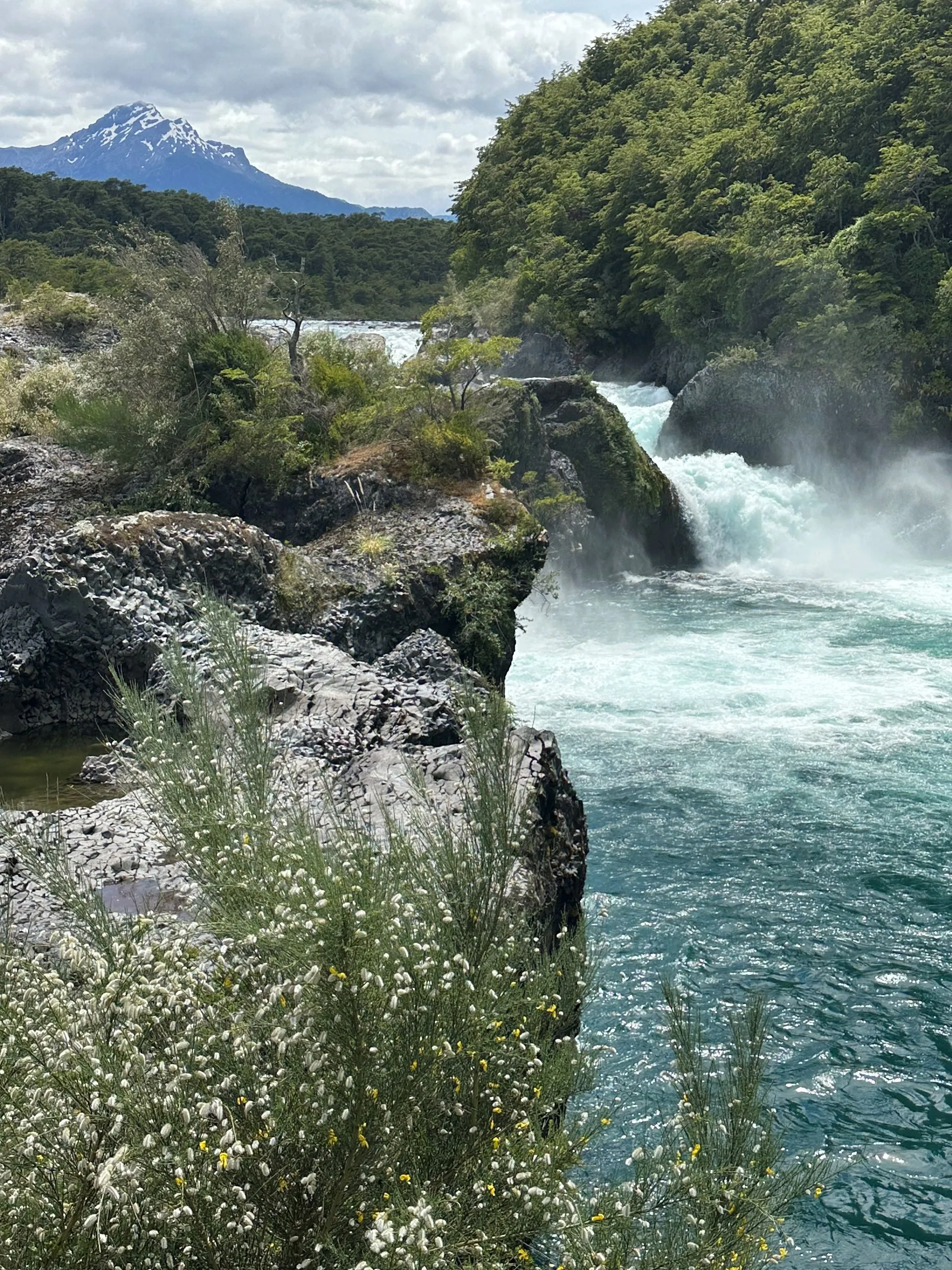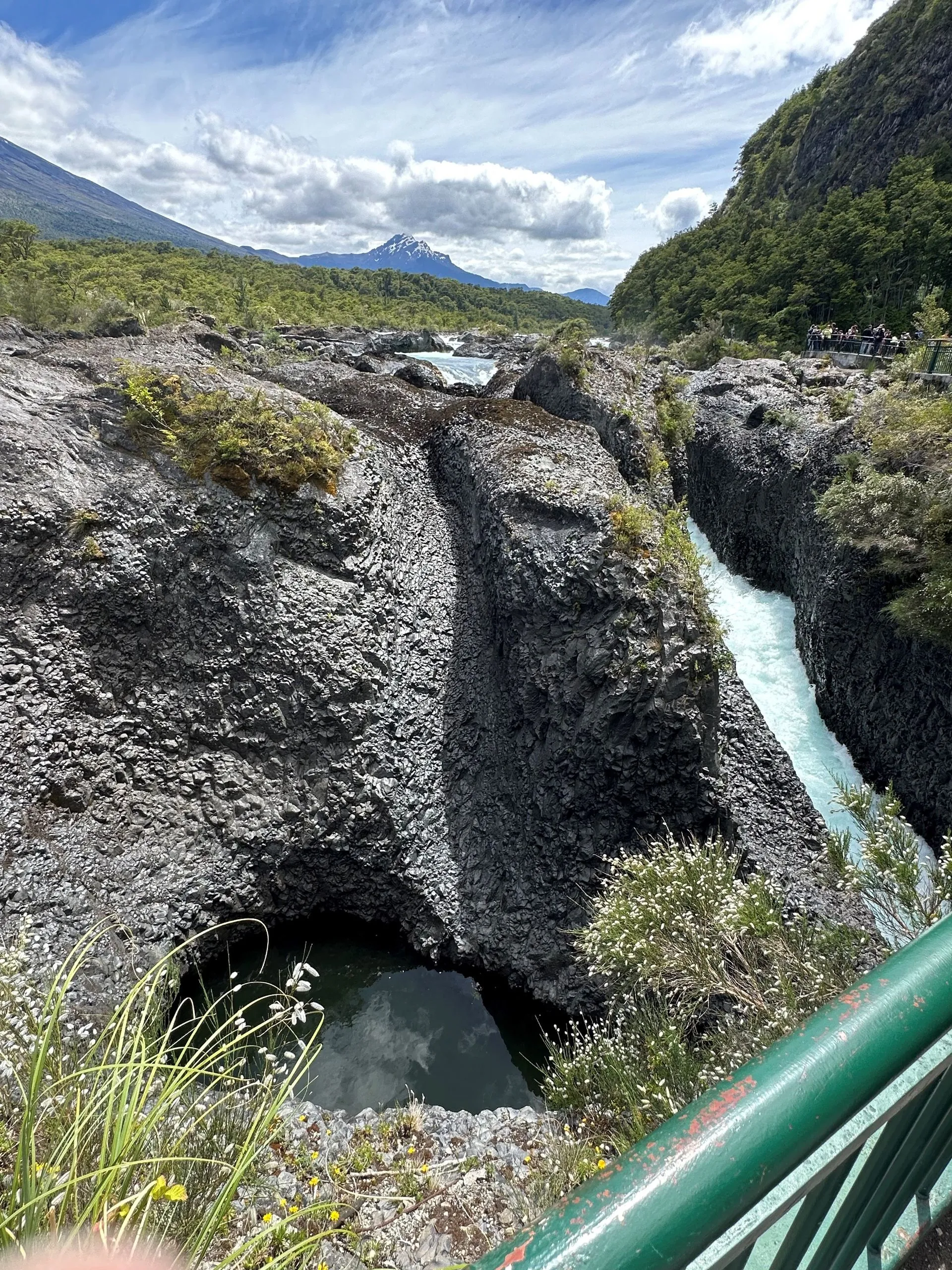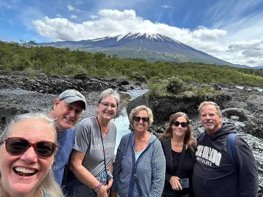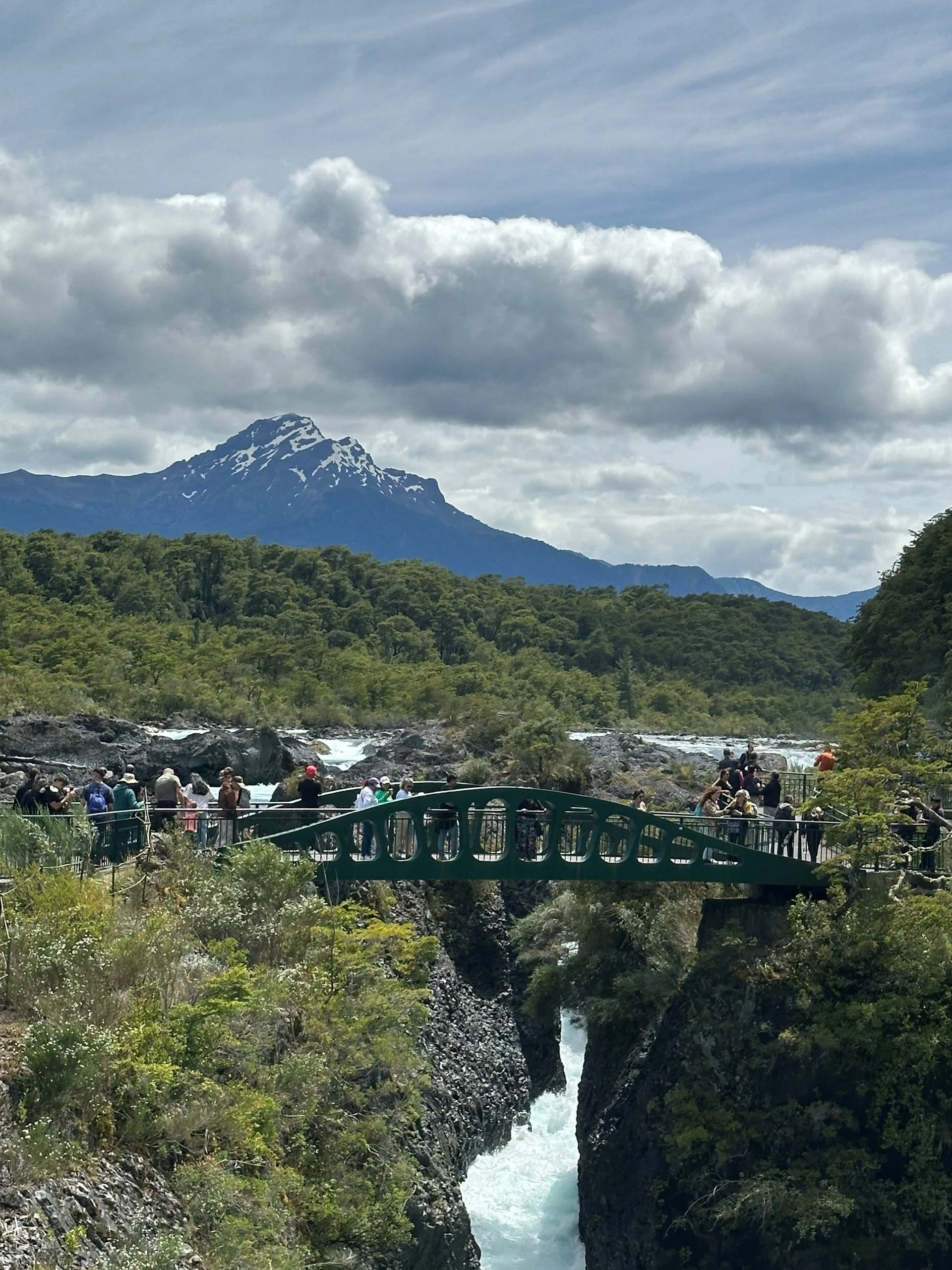This port was all about volcanos and waterfalls. To maximize seeing the sights we ended up doing a Port offered excursion for $50/pp for about 6 hours, in a private van. There was 5 of us from VVR ( Bob & Sarah, Anna, Sherrie & Me) and 5 others from the MSC ship, that was also in Port, plus our driver and guide. We ran into many other Villa Vie Residents, like Wade and Starr above, who were doing similar routes along the way. Our first stop was Petrohue Falls, which are feed from the hills of the near by Osorno Volcano. The chute type falls are more like rapids, with only a few vertical drops visible. The crystal clear, green hued water surges through the rocks at the base of the viewing area.