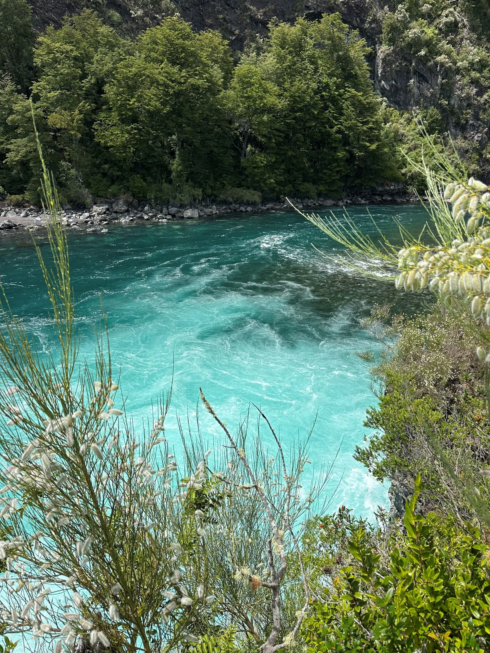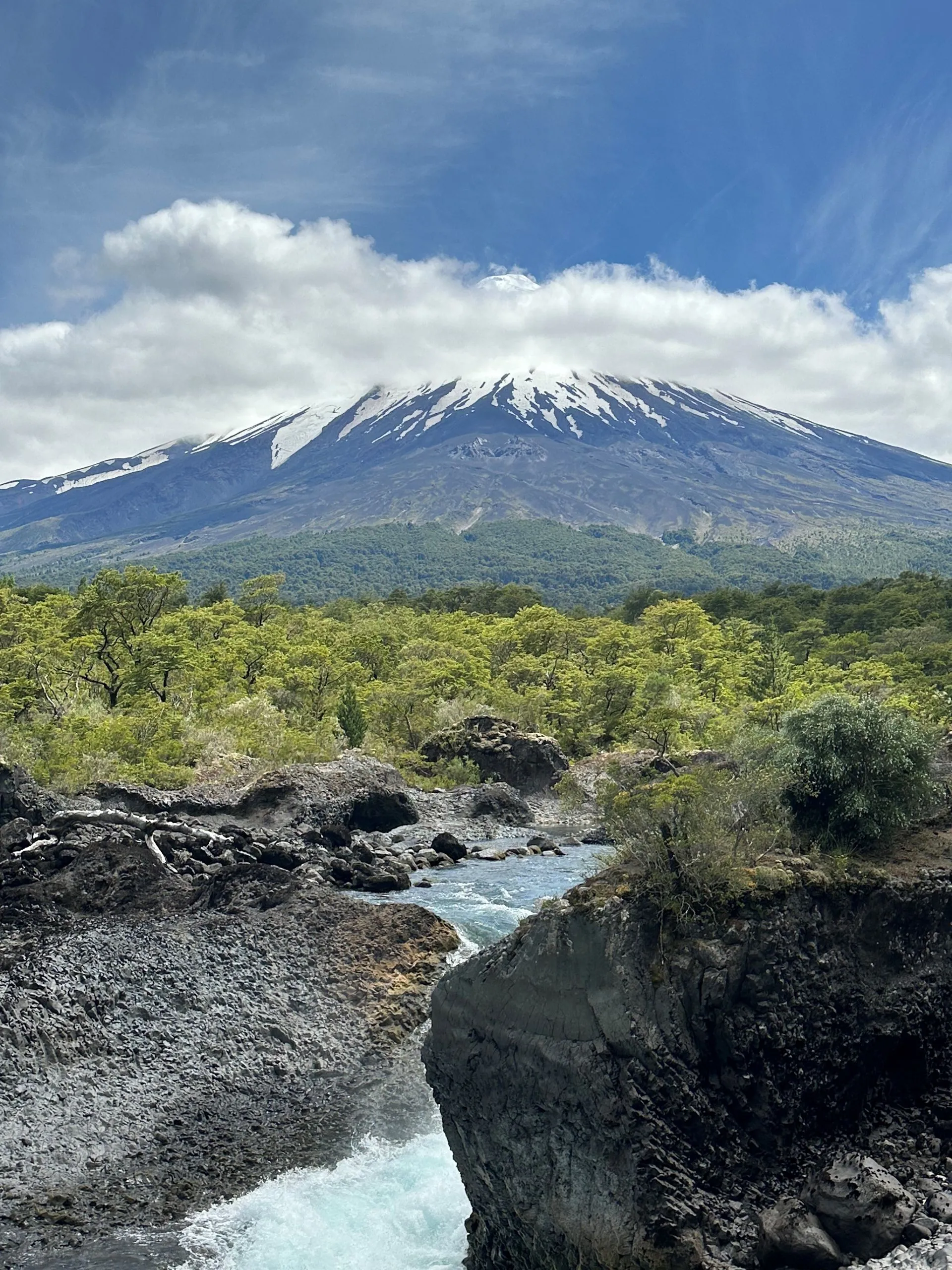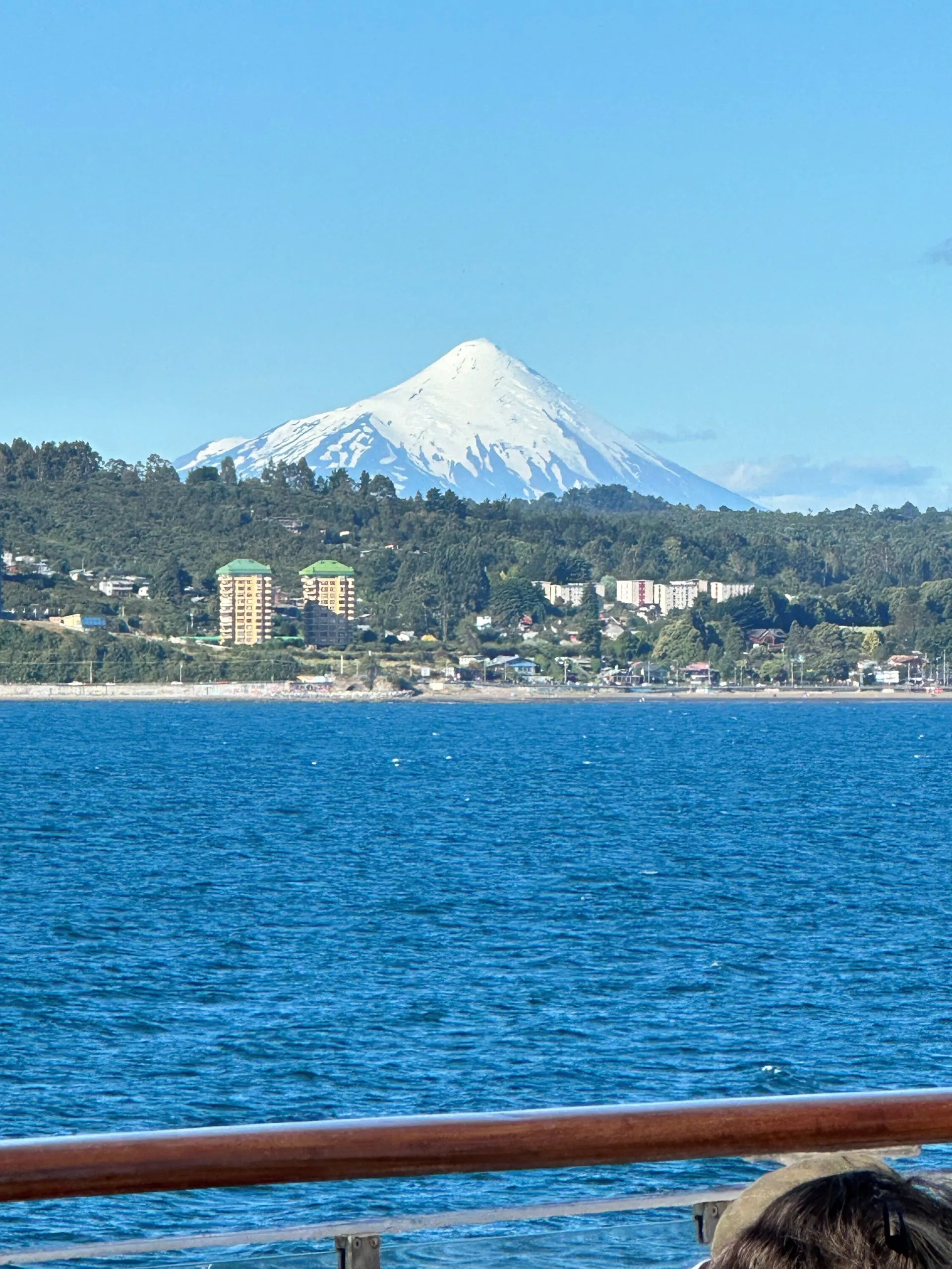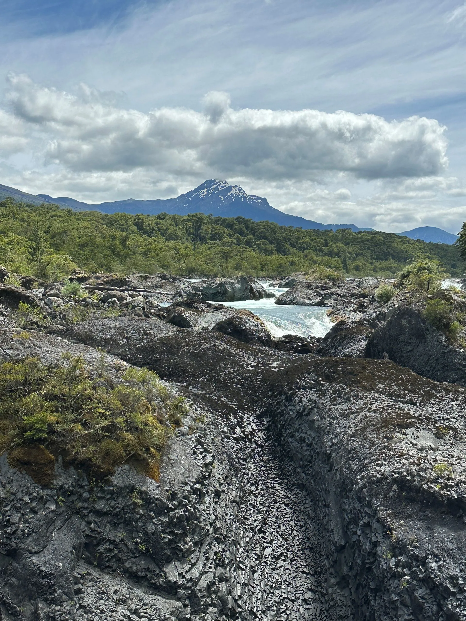 This port was all about volcanos and waterfalls. To maximize seeing the sights we ended up doing a Port offered excursion for $50/pp for about 6 hours, in a private van. There was 5 of us from VVR ( Bob & Sarah, Anna, Sherrie & Me) and 5 others from the MSC ship, that was also in Port, plus our driver and guide. We ran into many other Villa Vie Residents, like Wade and Starr above, who were doing similar routes along the way. Our first stop was Petrohue Falls, which are feed from the hills of the near by Osorno Volcano. The chute type falls are more like rapids, with only a few vertical drops visible. The crystal clear, green hued water surges through the rocks at the base of the viewing area.