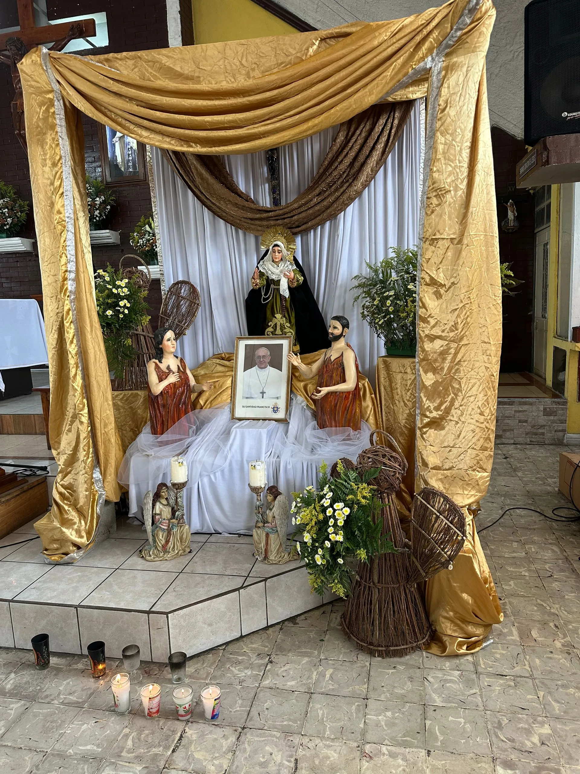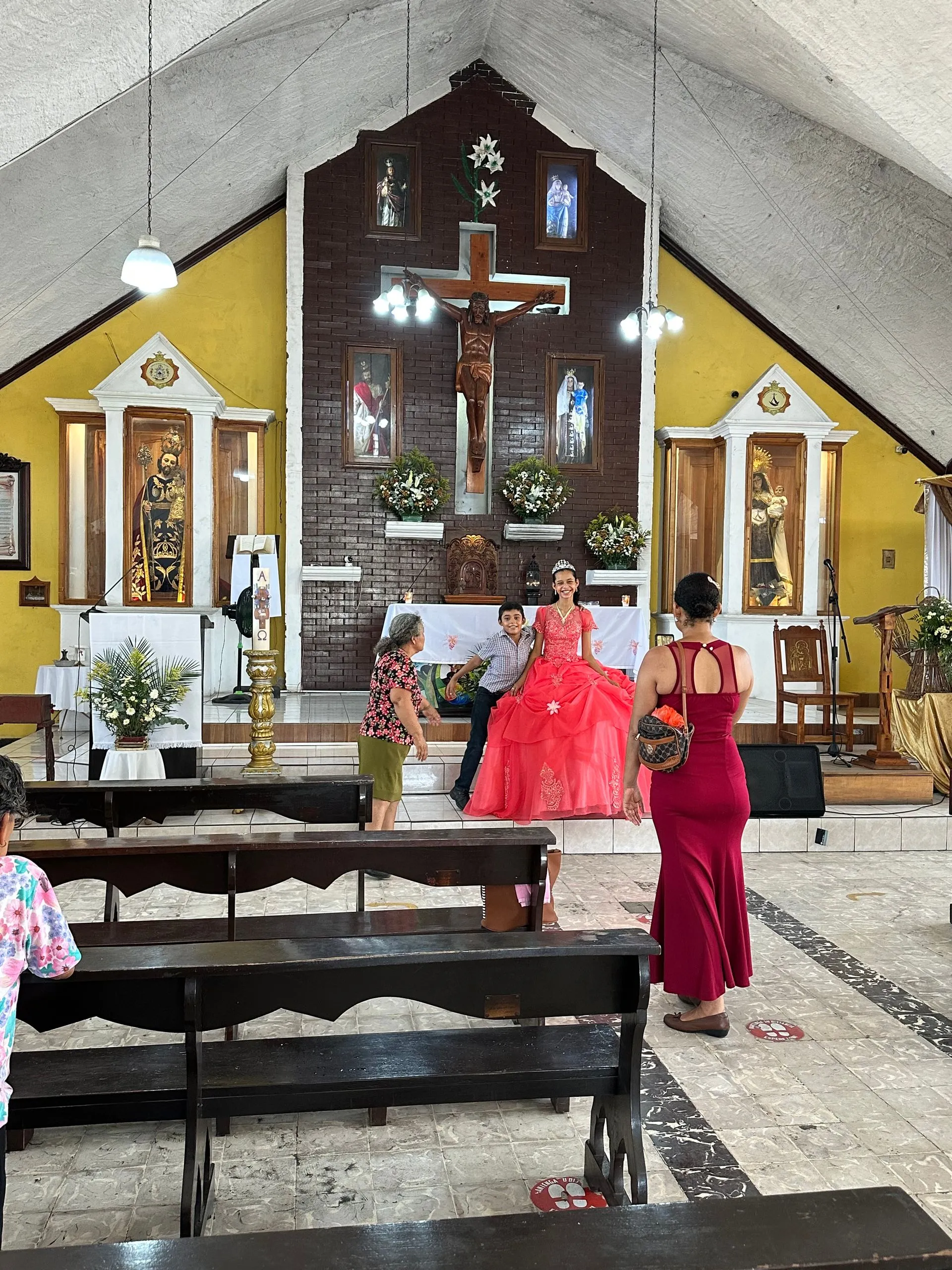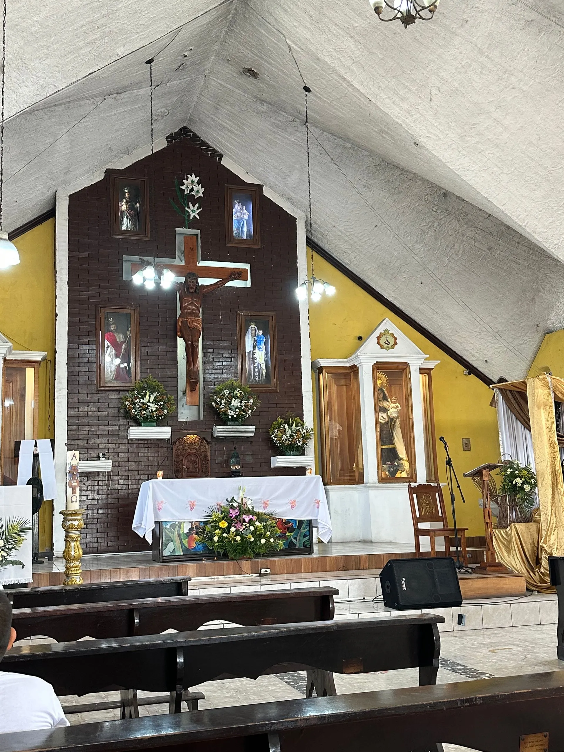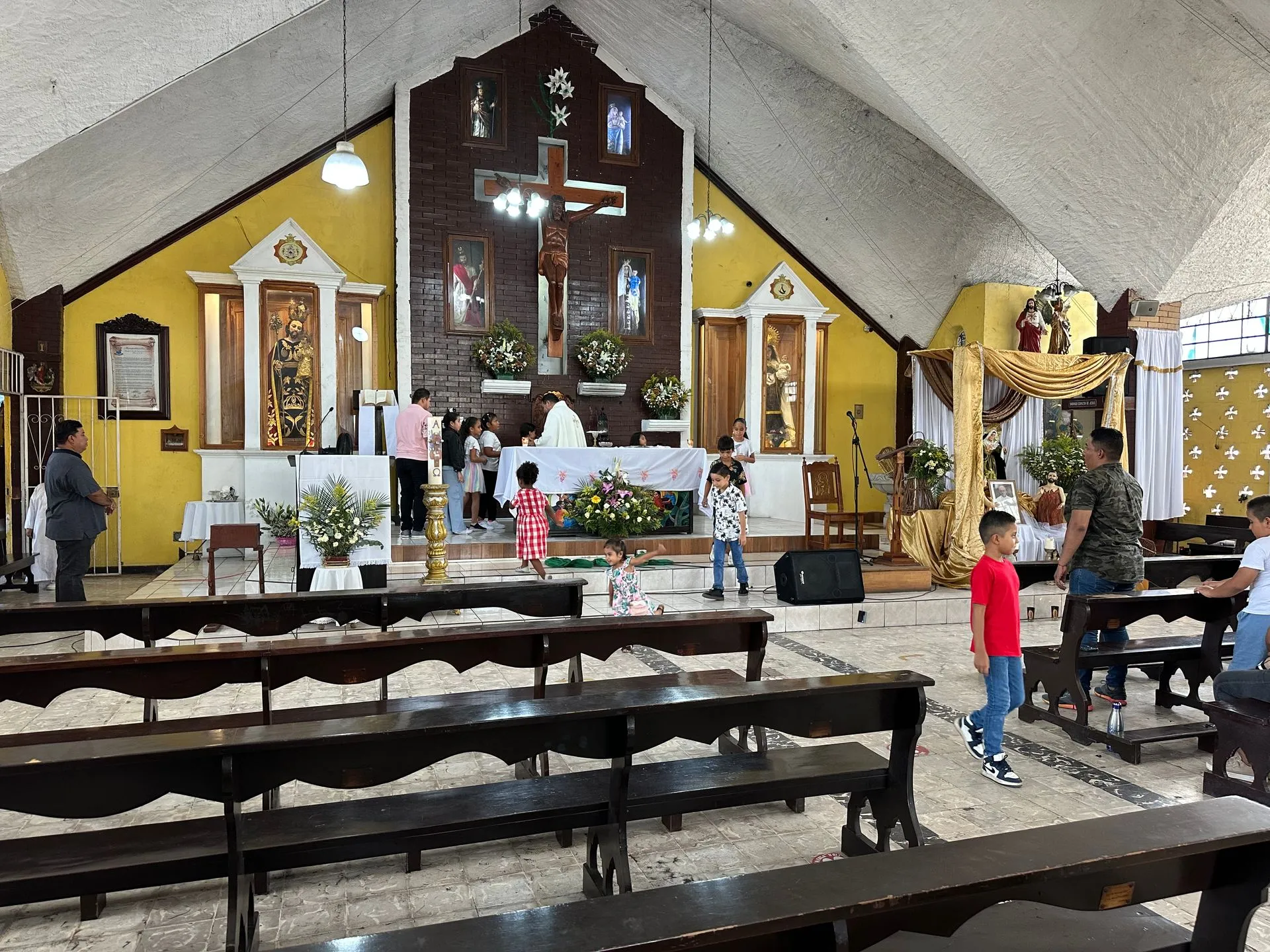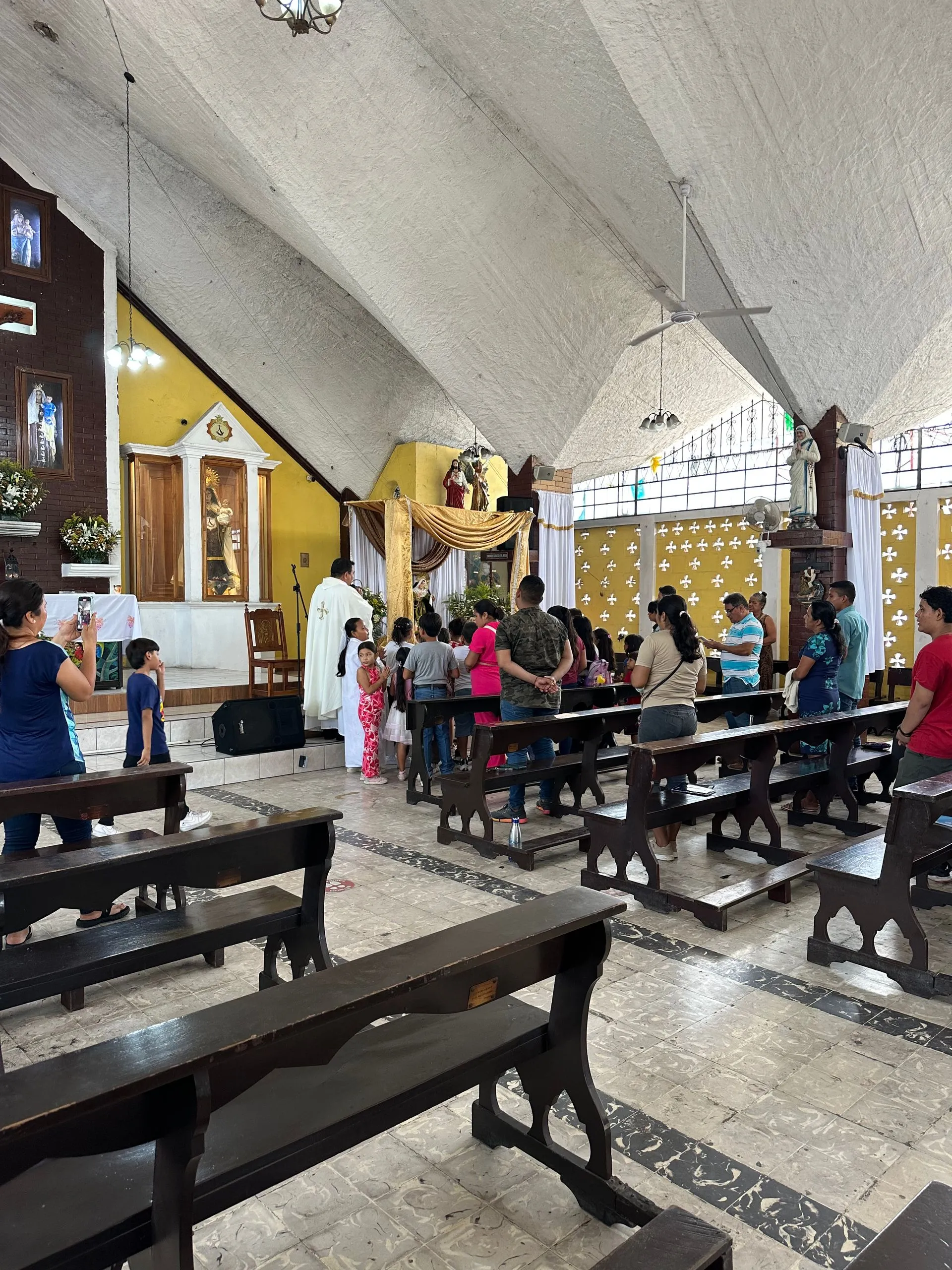 Sunday Morning I went to Mass with fellow residents ( MariAnne, Amanda, Phil, Kim and Fran - left to right ) at Parroquia San Jose Esposode la Virgen Maria Church in San Jose, Guatemala. This was an extremely friendly and family oriented parish. The priest made special efforts to include all the children as often as he could through out the Mass. They went up to hug him on the altar during the sign of peace. I used my google translate much more effectively, feeling like I got 90% of the readings and the homily.