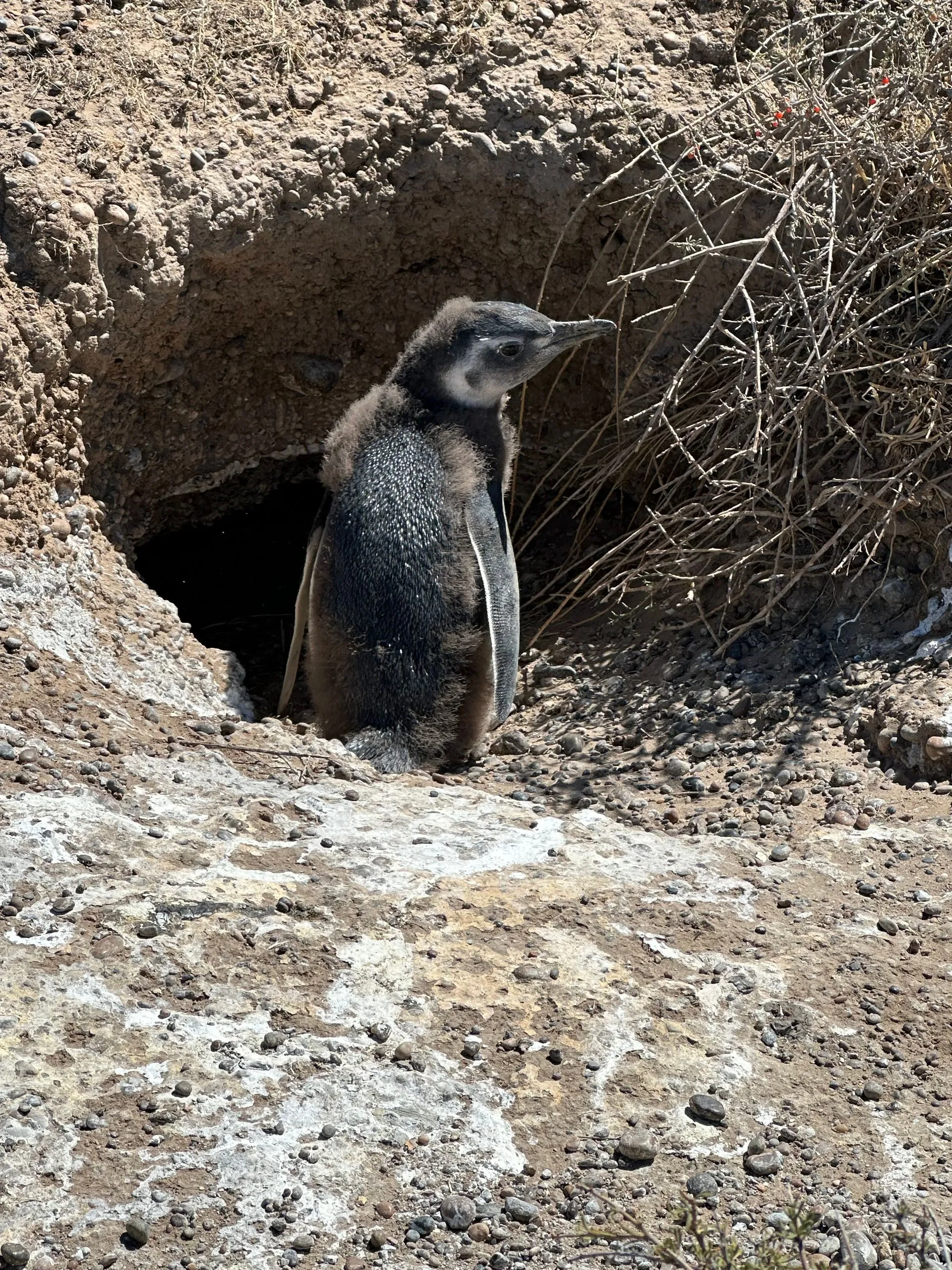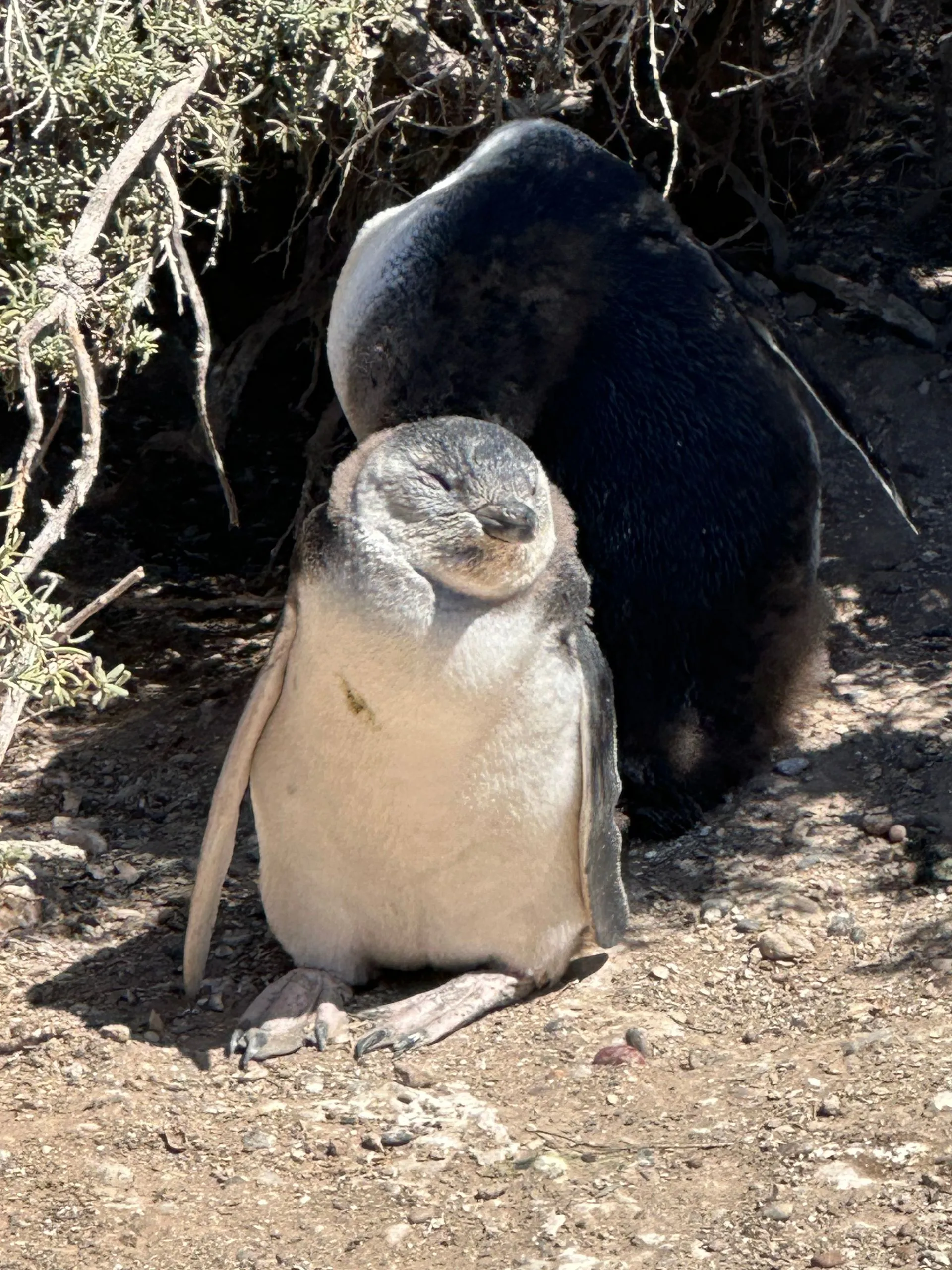 3 months old. We spent a couple of hours watching the penguins play, bathe, waddle, sleep and just have fun! It was a very windy day but refreshing to stroll the trails and boardwalks, weaving across all the burrows and small shrubs that hide penguins nests.
