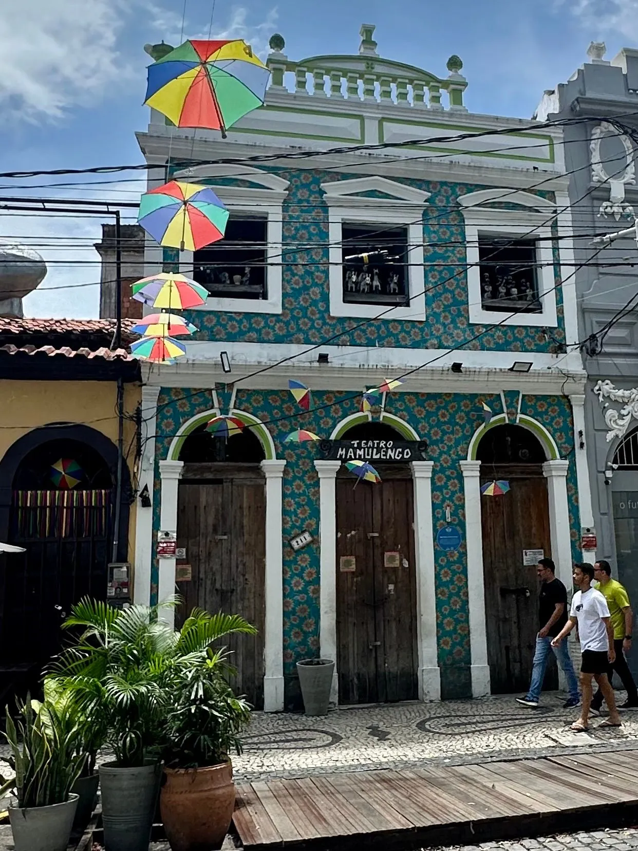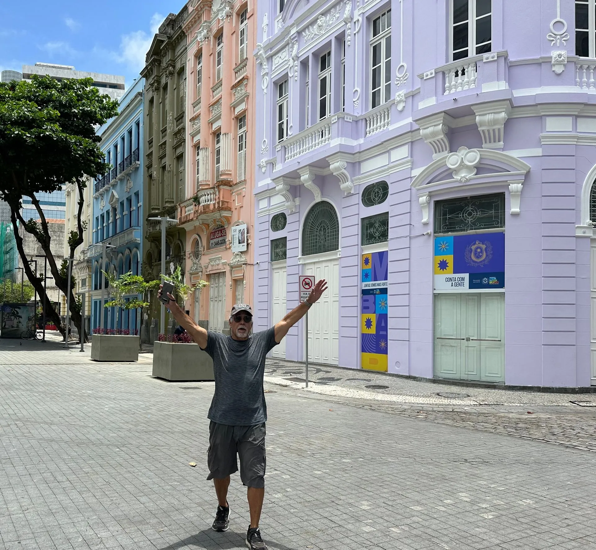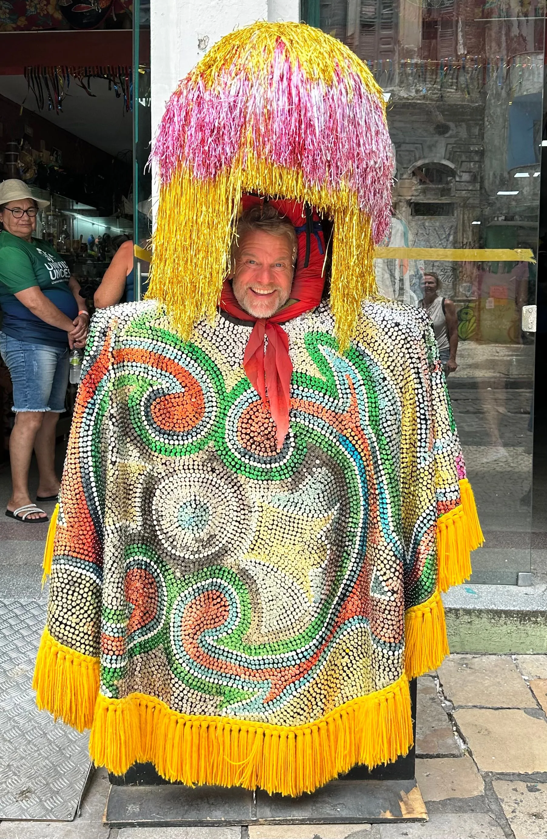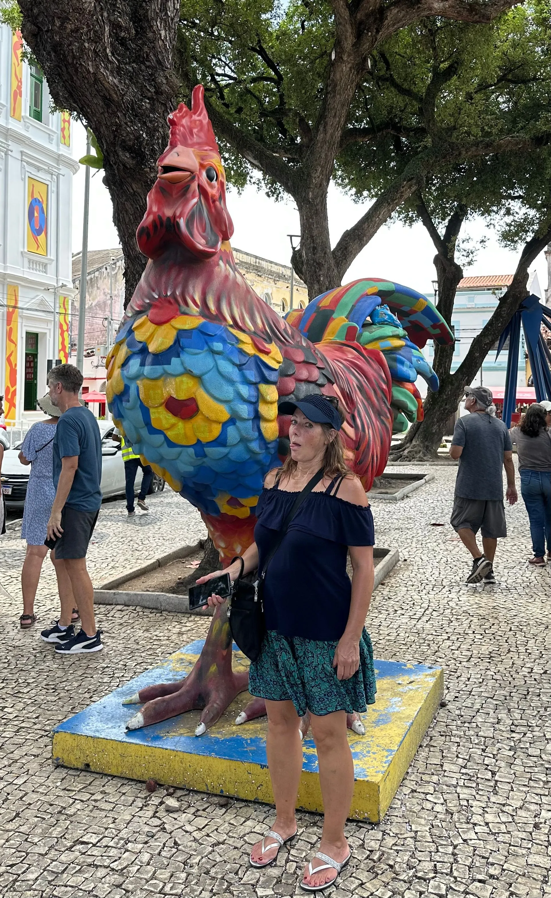 We were greeted in the Port by music & dancers and for the first time WELCOME COCKTAILS! Great way to start a morning of exploring! Walked the town with group of 8, and kept running into other residents doing the same thing, comparing notes. It was very hot, so we searched out shady spots along the way. Remnants of Carnival decorations and stages were being dismantled but some party mask seem to be part of the yearly decor. We walked along the port, saw a variety of street entertainers, and while a lot of the area was run down, other building were bright and colorful. We strolled down to a festive area, home to a charming spot