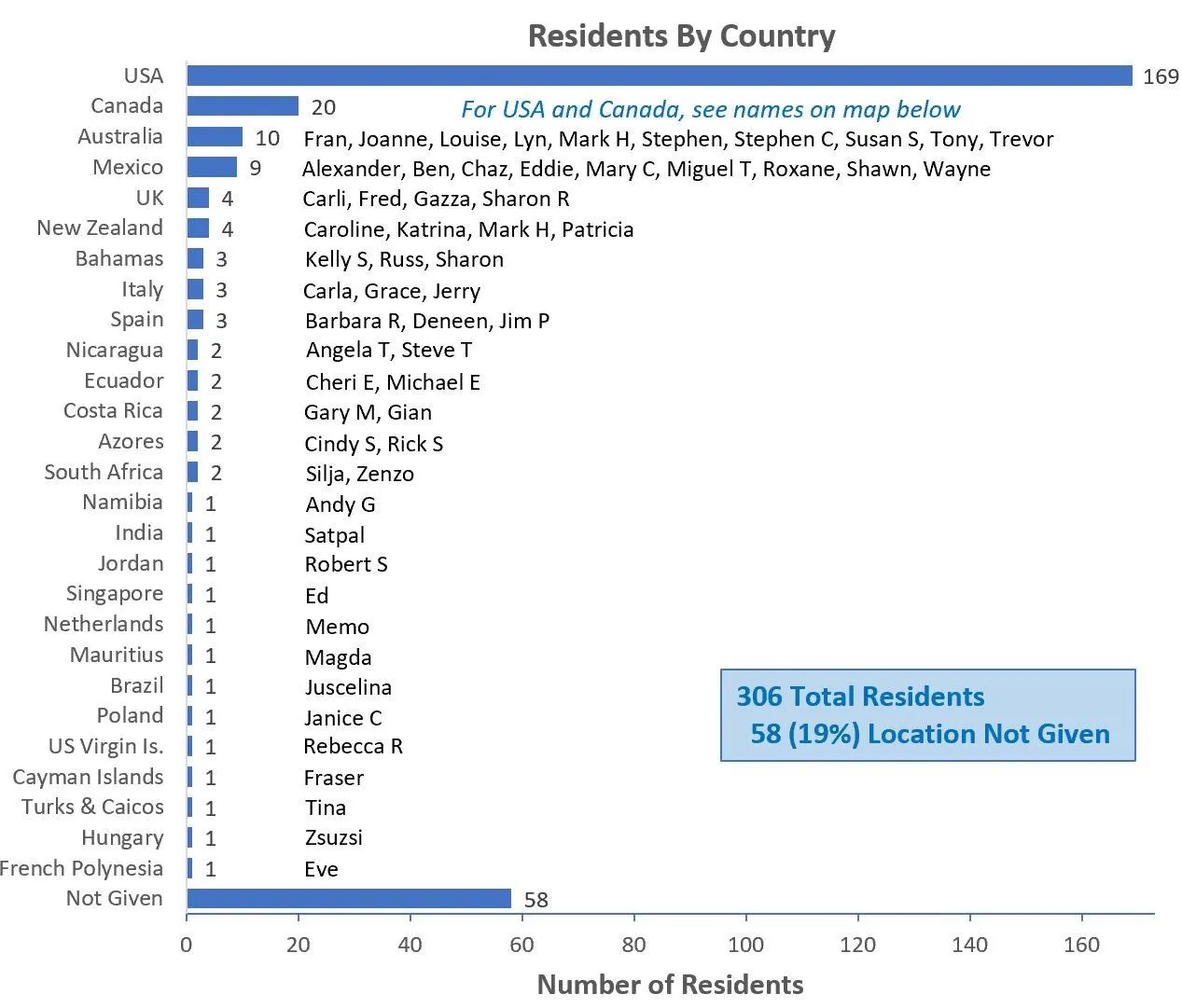 One of my favorite residents is Basia I love her BLOG and she has some great content. I am sharing the work she recently put together on where all the Residents are joining the Ship from. This data reflects the 306 Residents that were signed up, as of the end of August 2024. VVR just announced once we set sail, we will actually be sold out or rooms! I'm excited to see how the data below changes. My number one concern when deciding to do this was how I would mesh with the other residents, since I am doing this totally on my own. I can happily say to date, I am very happy with the mix of people and pleasantly surprised at the larger number of solo travelers over couples. The common travel dreams, we all share is our bonding element. The comradery I have already experienced, in our brief trips to the Canaries and Liverpool, has reinforced that I made the right choice for my retirement dreams.