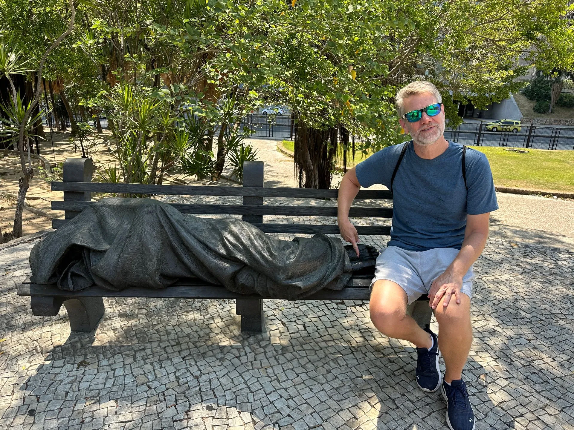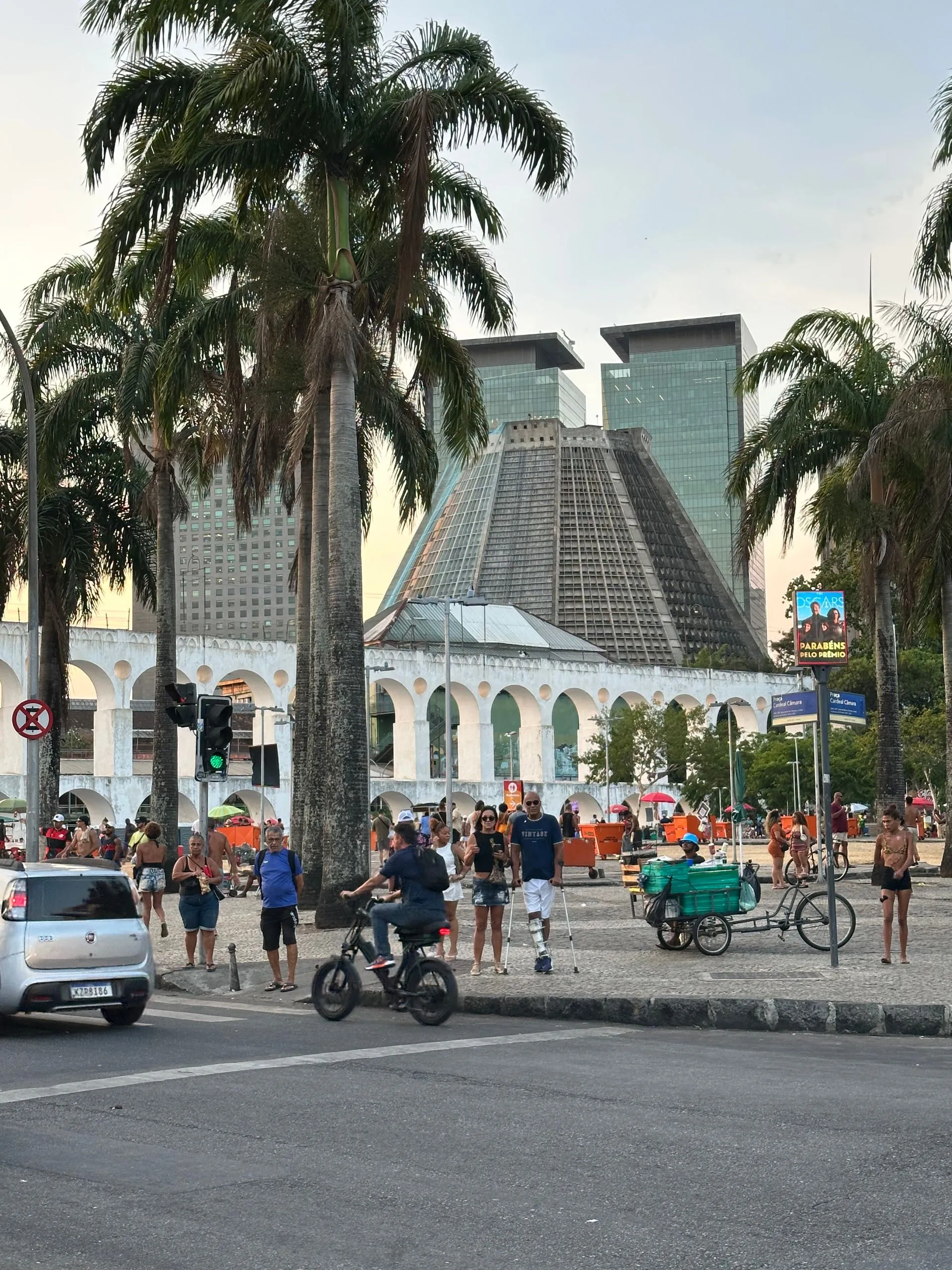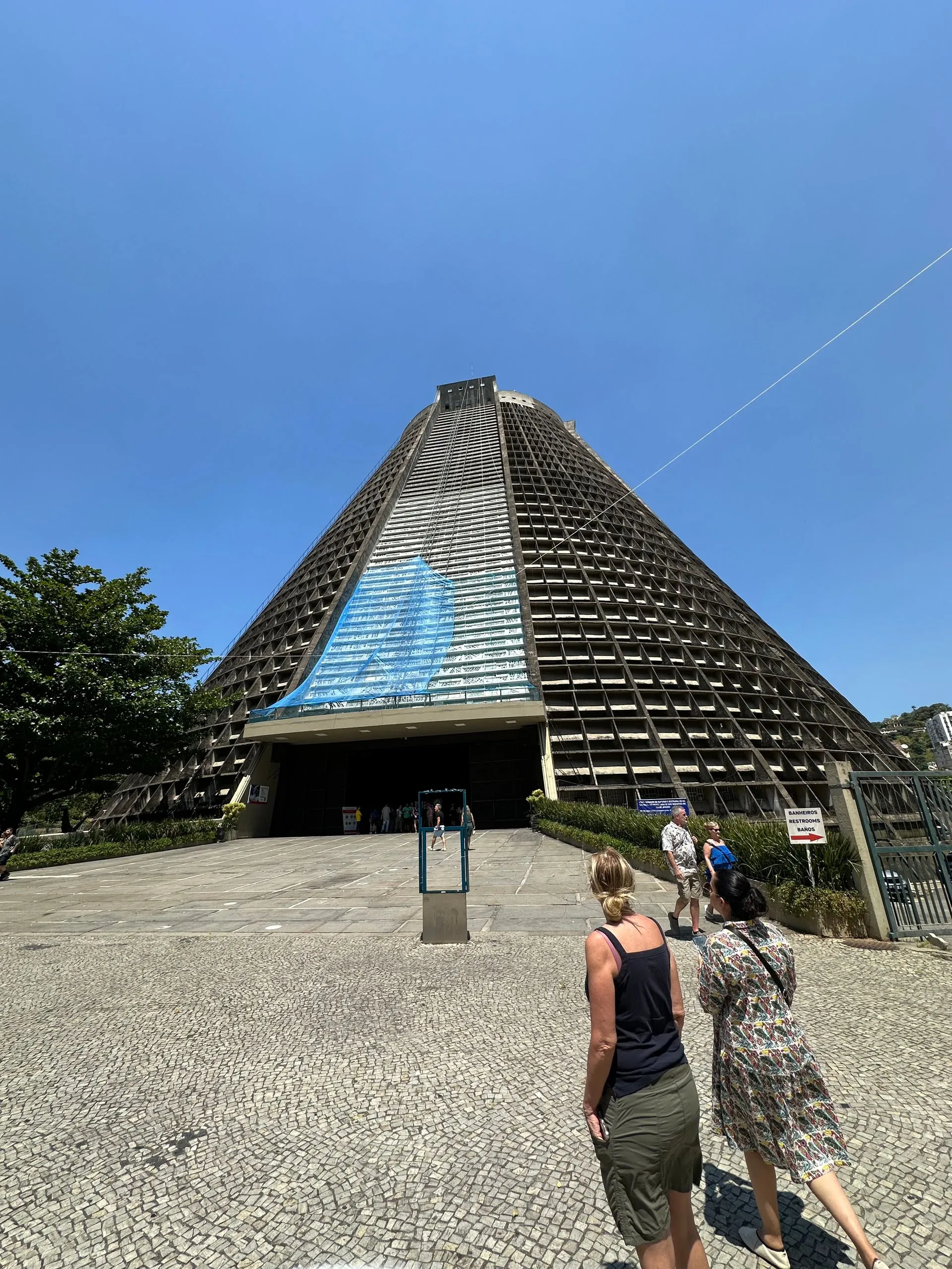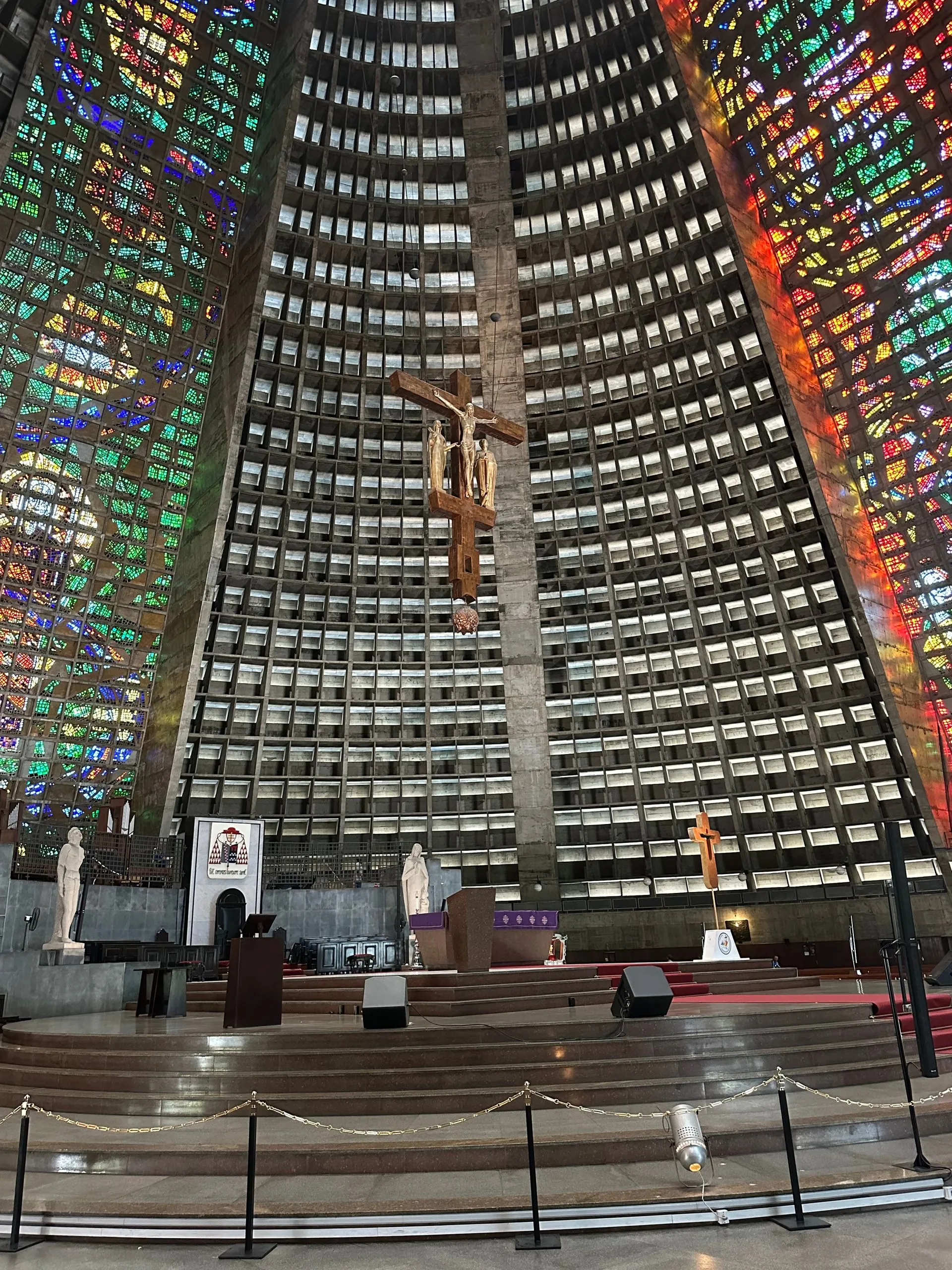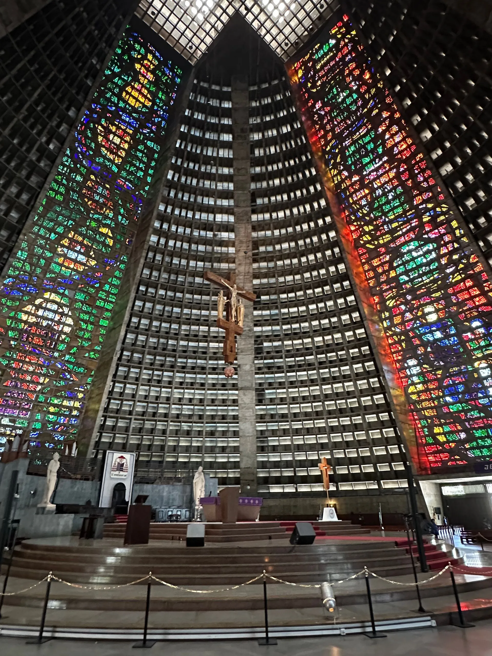 We then went back into the City, as I was trying to find a church giving out ashes at noon, which seemed a popular time for masses, per the web. We went to the City's Metropolitan Cathedral de Sao Sebastiao but alas, it was quiet. Saint Sebastian is the patron saint of Rio de Janeiro and this church is the seat of the Rio's Archdiocese. It was perfect to add to our tour of unique architecture. The outside of building resembles a mayan temple or pyramid. It's considered Modernist architecture, and was built from 1964 to 1979 by Architect Edgar Fonseca. While I didn't find it very attractive on the outside, the stain glass inside and hanging crucifix was impressive.