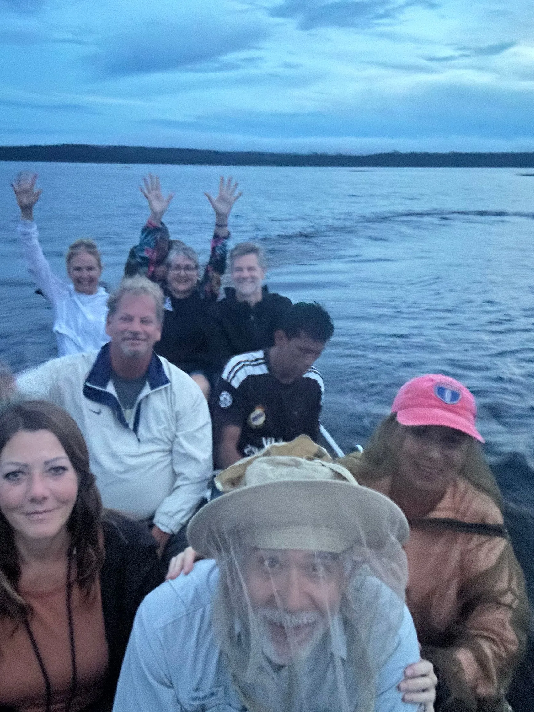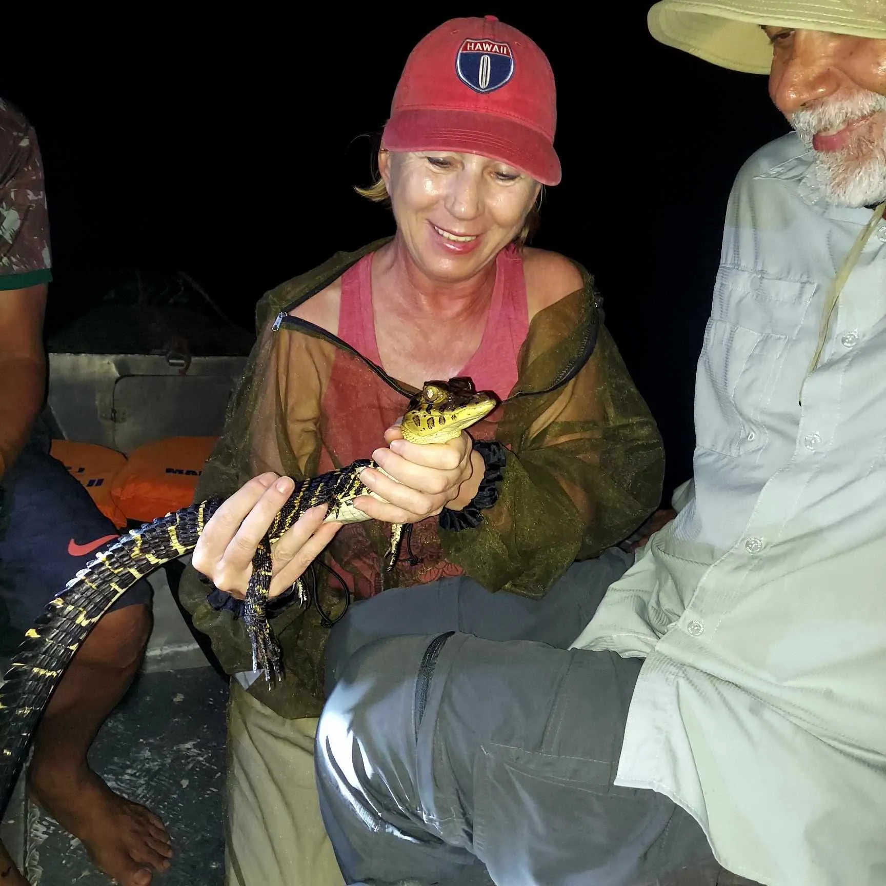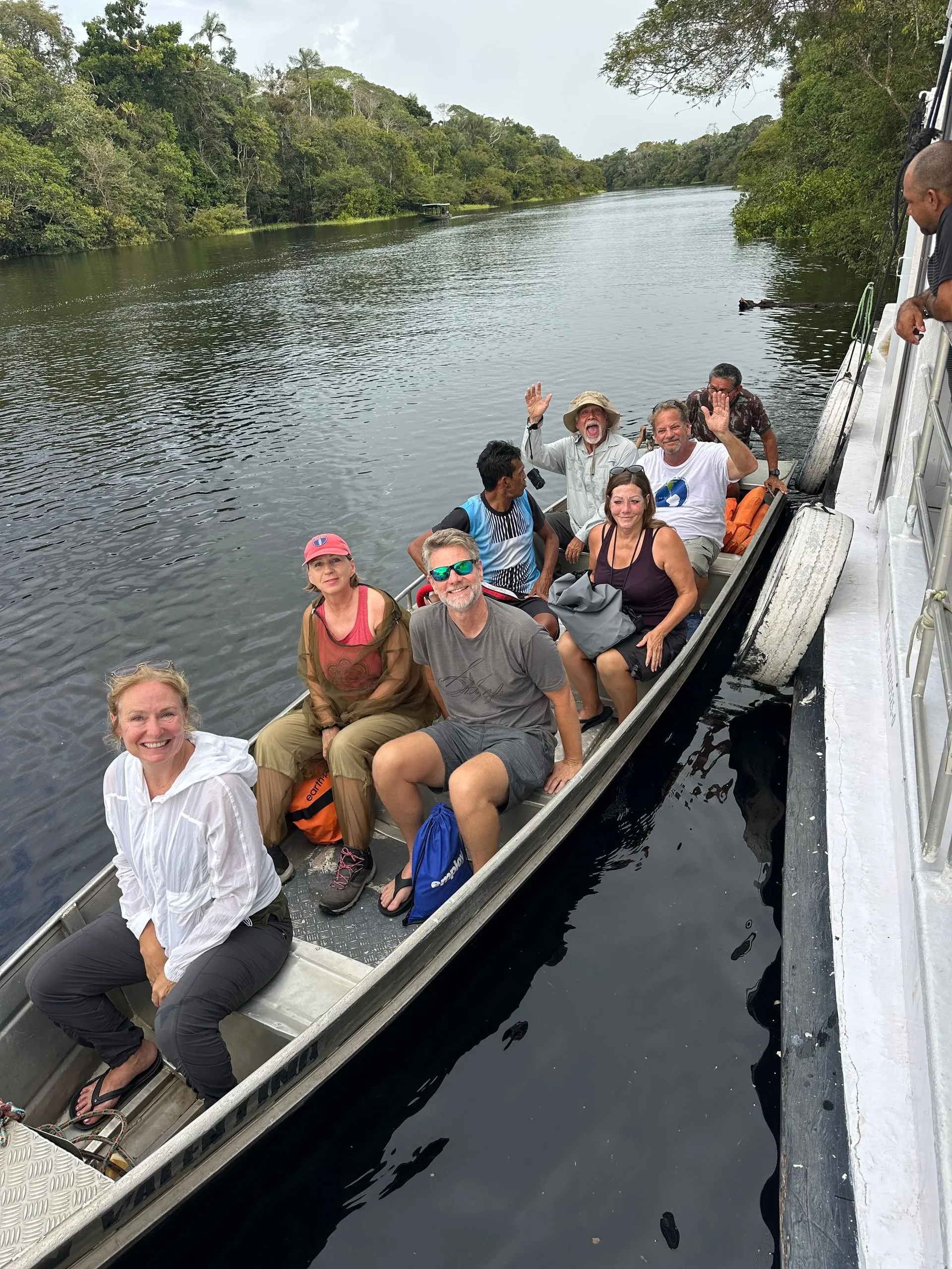 For four days and three nights we explored the various tributaries of the RIO NEGRO. Most were narrow passages like above where we rarely saw another boat. It was so peaceful. We did lots of excursions on the motorized skiff to get deeper into the Rainforest. At dark we would go out with the first mate and guide, who used a strong flashlight to spot eyeballs of critters. We saw baby owls, a snake, caimans ( their version of alligators), lots of noisy birds and bats.
