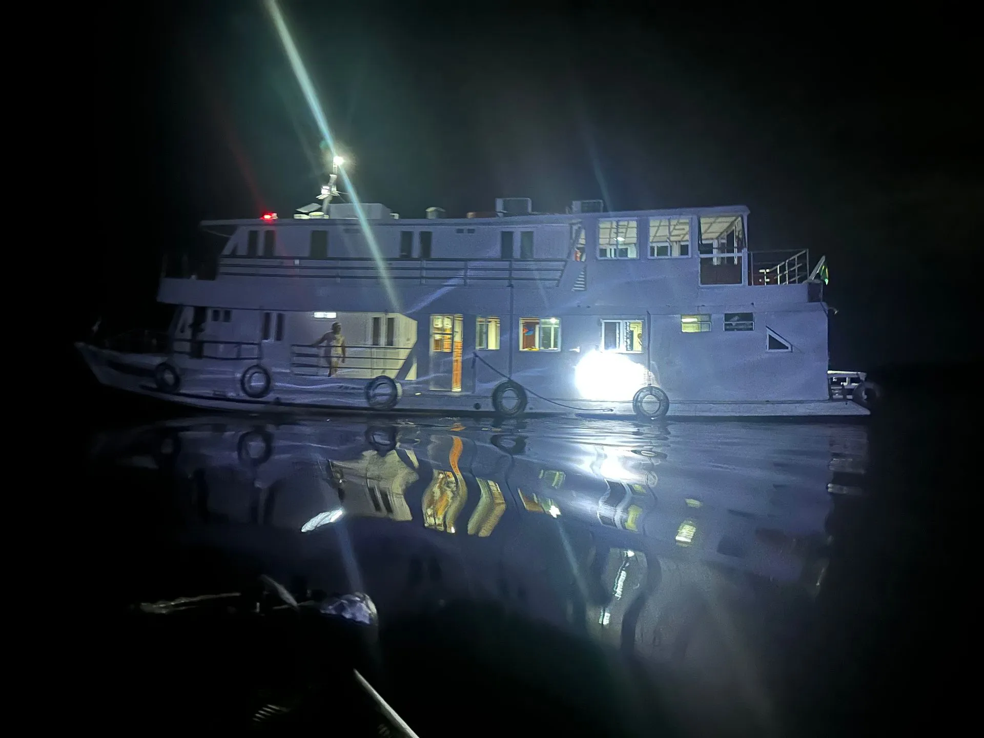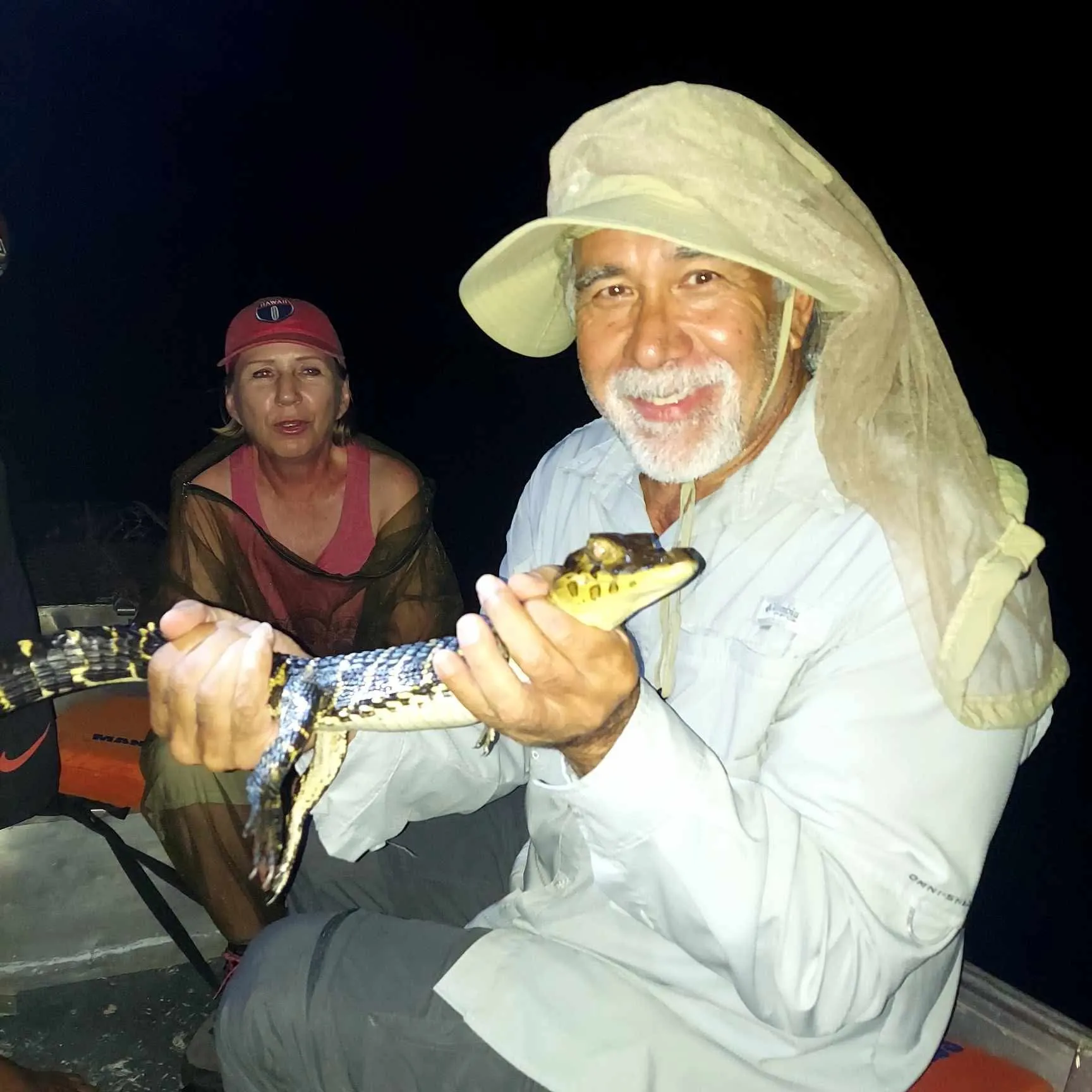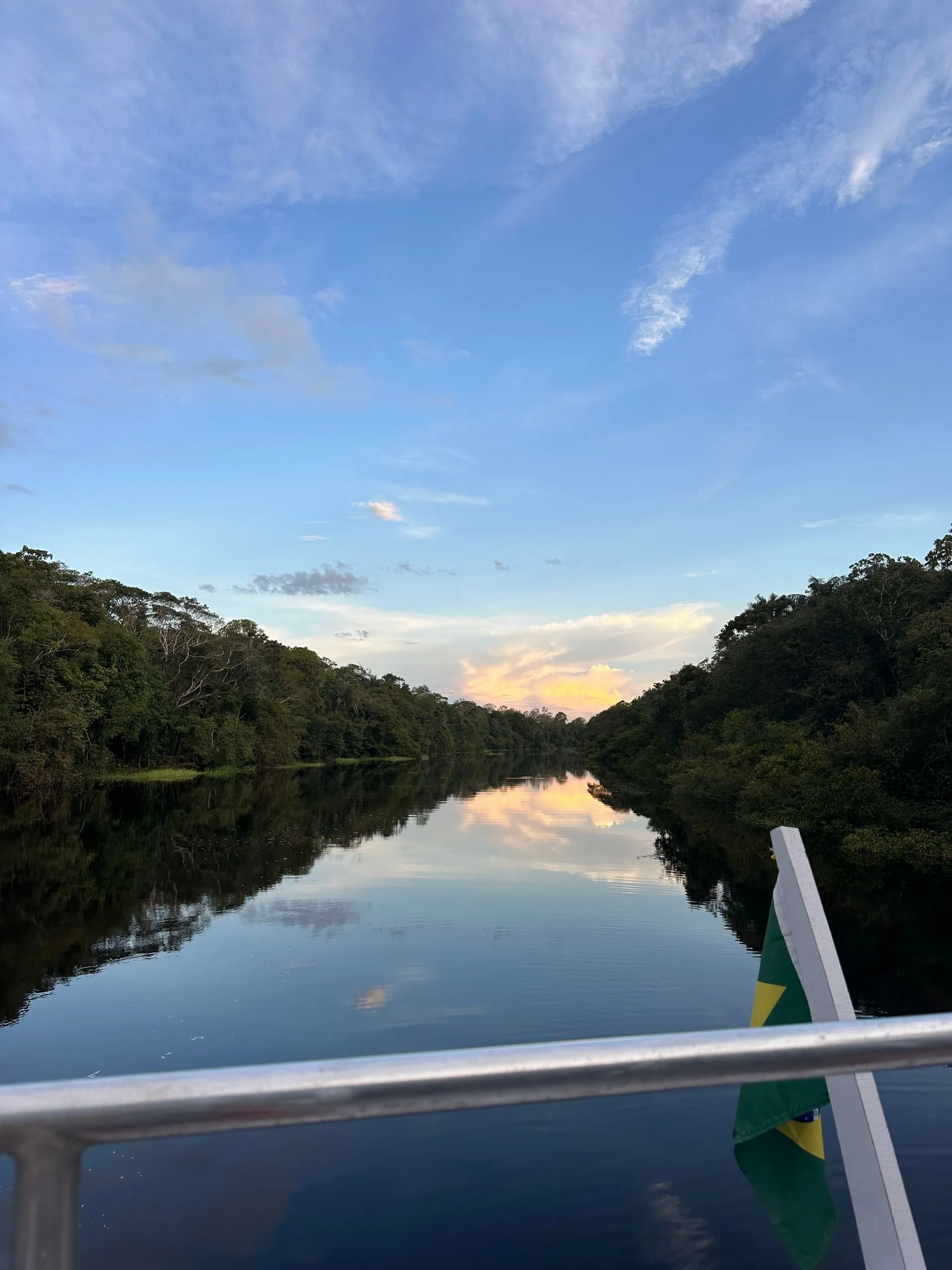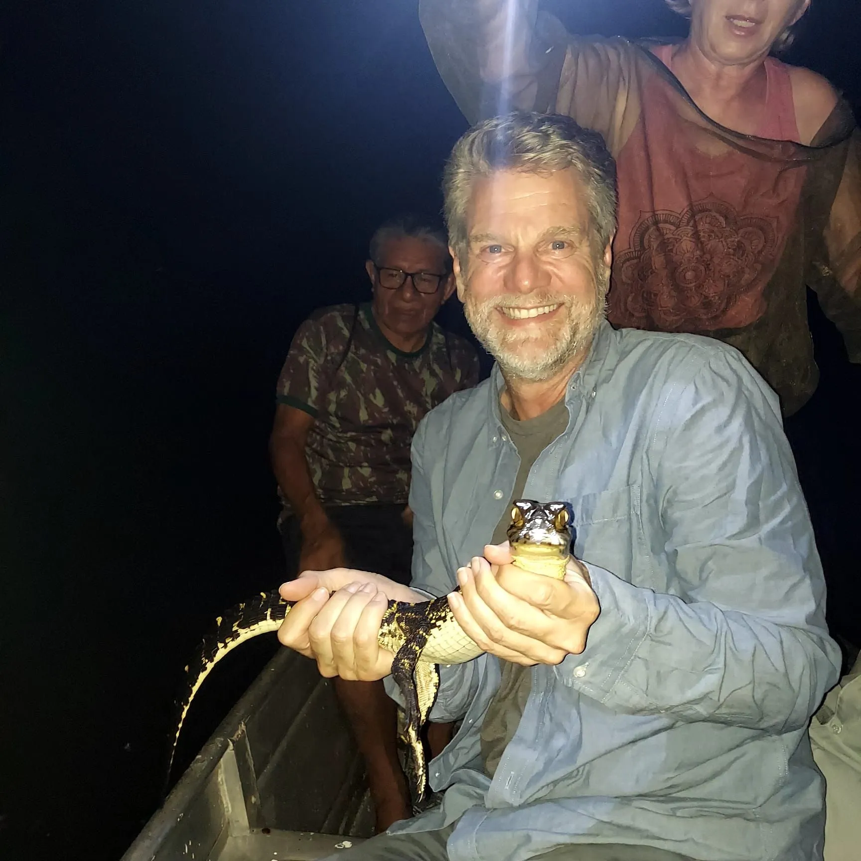 For four days and three nights we explored the various tributaries of the RIO NEGRO. Most were narrow passages like above where we rarely saw another boat. It was so peaceful. We did lots of excursions on the motorized skiff to get deeper into the Rainforest. At dark we would go out with the first mate and guide, who used a strong flashlight to spot eyeballs of critters. We saw baby owls, a snake, caimans ( their version of alligators), lots of noisy birds and bats.