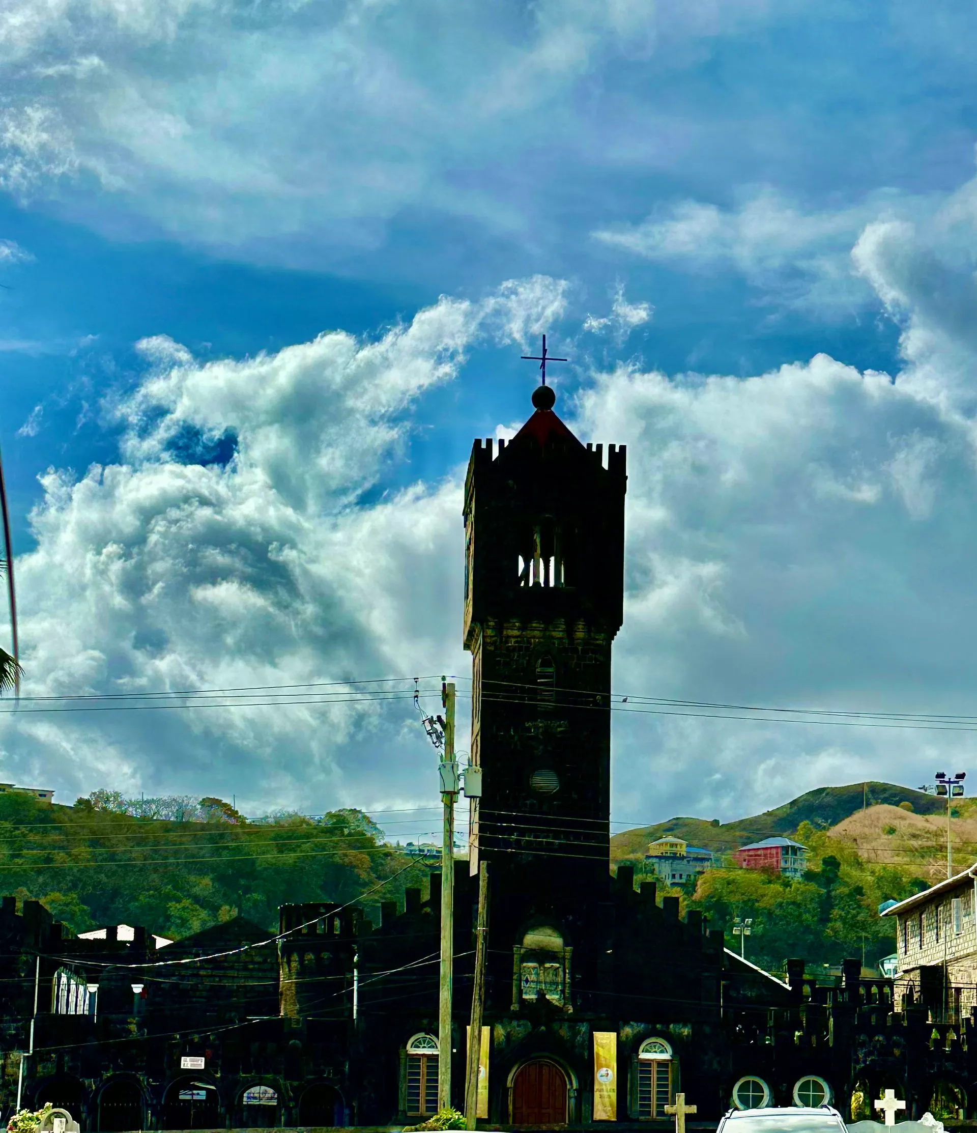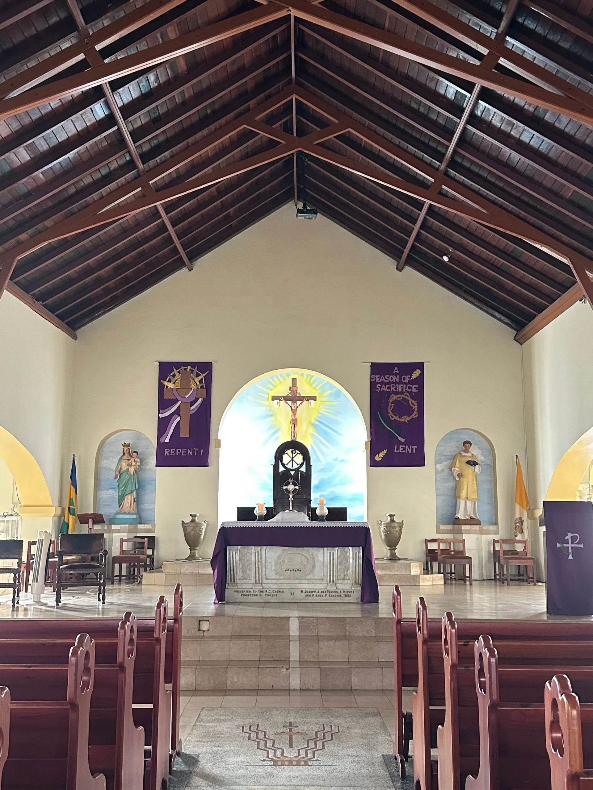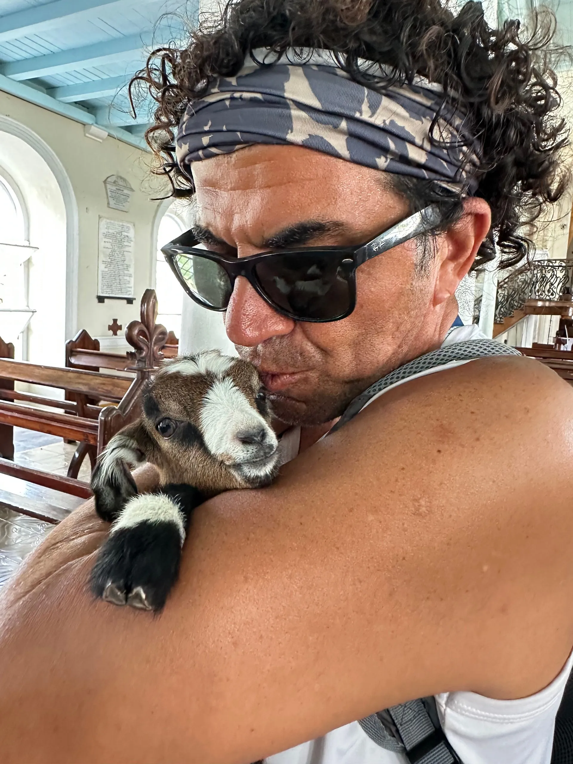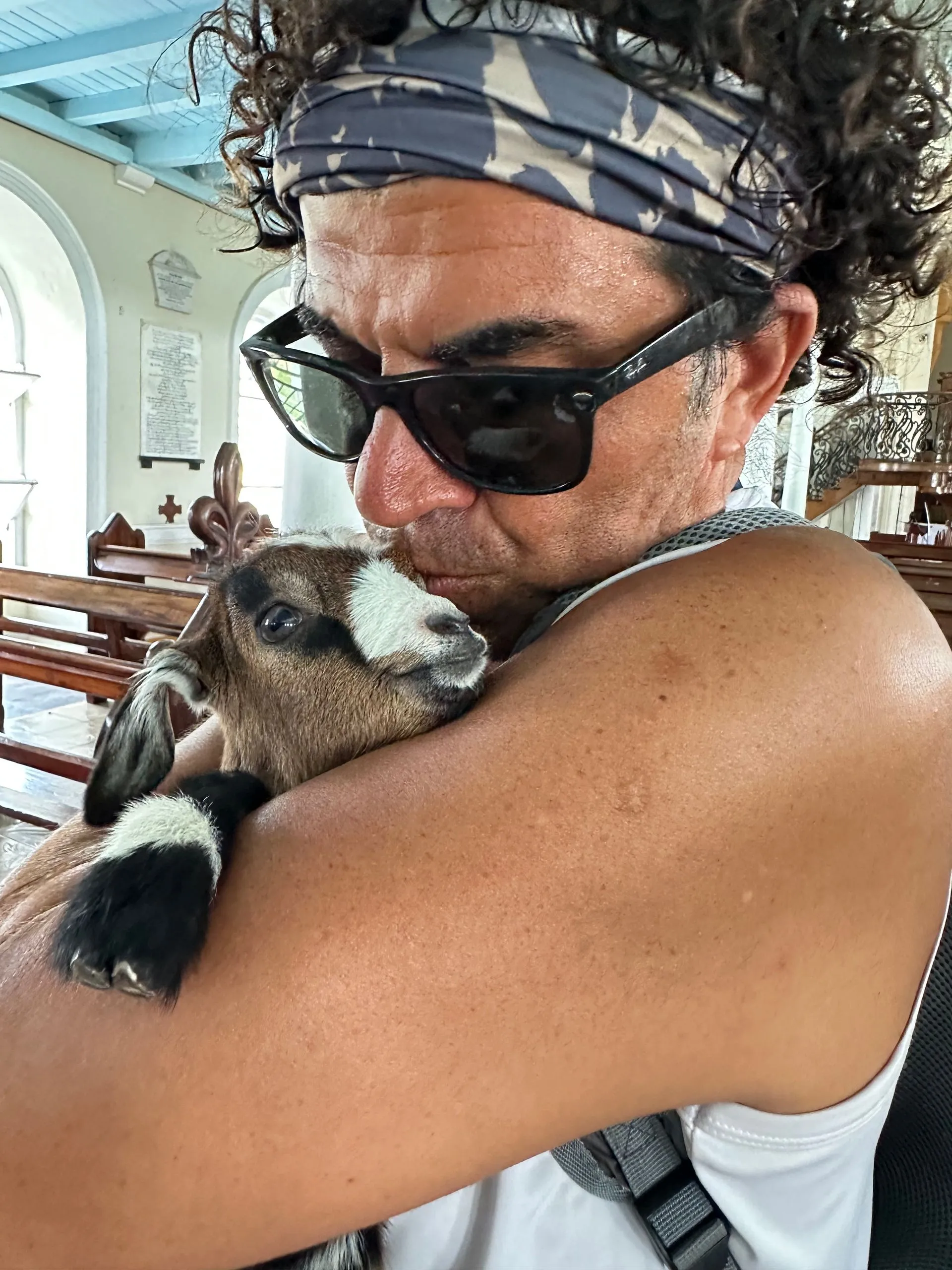 We took a walk around the port town of Kingstown, St.Vincent the second day. Two churches were the points of most interest architecturally. The first church was St George's Cathedral and it was Anglican. The space was bright and open but the highlight was the baby goat ( they call it a Lamb) we encountered there. He was adorable and so cuddly! Scott, Memo and I all took turns holding him!