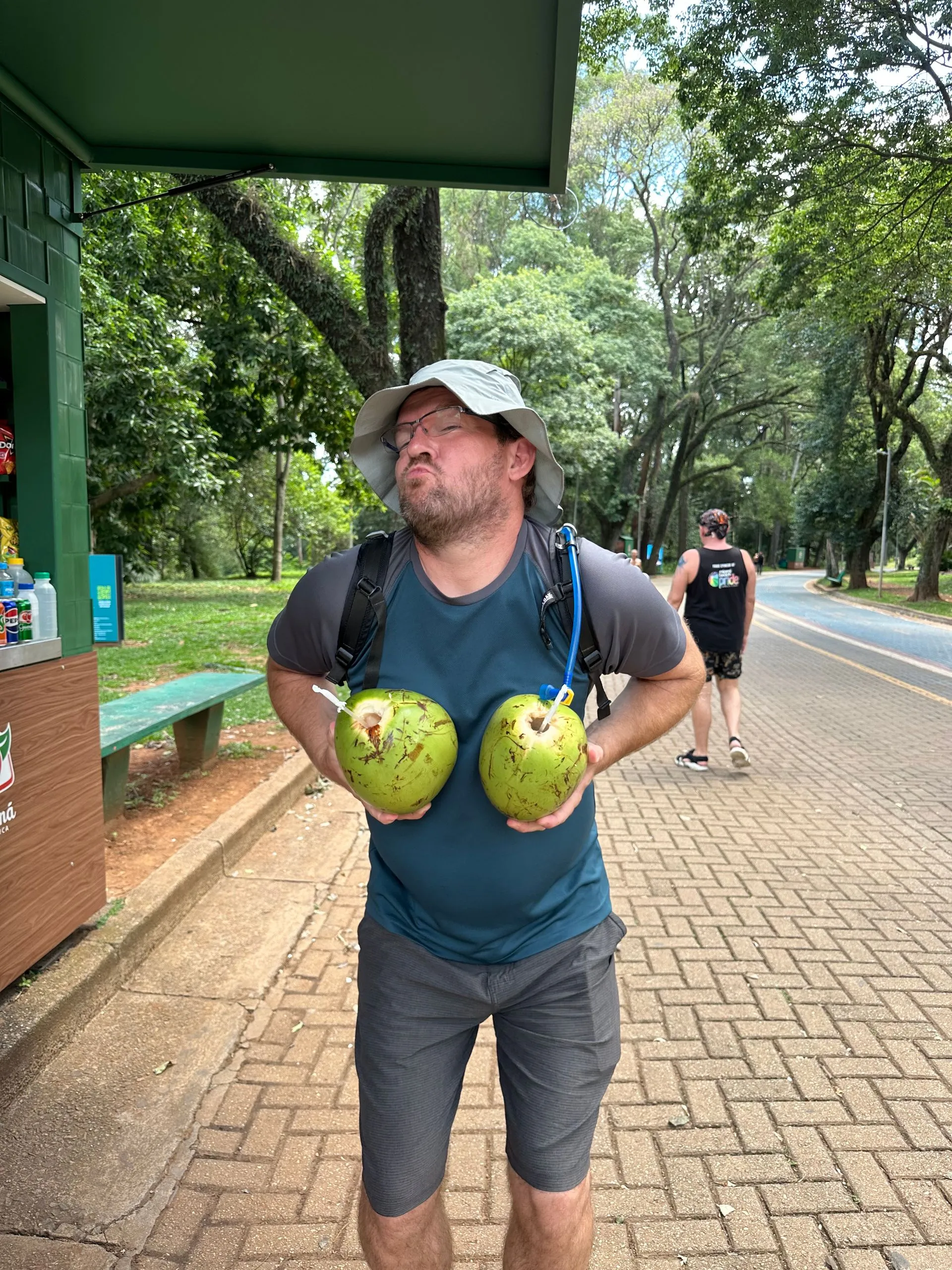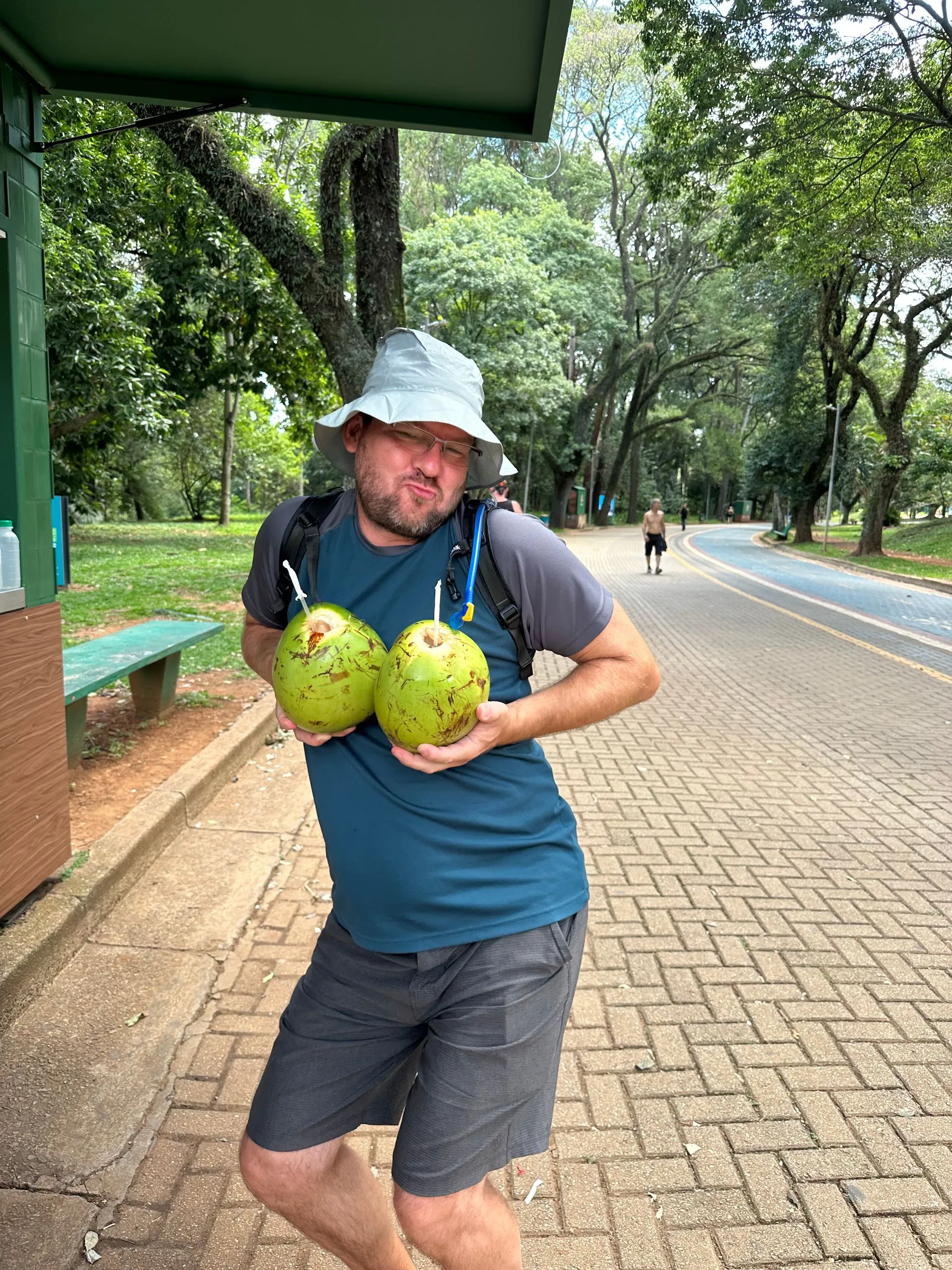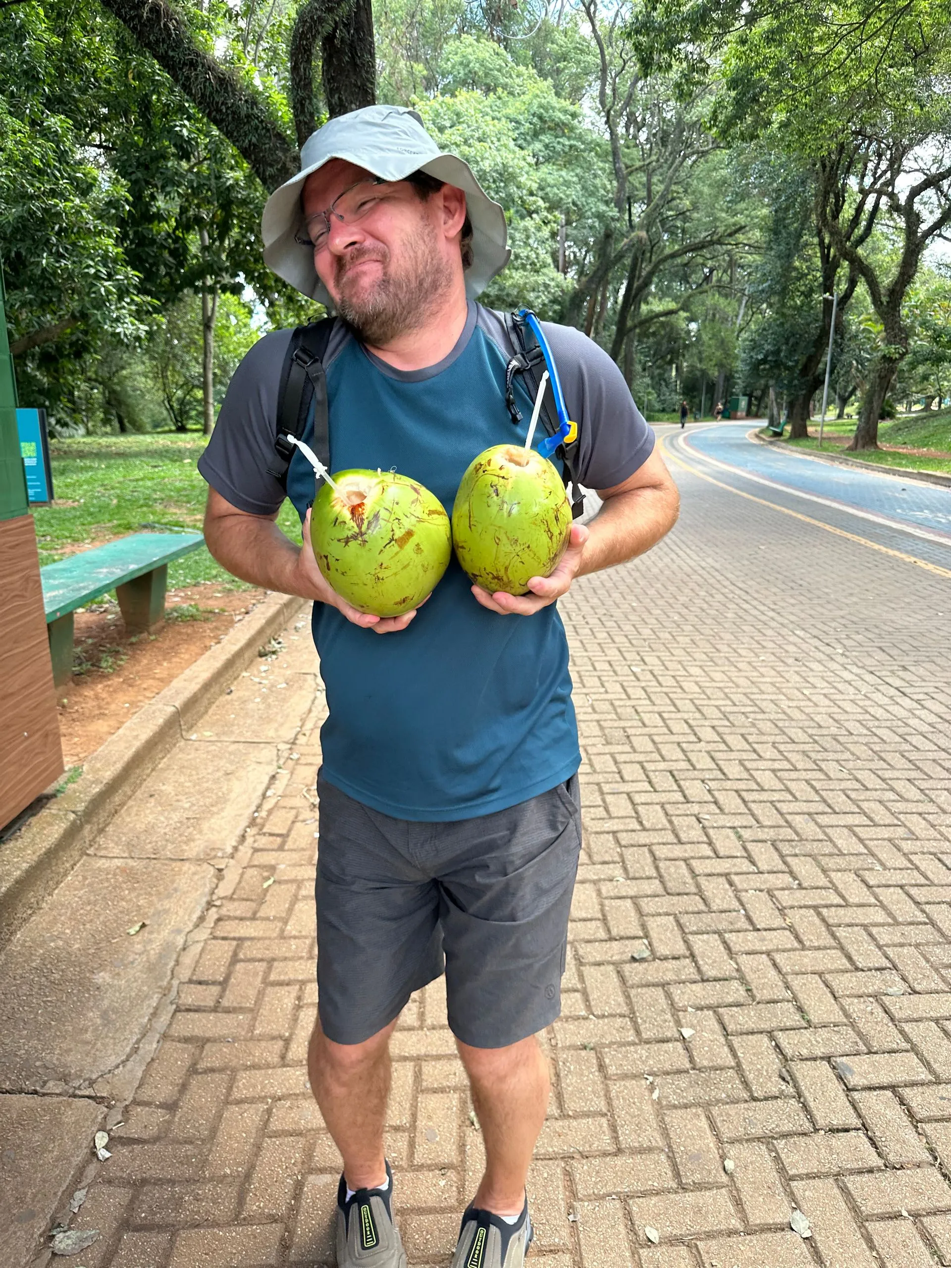 Not knowing when I may ever be in this part of the world again, I made a quick decision without much planning to day trip to SAO PAULO, BRAZIL when we pulled into the port of SANTOS on Monday morning 2/24/25. Scott was of same opinion and he worked out a driver deal, while I started focusing on what we should seek out to see. We also canvased our friends, to see who wanted to join us on this impulsive adventure. Gary and Christy were game, but had commitments till 10:30 am, so we got a little bit of a late start. Also finding our driver, who was a friend of another driver already engaged, took some time in the busy port, but we squeezed into her Fiat ( tight for 3 in back seat) and arrived in Sao Paulo at our first stop by 1pm. Did I mention driver spoke hardly any English, so we had to translate everything with an app. Regardless, first stop was giant park called Parque Ibirapuera similiar to central park in NYC. Gary wasted no time embracing his coconuts and got the party started!