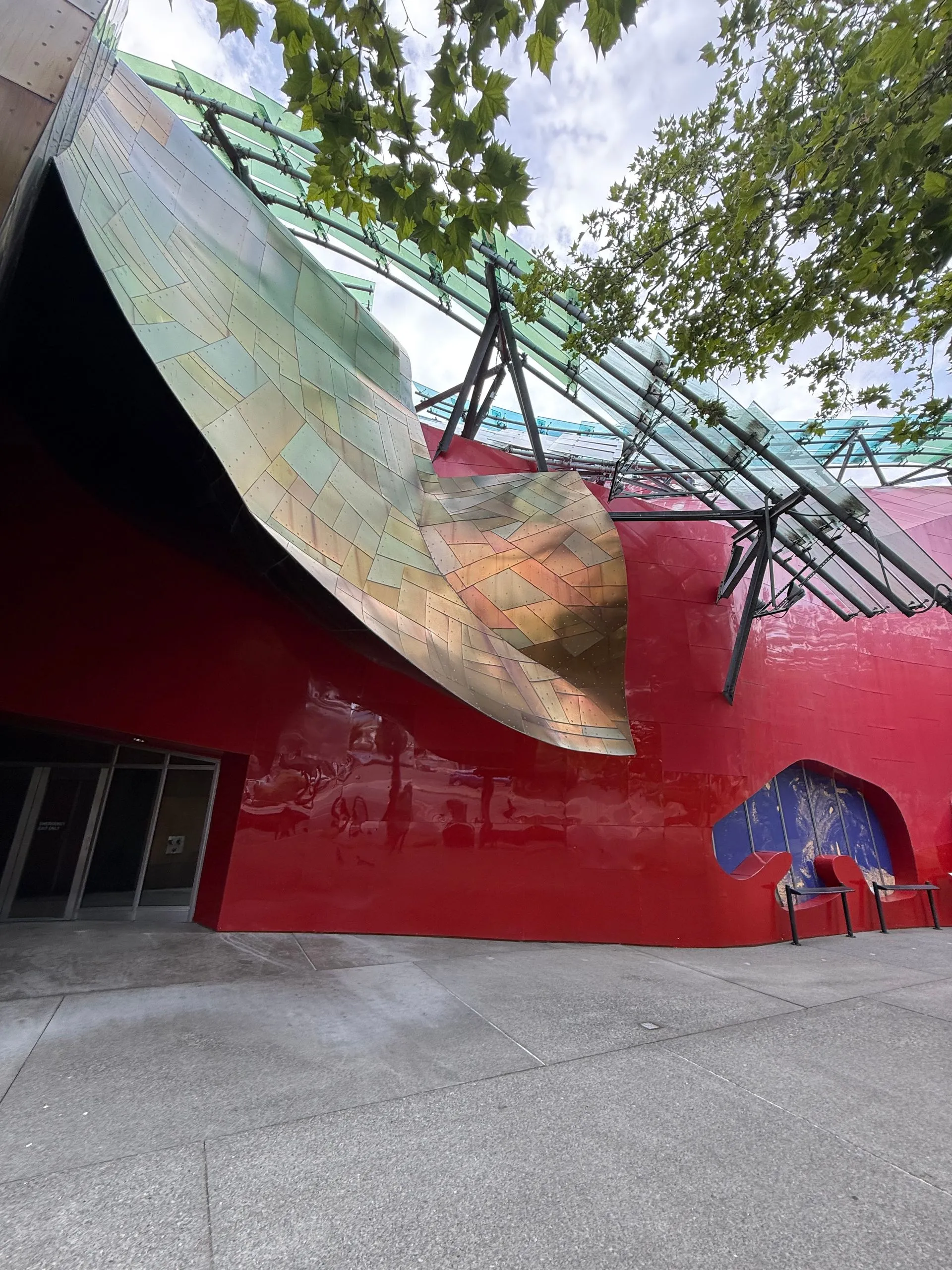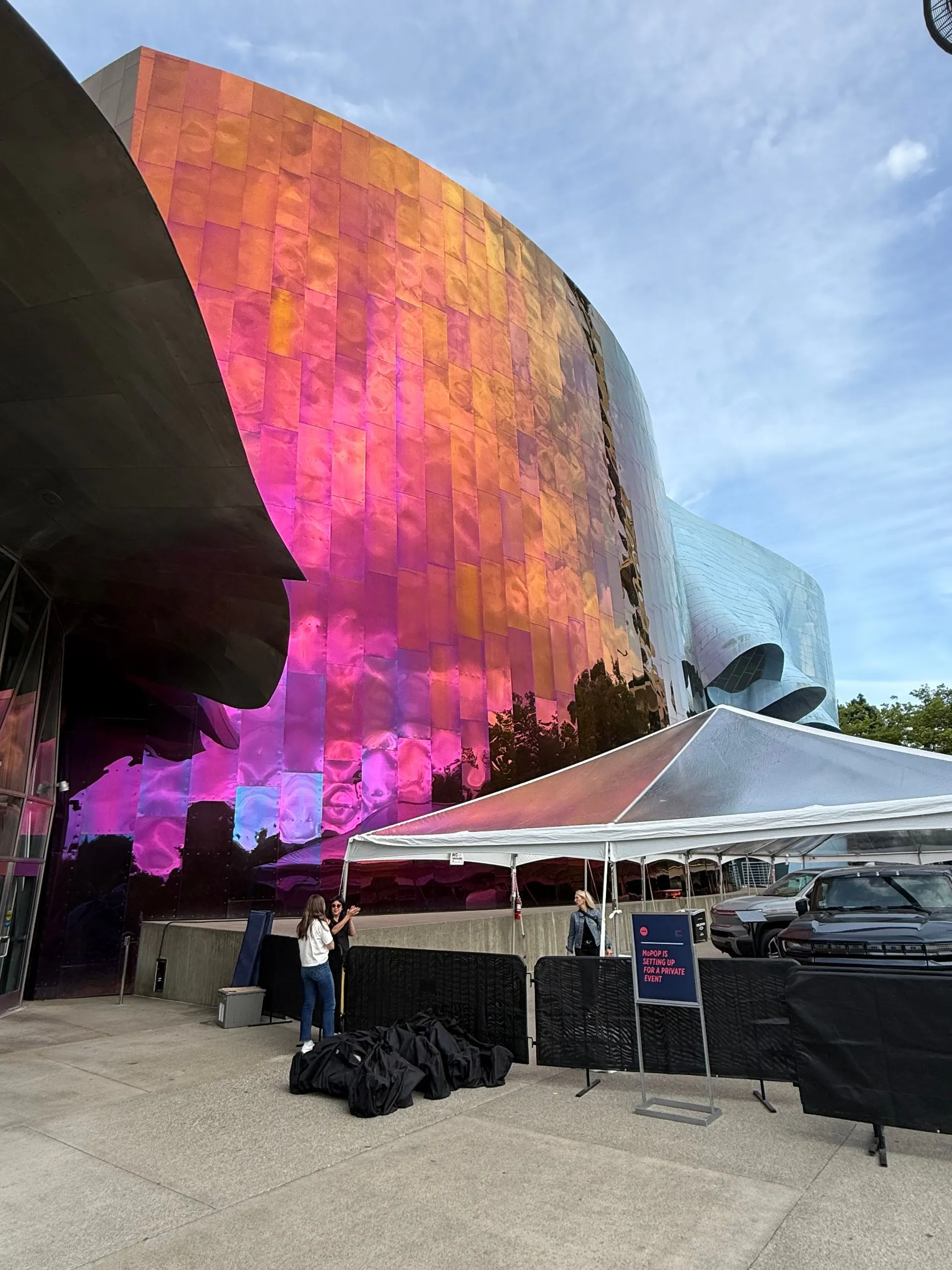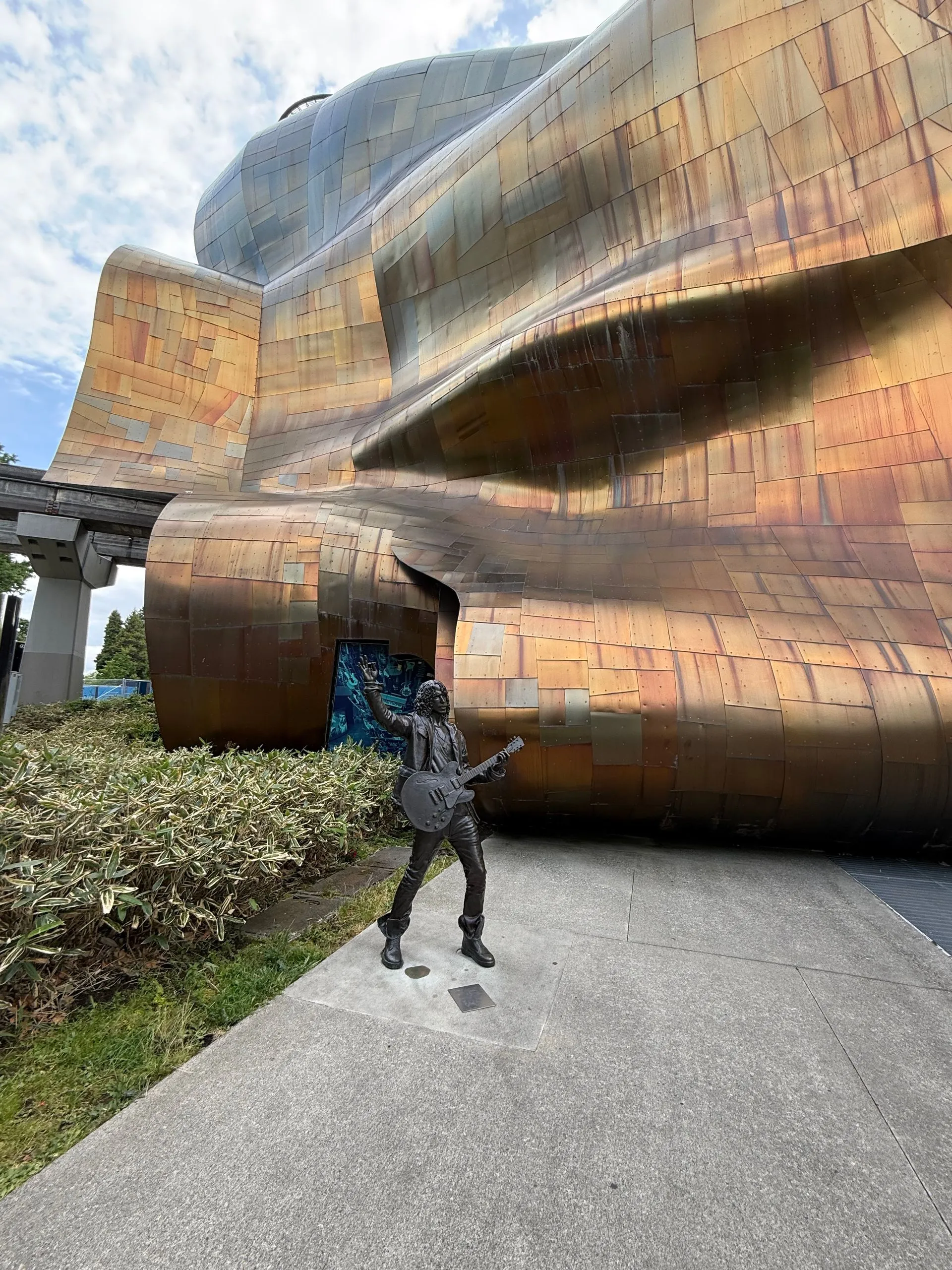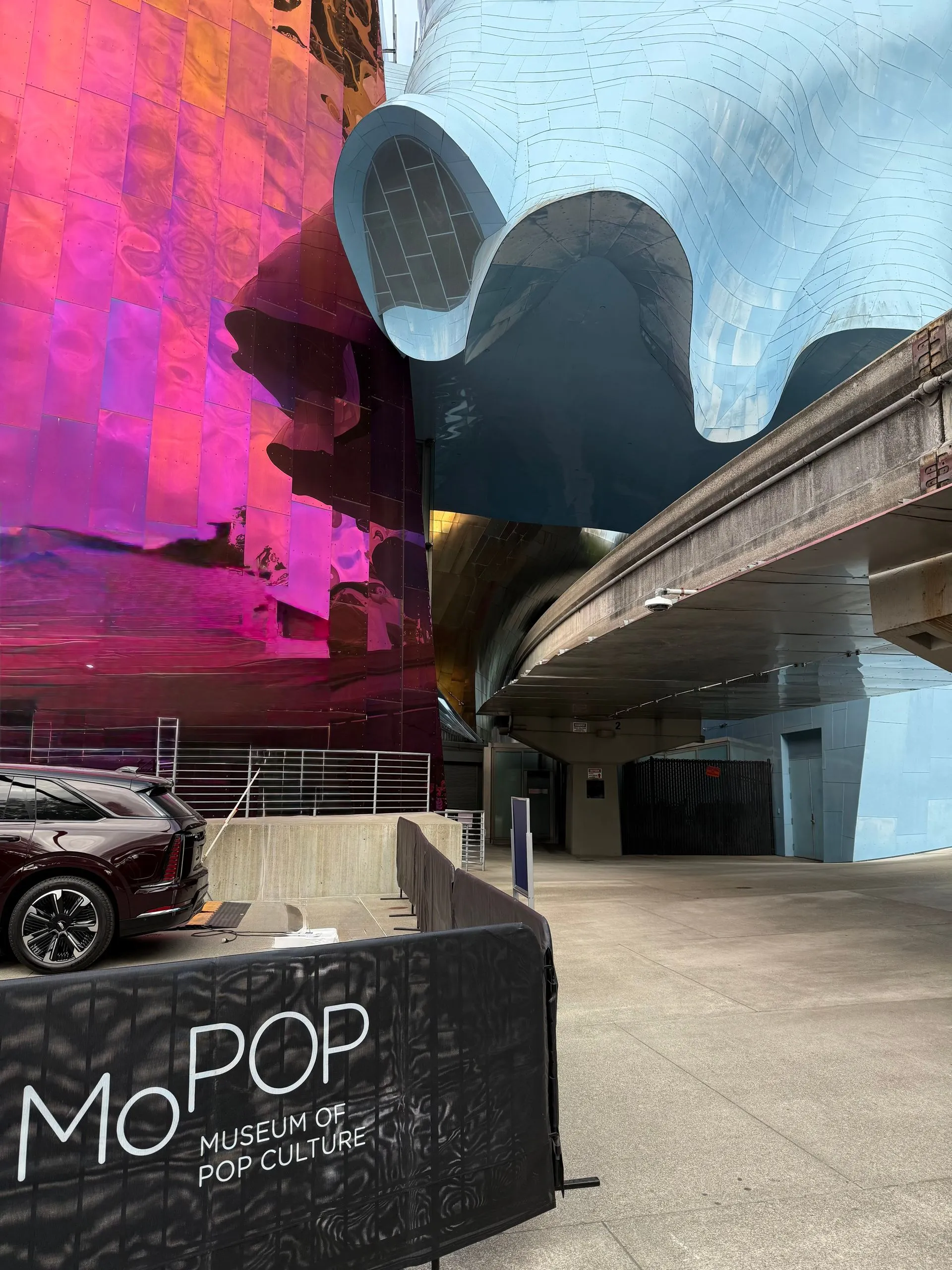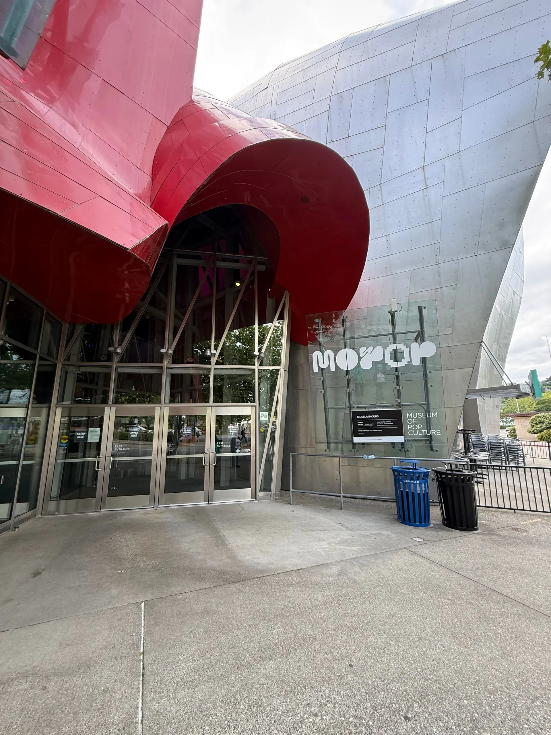 Outside the Museum is a small garden, with more creative pieces and even a small bunny was enjoying! Right around the corner, is the MoPOP Museum, designed by Frank Gehry. Hard to photograph all the unique lines but I liked the finish colors.