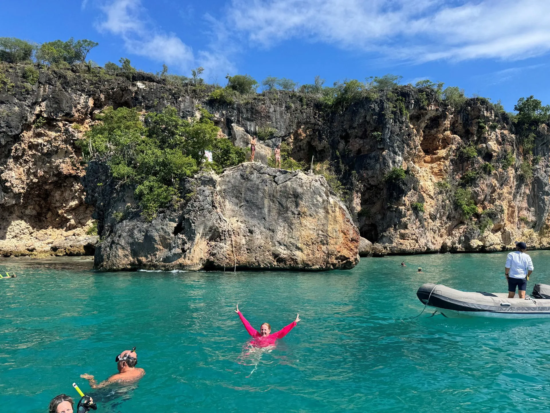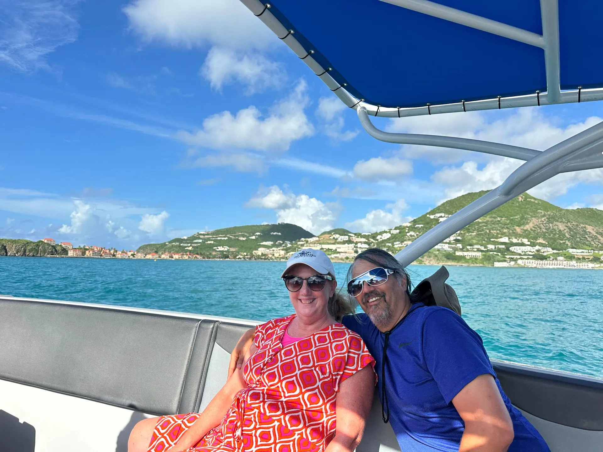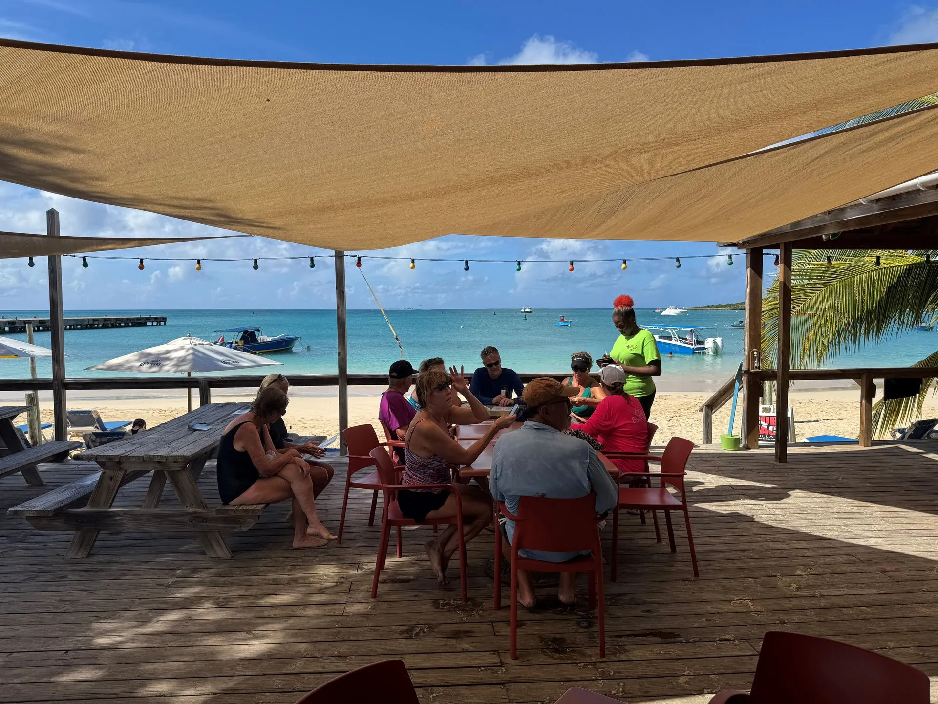 We meet at a marine close to our Ship's mooring and had 7.5 hours to tour. First, we came out of south side of St Maartins, on the Dutch side, past the airport and headed north to Anguilla, across the canal, with French side of St Martins in the distance. We first went to Rendezvous Bay for a swim, then onto Little Bay to swim and snorkel. We had a lunch stop at Roy's on Sandy Ground Beach, and another snorkel and swim stop at Meads Bay. The weather was good with a quick shower hitting while we were at Lunch and again on our ride back to the marina. We stayed a little longer at each stop than was planned because Shoal Bay, the furthest out destination was experiencing high winds and waves.
