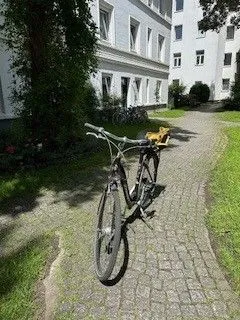 Today we had to do some exercise to work off the bakery treats, so we soaked up the sunshine, while biking into the Hamburg Woods. Tom hooked me up with a bike, complete with a basket and off we peddled. Hamburg has very well designated, wide bike lanes all over. Biking is a major method of transport, all around the city. Today's trek was truly something out of Hansel & Gretel. We rode through this neighborhood filled with A frame cottages and perfect little gardens. I need to go back, just to get pictures. But today we were all about the cycling. It wasn't until we got deep into the Woods, that we dismounted and strolled some. It looks like they kind of groom the forest floor, by gathering up the underbrush and placing it in dug out, random pits placed throughout. Guessing it would help contain any fires?