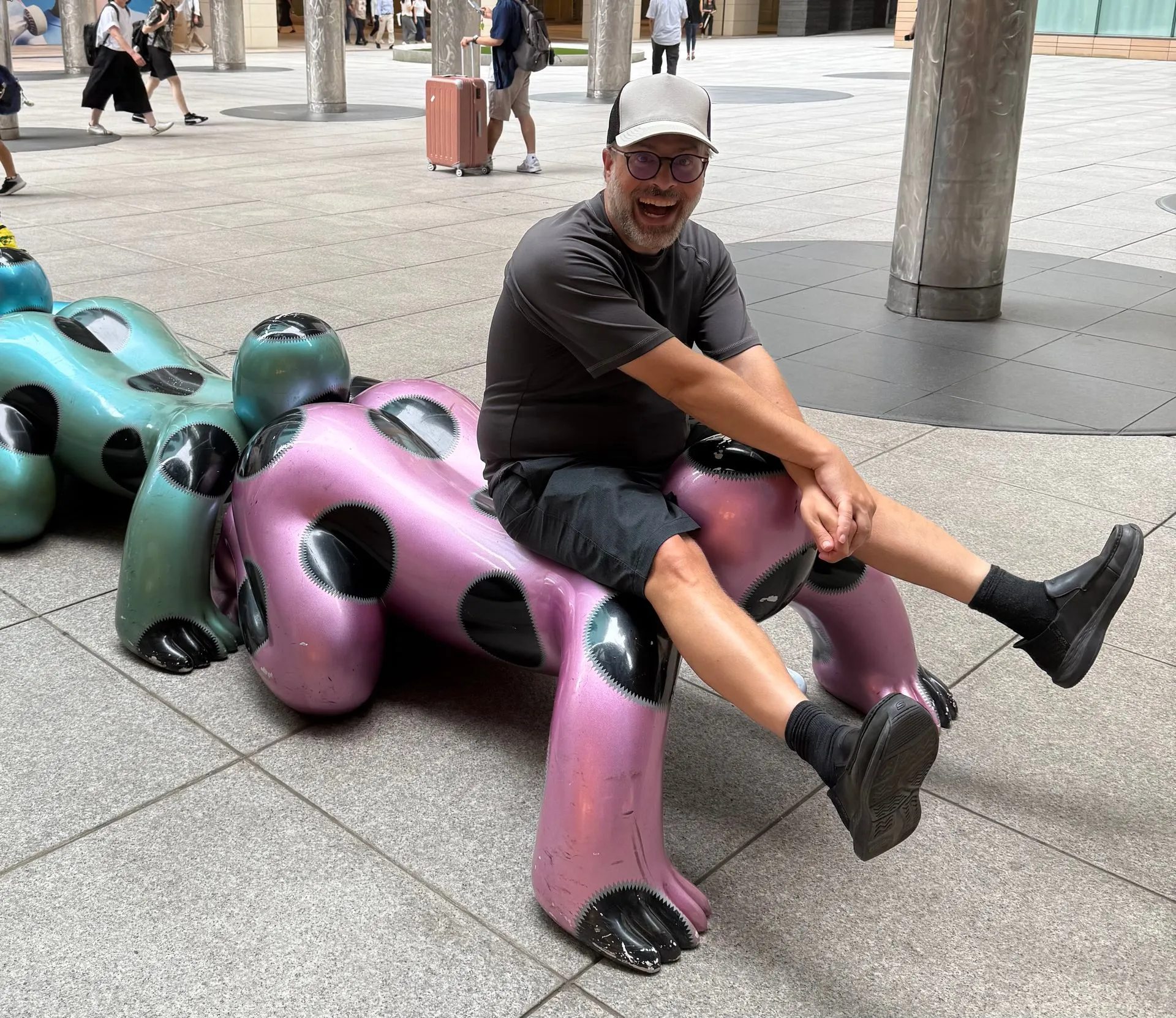 Next Sherrie Bob and Sarah left us for their appointment at Team Borderless and Bosco and I went with guide to check out the tribute to Hayao Miyazaki, a famous director, at the Nippon Television Headquarters. They have a Giant Clock with his most notable characters featured. We also had fun at a neighboring plazas Human Centipede statue.