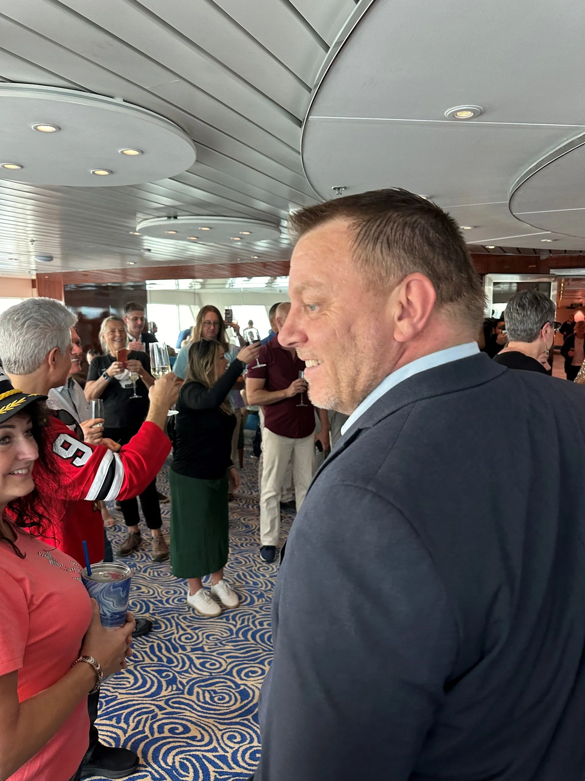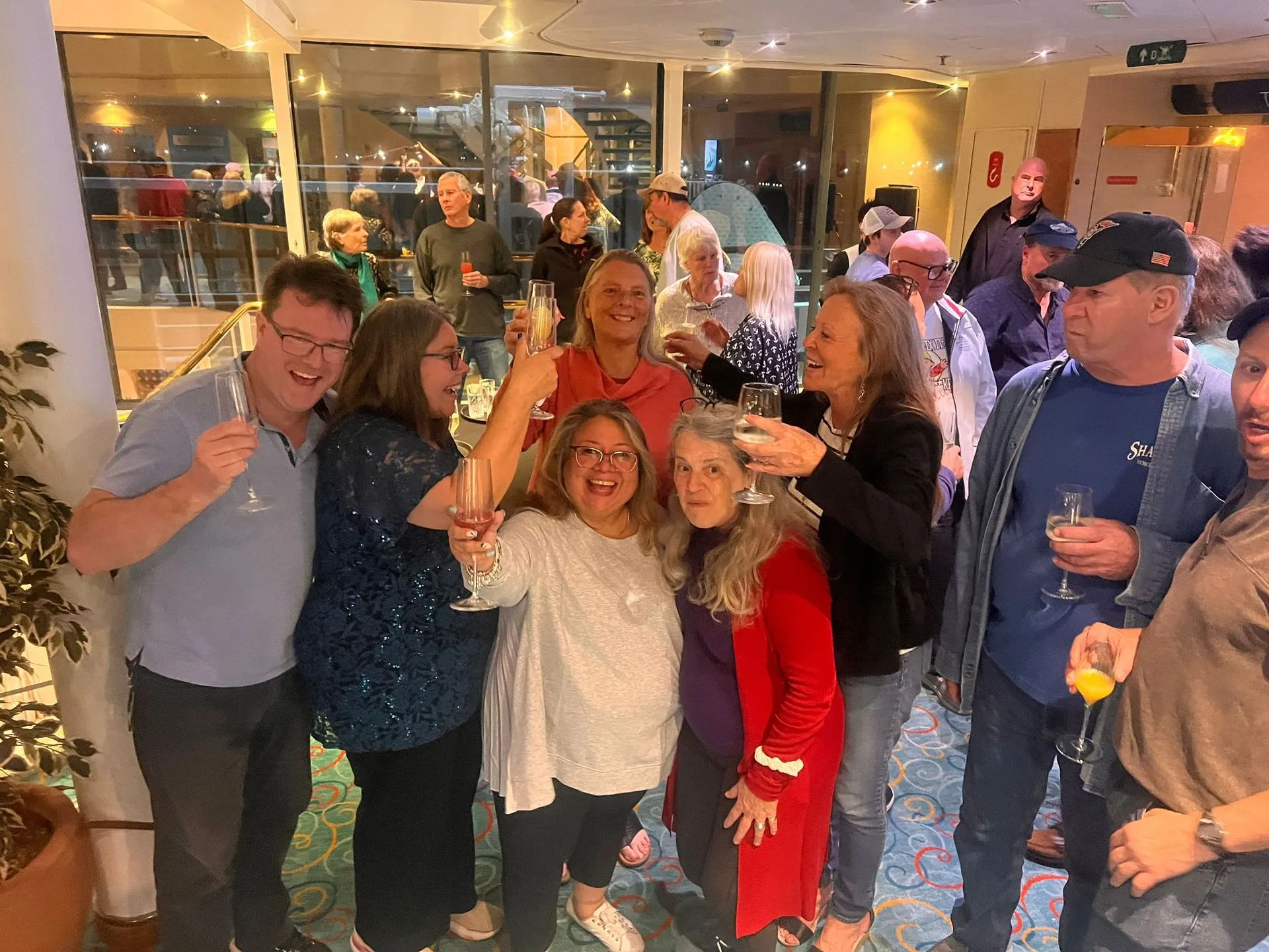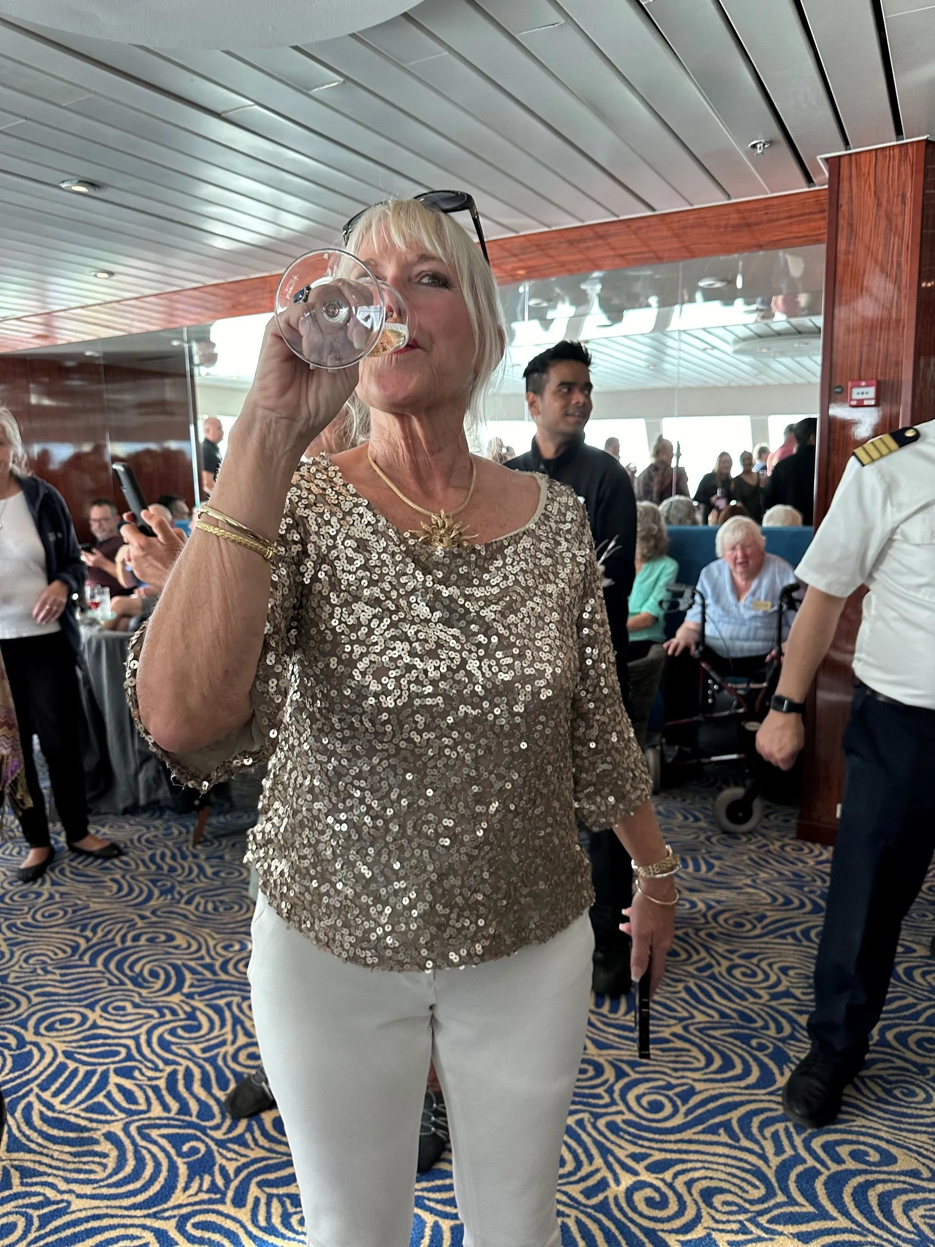 Monday, all us Duckies (nickname of cruisers!) met at the Belfast Cruise terminal, in the late afternoon. There was almost as much press there, as the roughly 100 residents, waiting to embark. After a few false starts and trepidation, we got the clearance, all erupted in joy, cheers and hugs and we were onboard the Ship by 9 pm. They greeted us with champagne and snacks. We put our carry on luggage in our cabins and had our first safety drill. Then dinner and dancing and we sailed away from Belfast at 11pm.