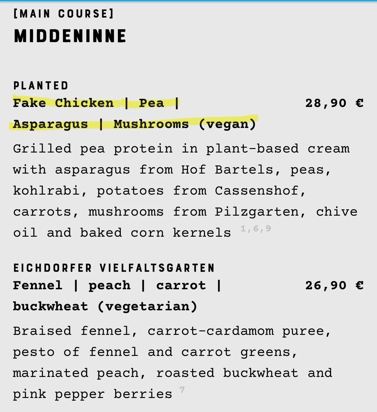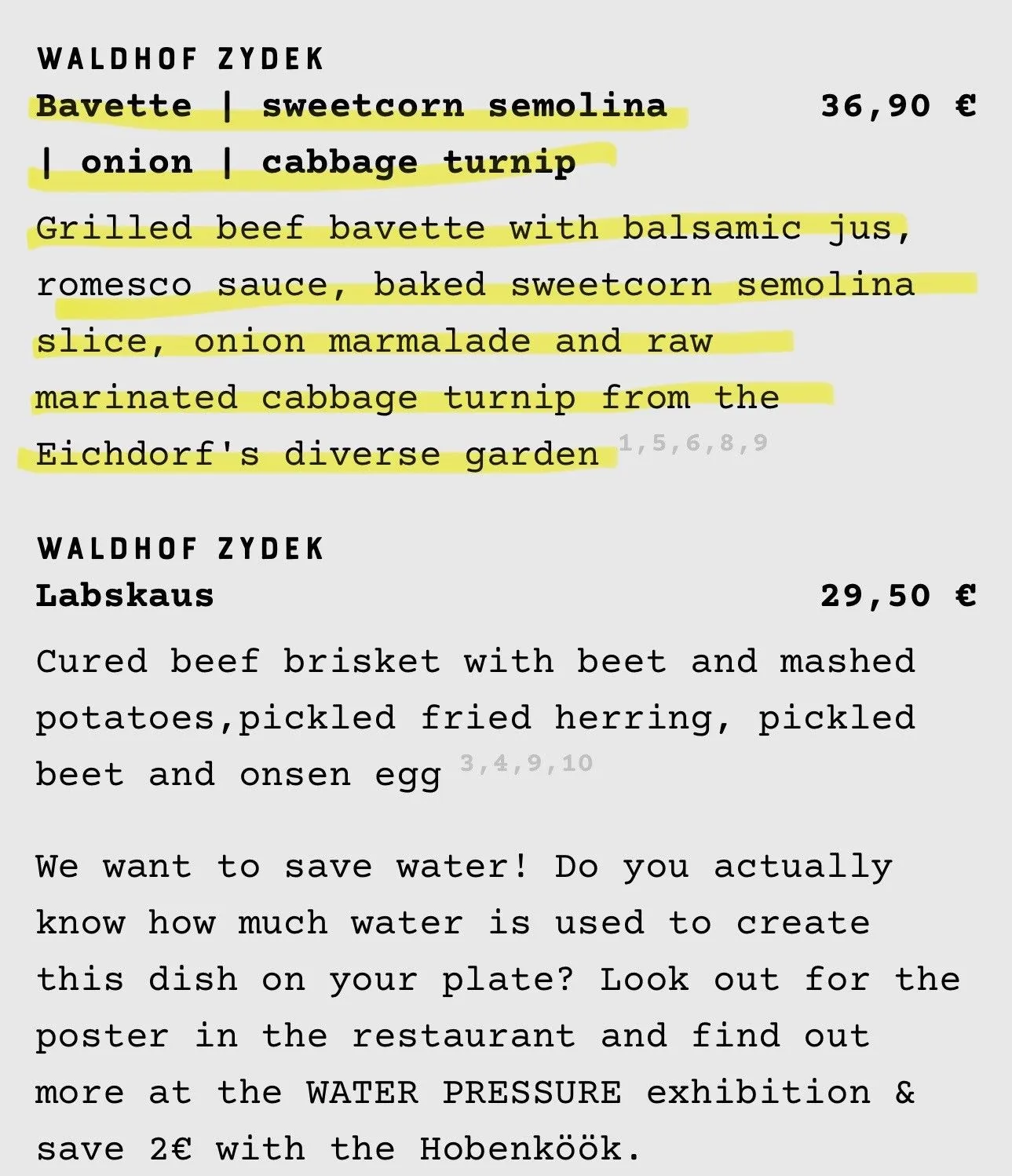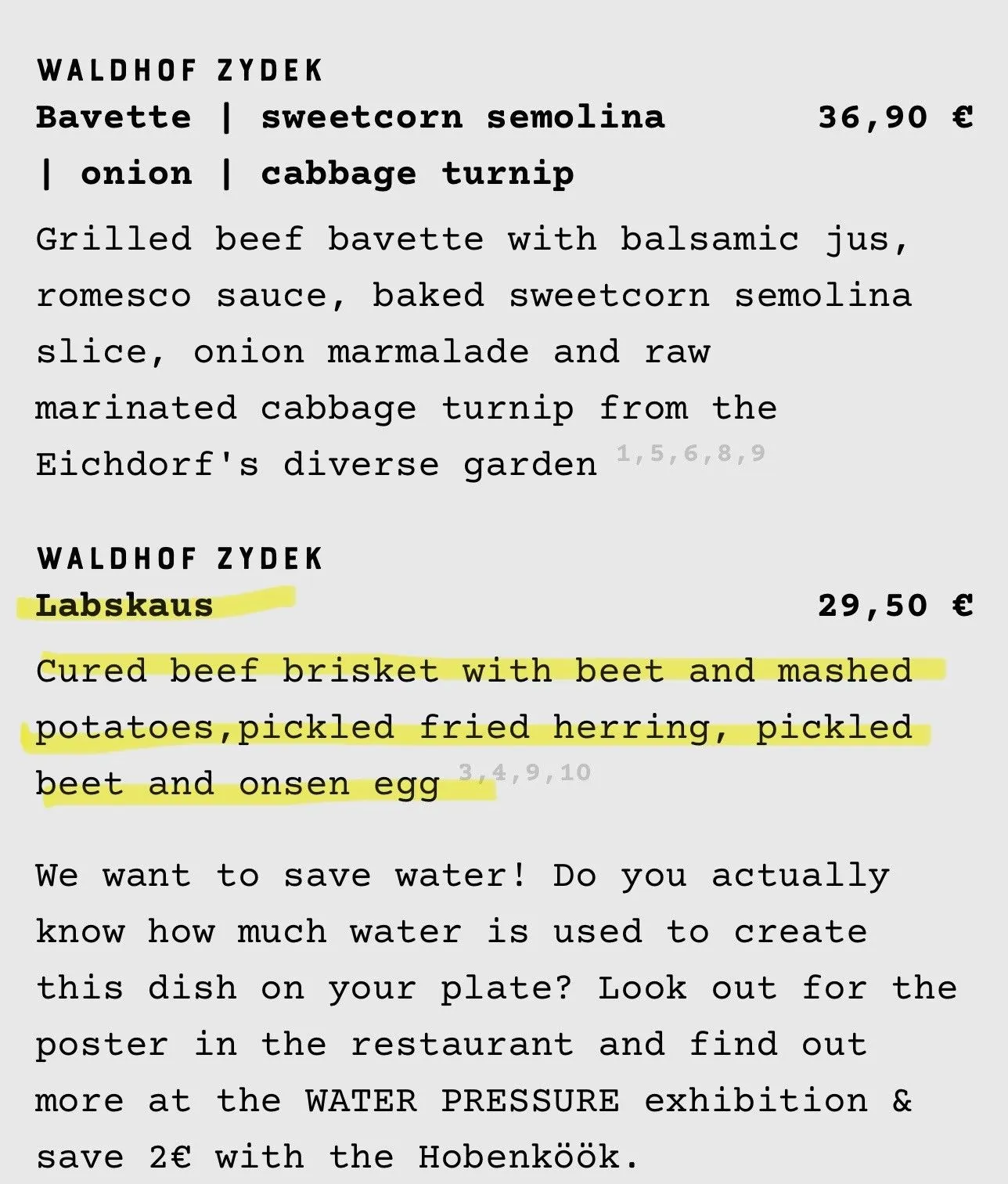 Hobenkook is a restaurant and marketplace in a former warehouse that focuses on local & sustainable producers. They have an open kitchen and offer a menu focused on zero waste and water reduction dishes. They offered just 8 starters, 5 mains and 3 desserts on Saturday night but each dish is loaded with unique ingredients. For all my foodie friends, below is the menu - they had English translations on their website - thank goodness - as food preparedness can tend to get lost in translation.