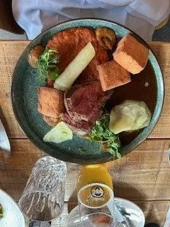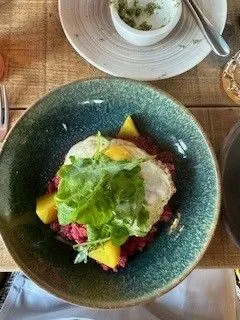 I asked Stephan if he would find us a good restaurant to try out Saturday night, after our Chocolate tour. The task was a bit tricky because it was an extremely busy night in Hamburg being the weekend, summer and tons of extra visitors in town due to Euro Cup 2024. But he rose to the task and followed up on information he had seen prior on this little gem. He even made a reservation, which is a big deal for this German! Hobenkook is off the beaten trail, in the Lohsepark part of the City, just over a canal or two and a fifteen minute walk from the chocolate tour. The neighborhood reminds me of the Fishtown vibe in Philly, with lots of trendy apartments and condo's, converted warehouse and antique reclamation shops.